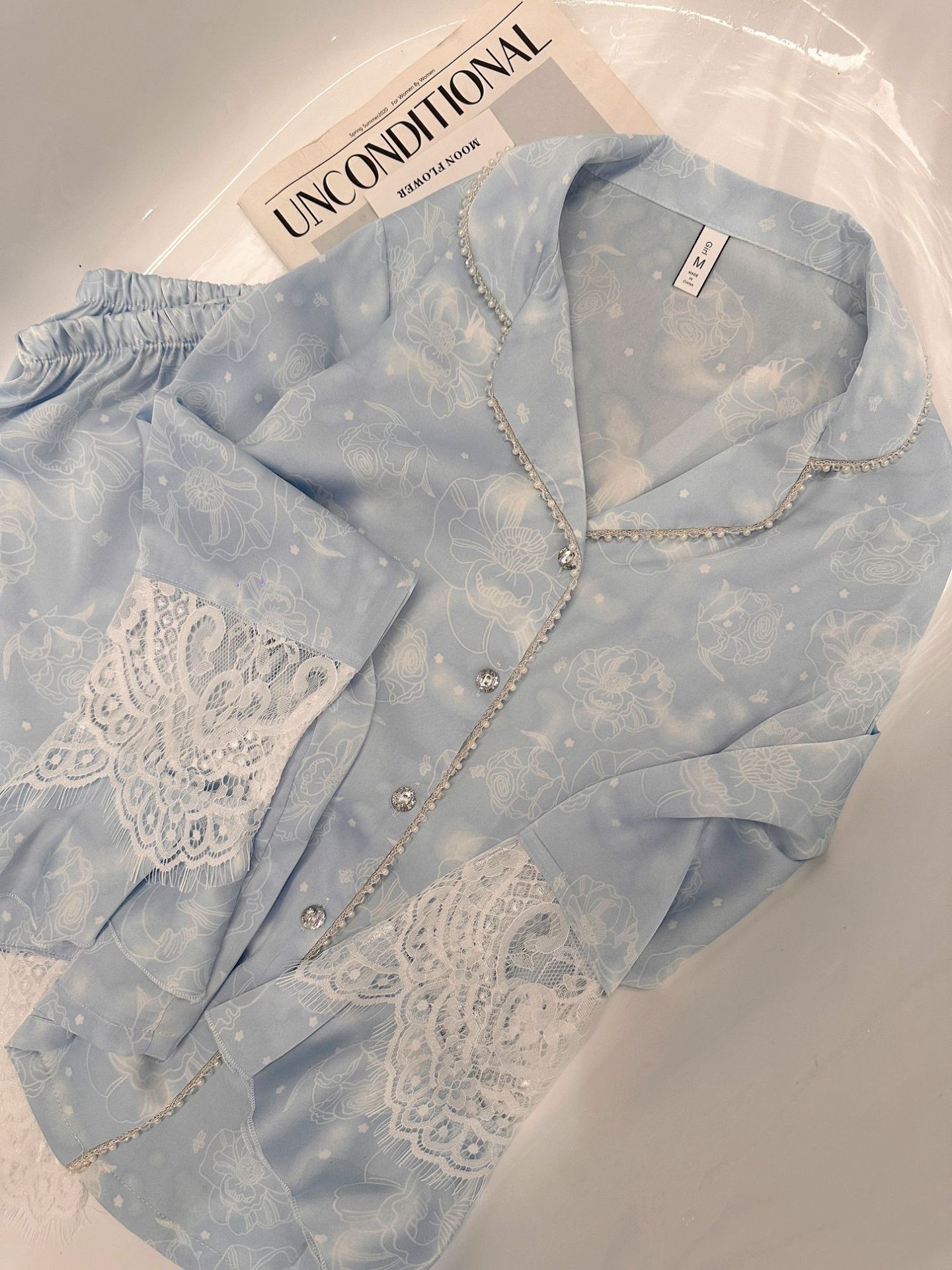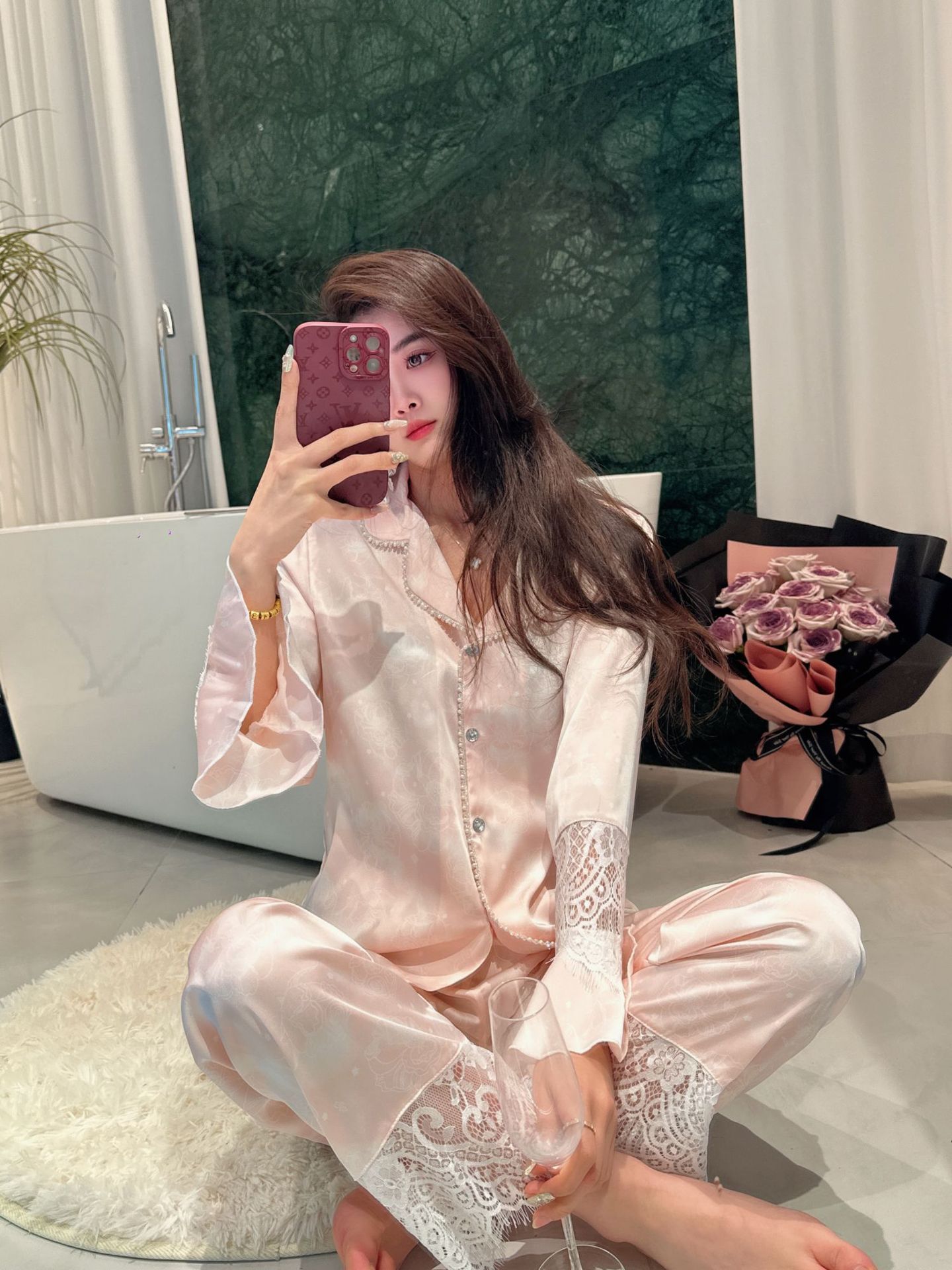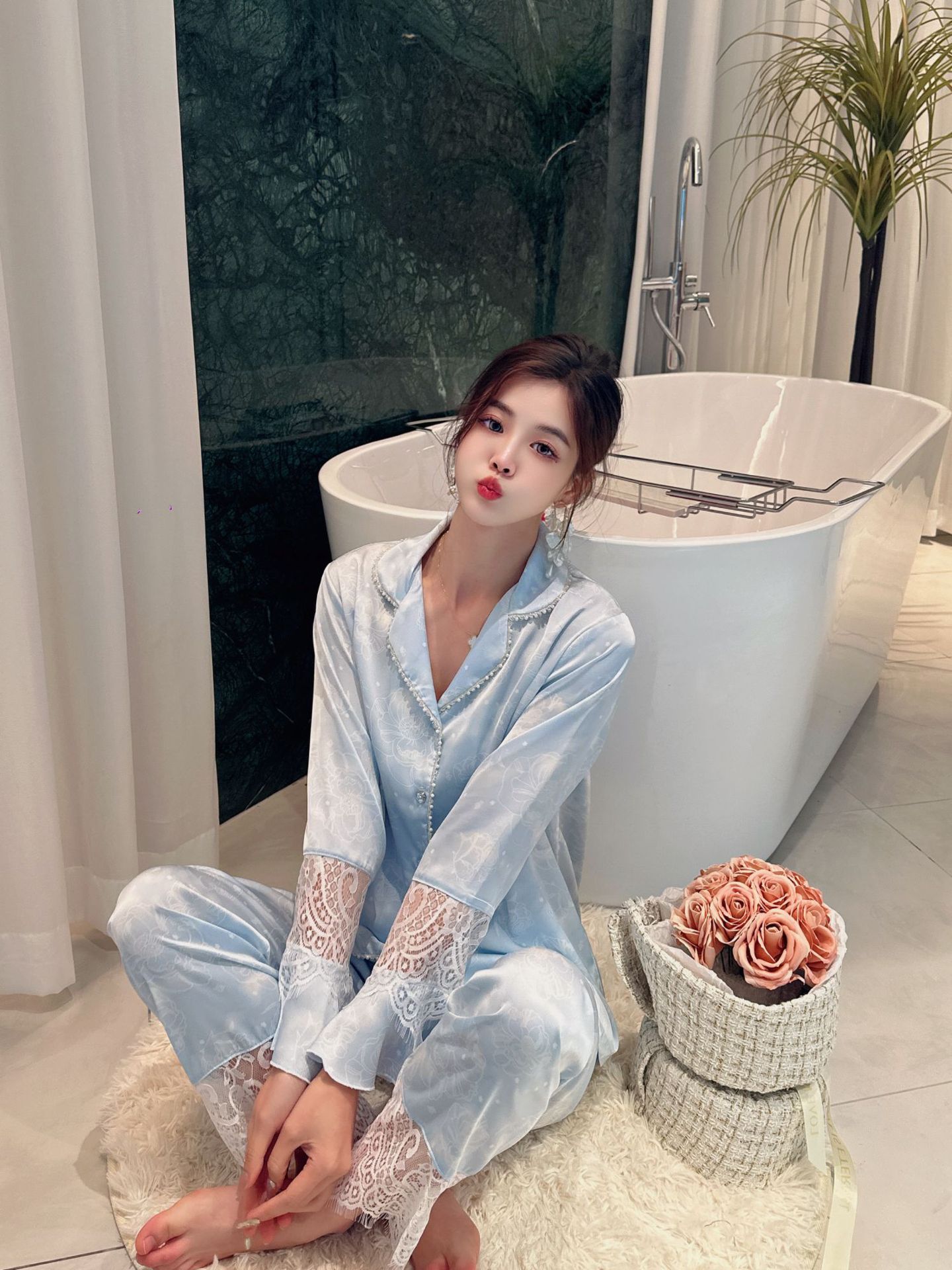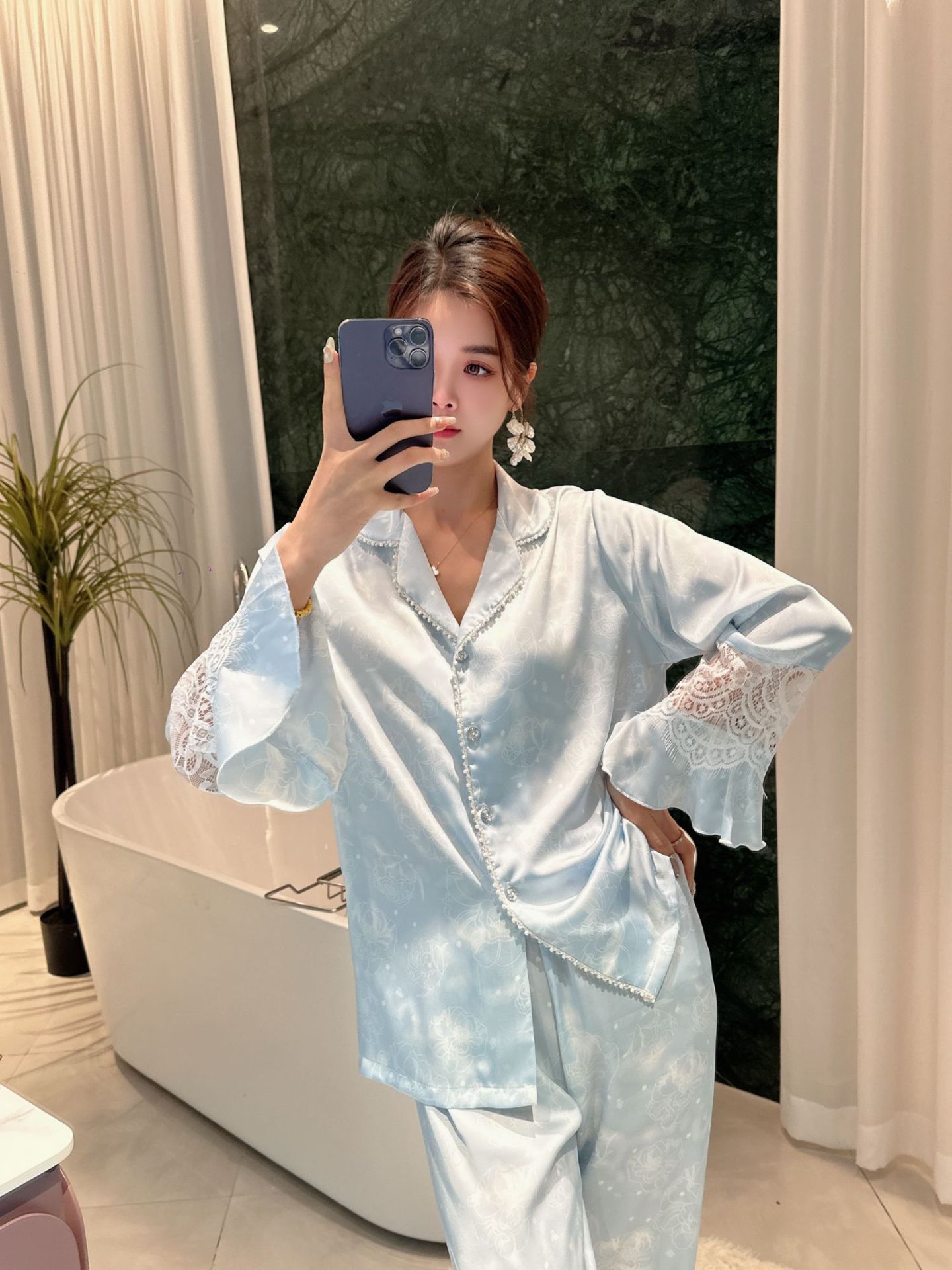 여성용 아이스 실크 잠옷 세트 봄 여름 비즈 레이스 홈웨어 긴팔 얇고 통기성 좋으며 외출 가능 편안함스토어 가기