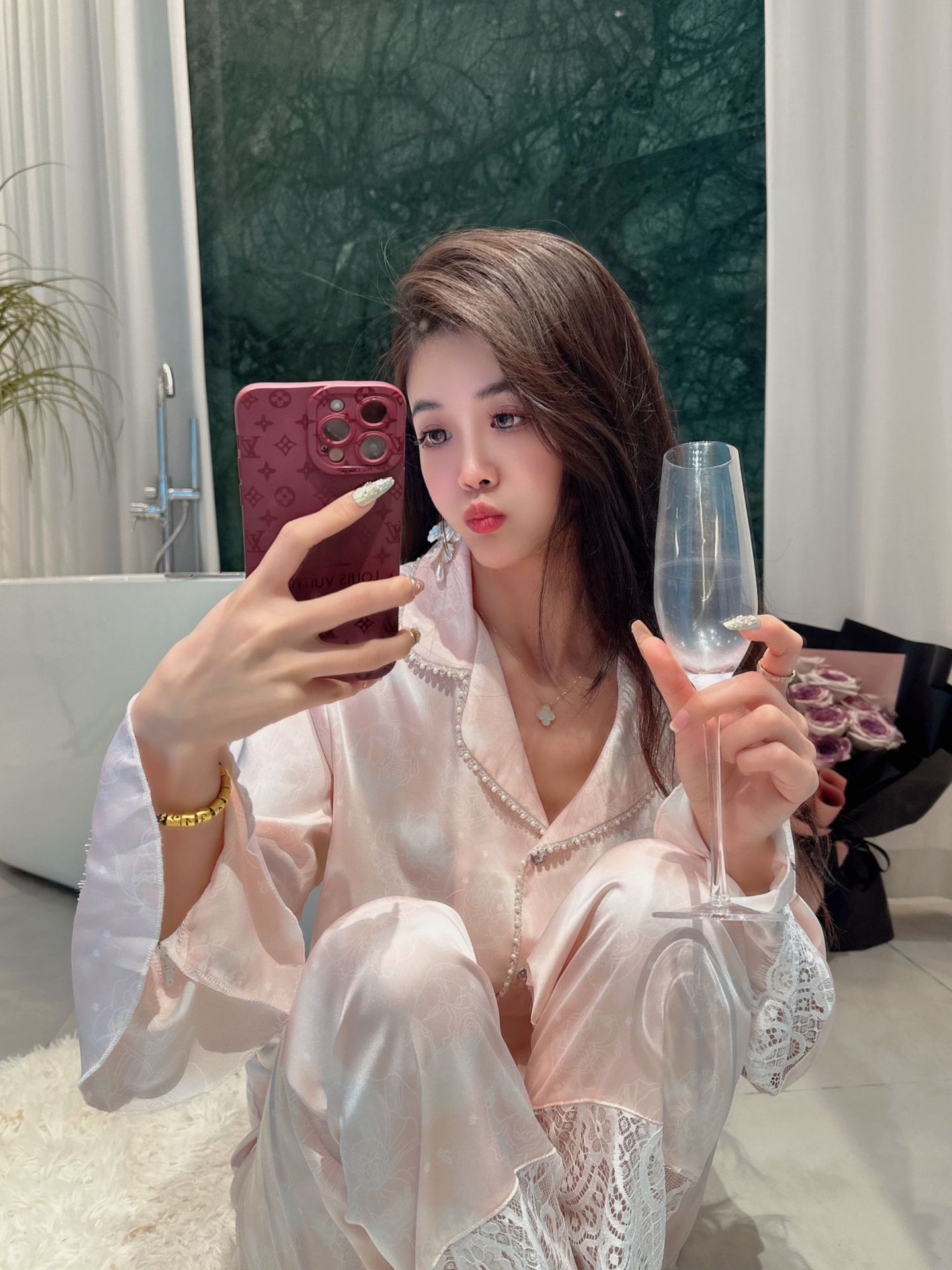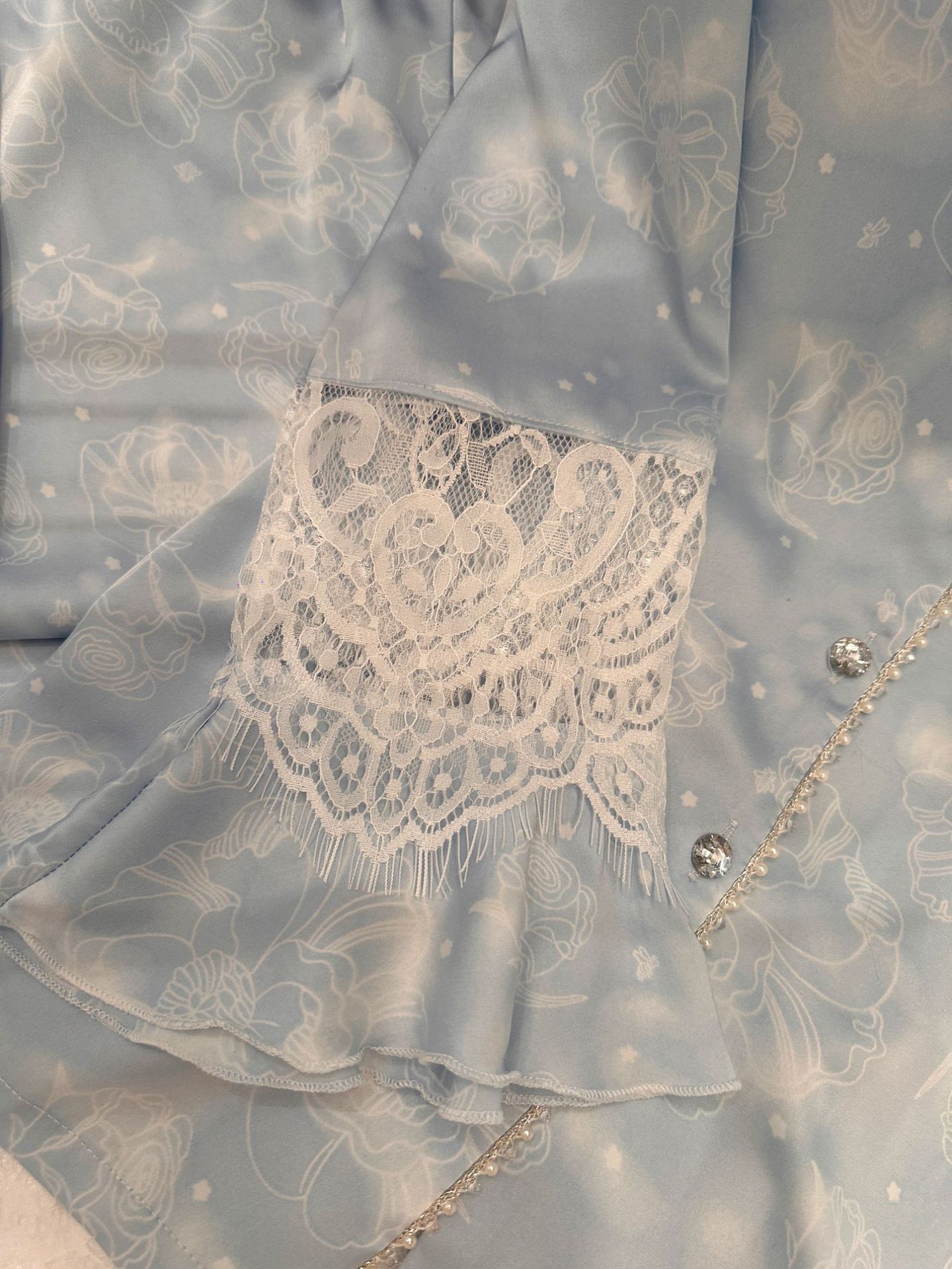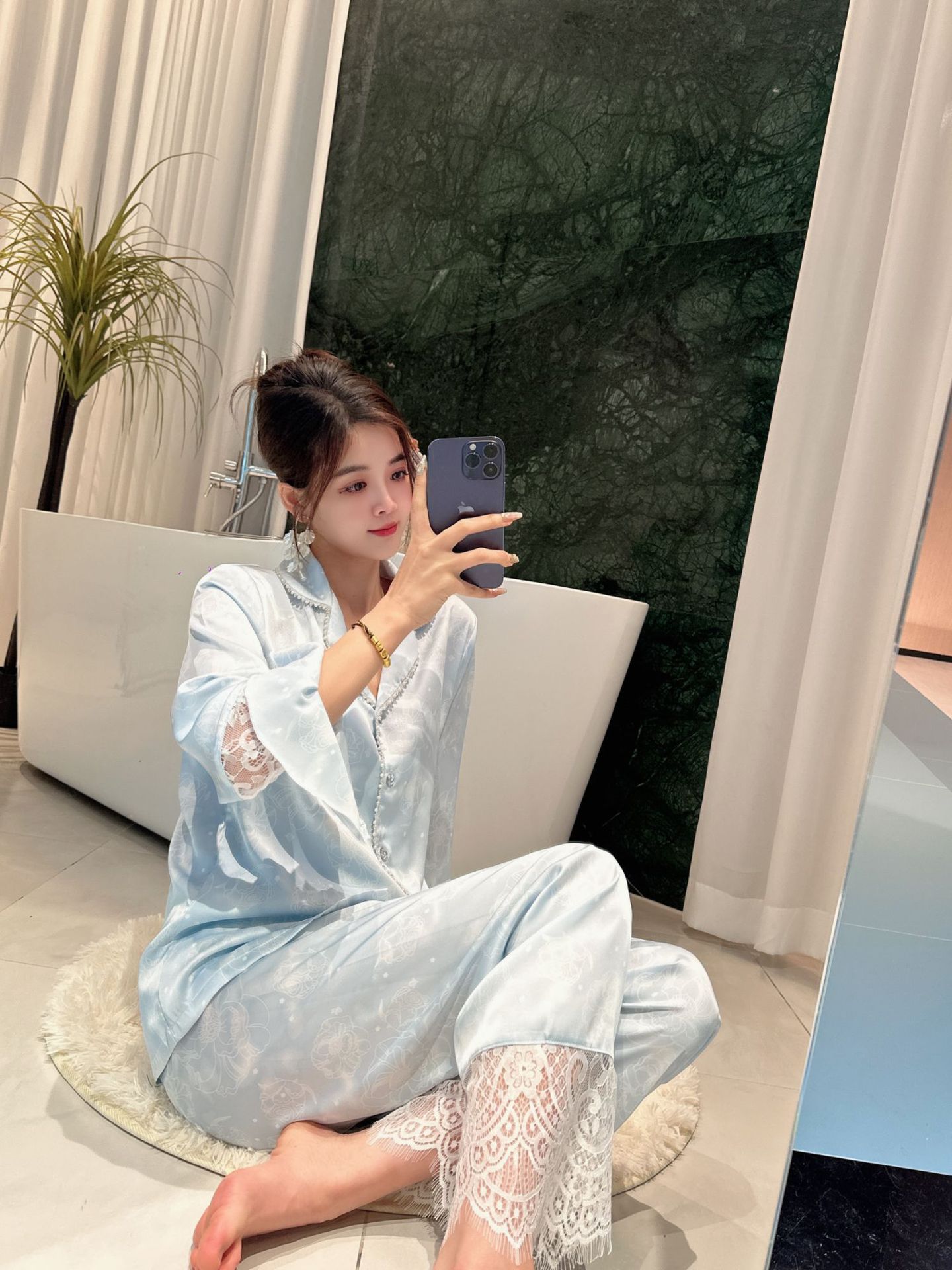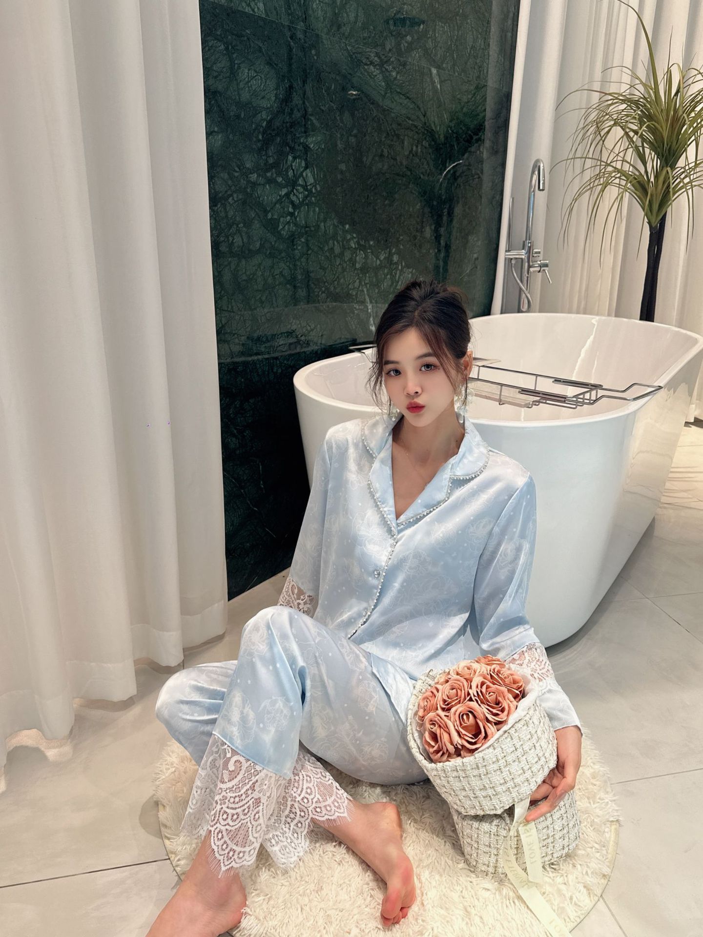 여성용 아이스 실크 잠옷 세트 봄 여름 비즈 레이스 홈웨어 긴팔 얇고 통기성 좋으며 외출 가능 편안함스토어 가기