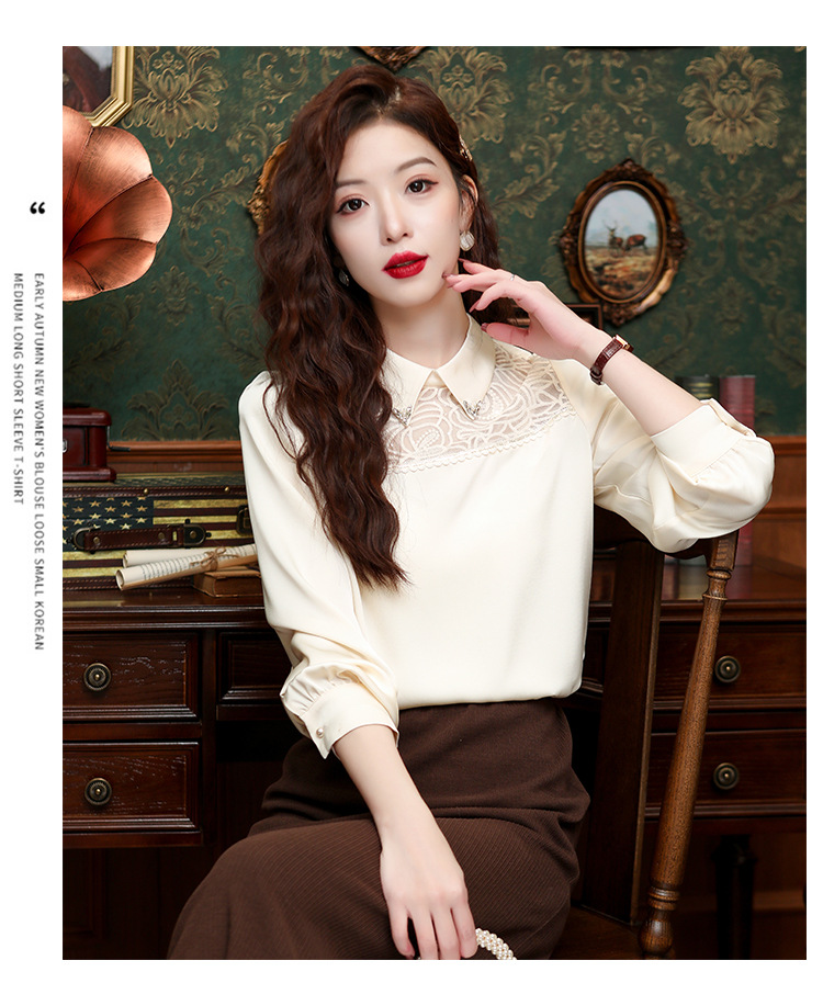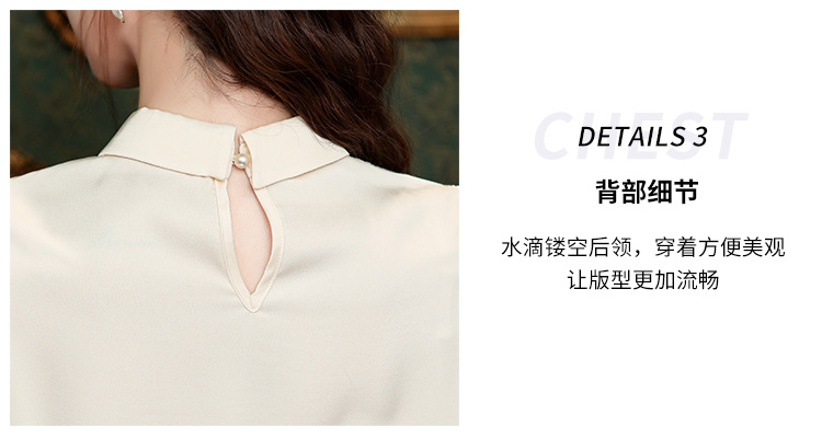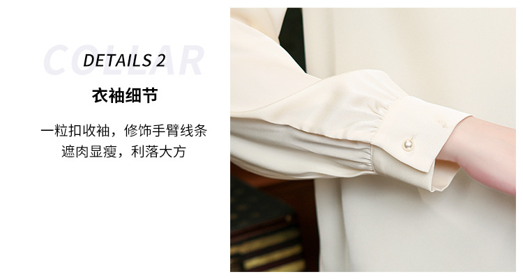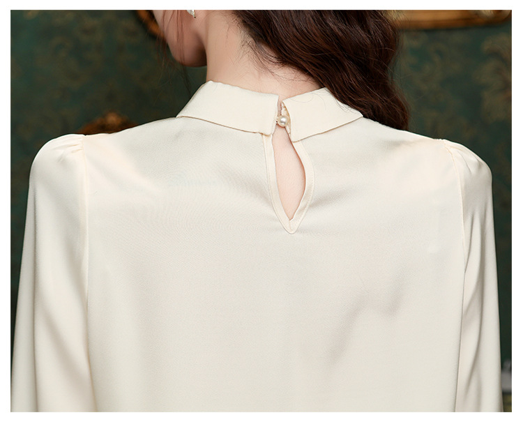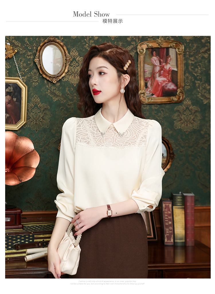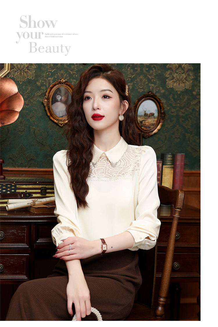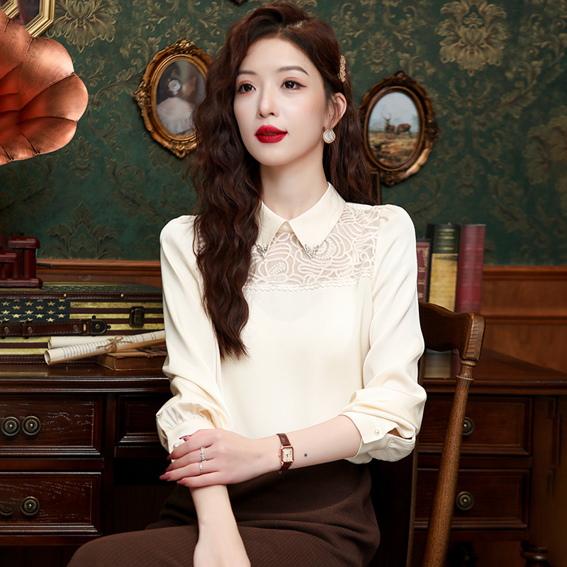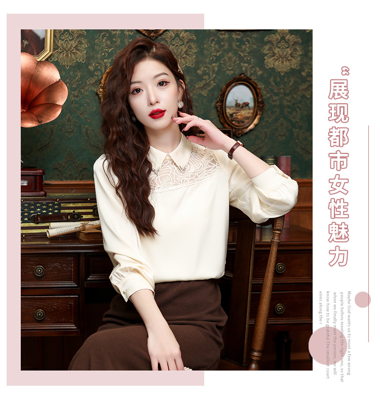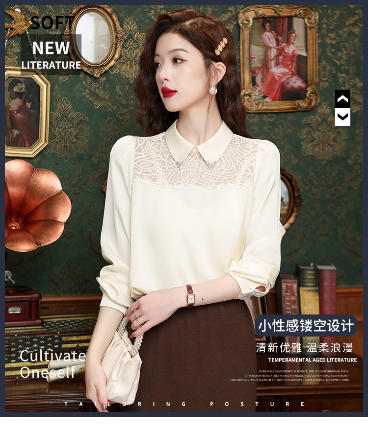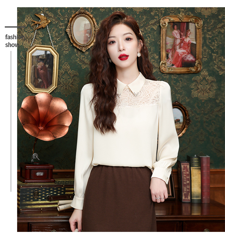 봄 새로운 서양식 작은 셔츠 긴 소매 여성 셔츠 2024 여성을위한 중공 모조 인형 칼라 새틴 쉬폰 셔츠 도매스토어 가기