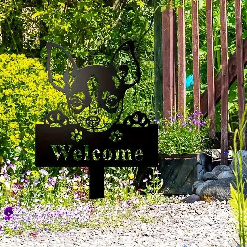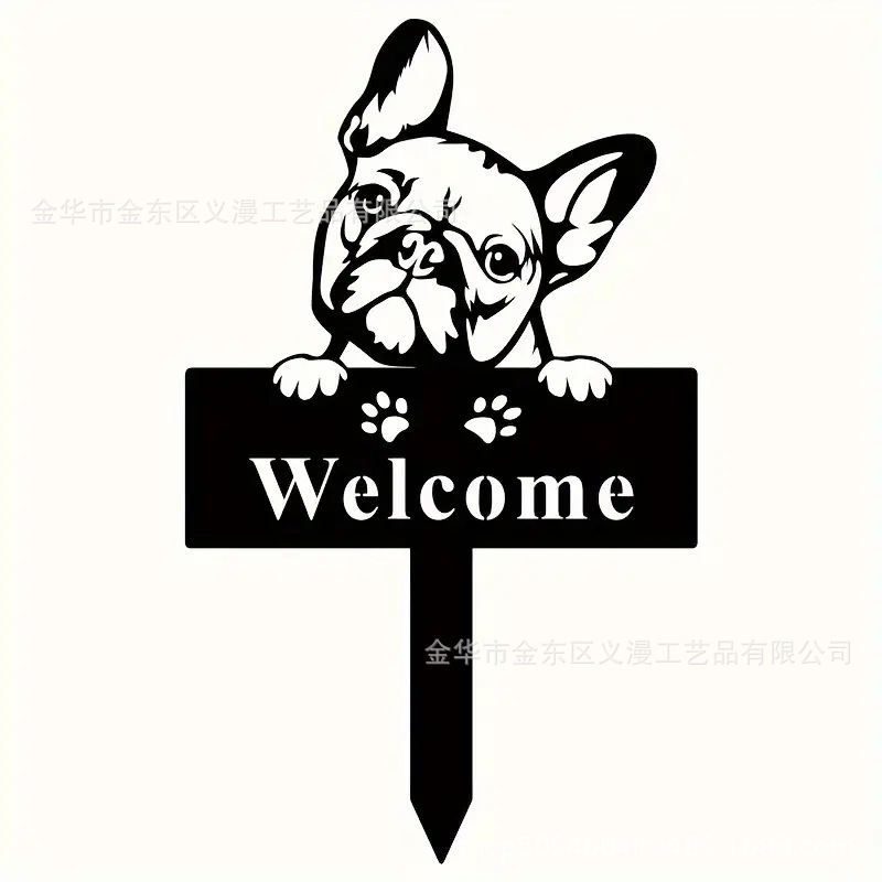 국경 간 금속 불독 실루엣 정원 사인, 개 환영 사인, 지상 삽입 정원 장식,스토어 가기
