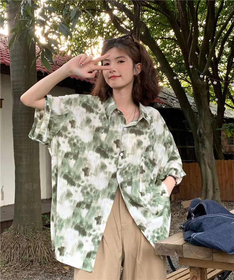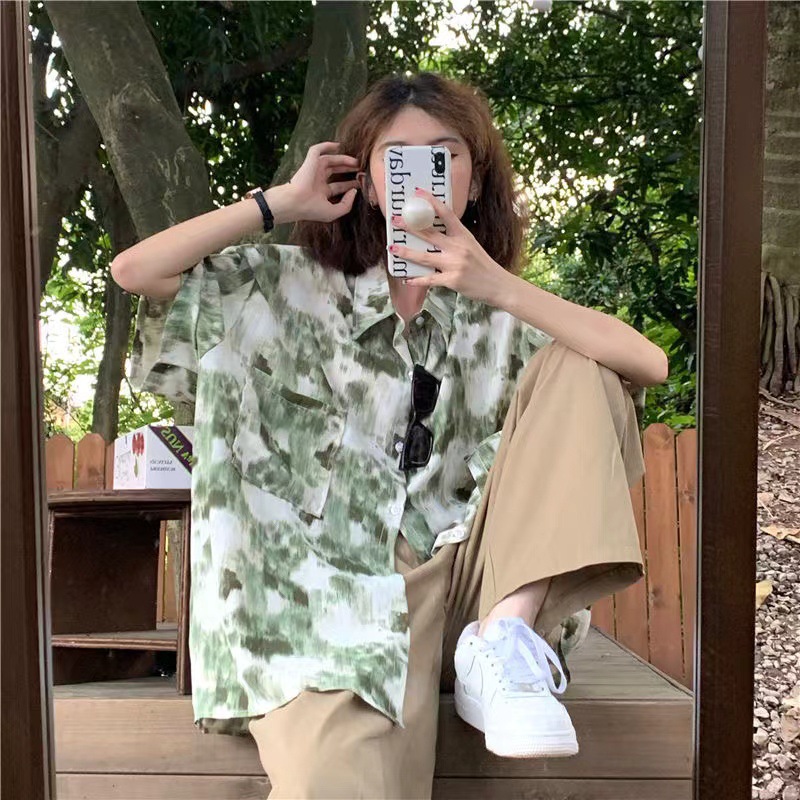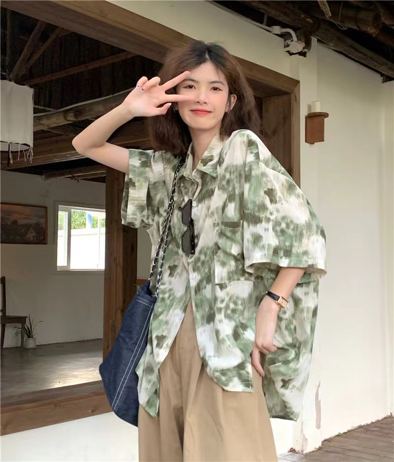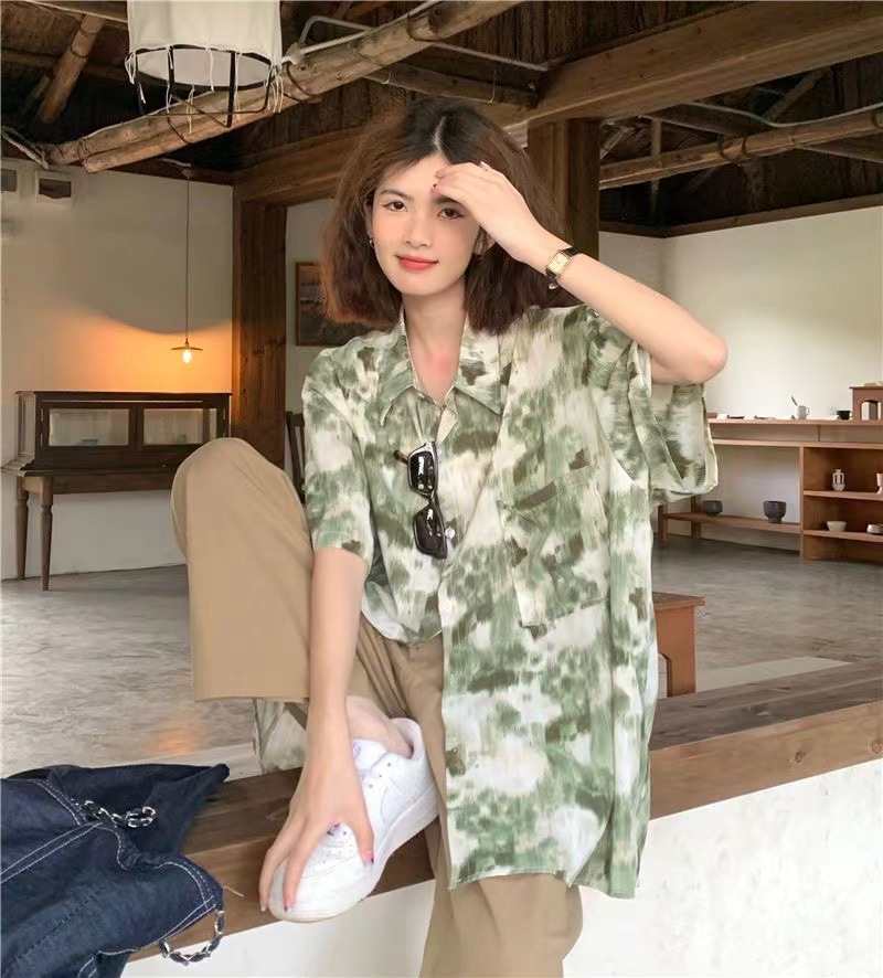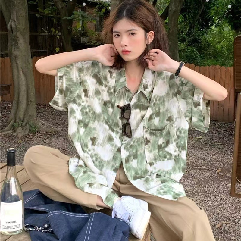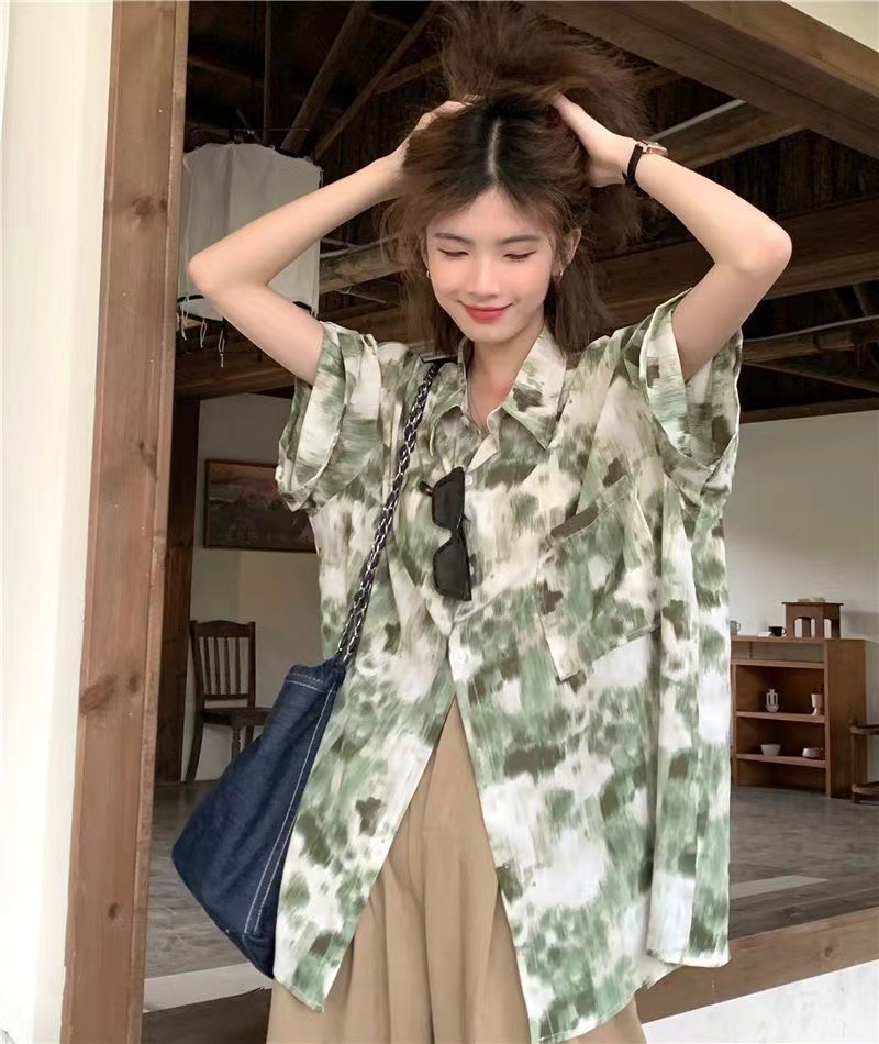 홍콩 스타일 복고풍 느슨한 슬리밍 짧은 소매 잉크 그림 꽃 셔츠 여성을위한 새로운 얇은 선 스크린 셔츠 카디건 탑 여름스토어 가기