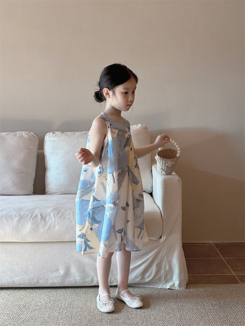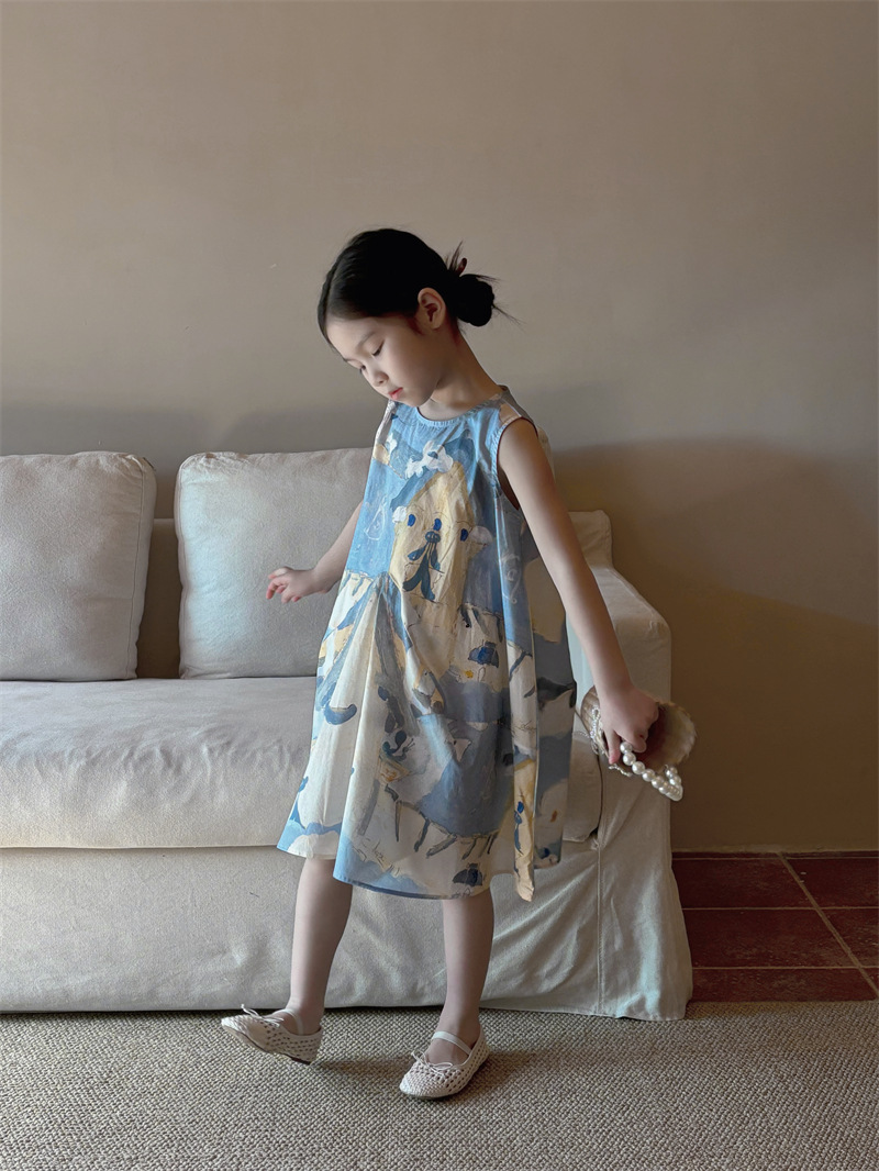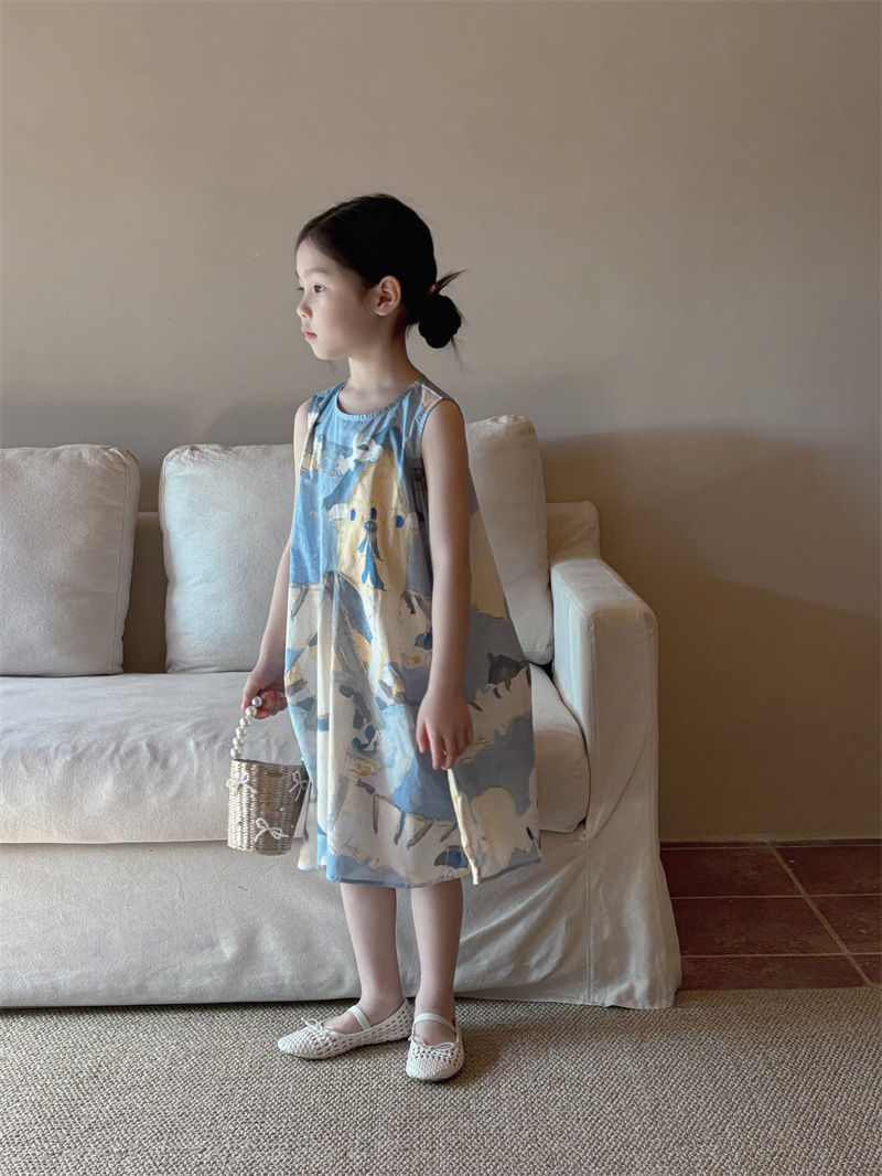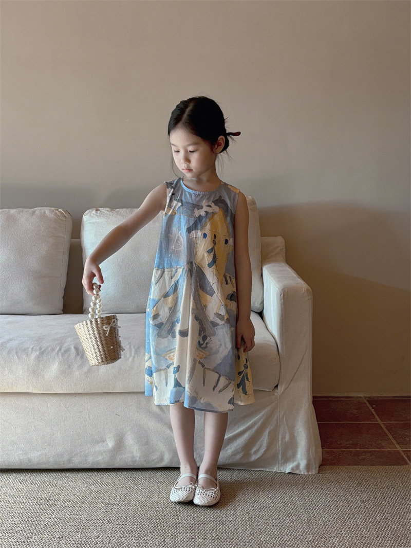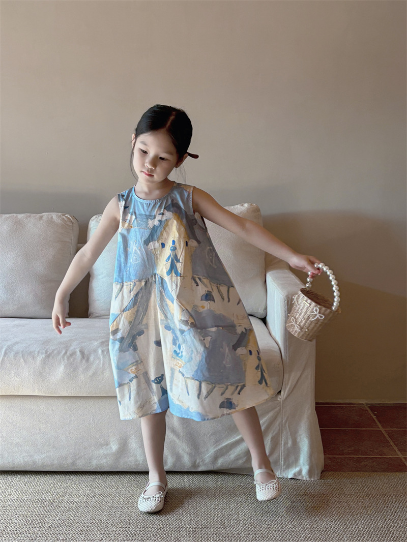 어린이 의류 소녀 원피스 아기 2024 새로운 서양식 여름 스커트 어린이 푸른 꽃 조끼 스커트 Q391