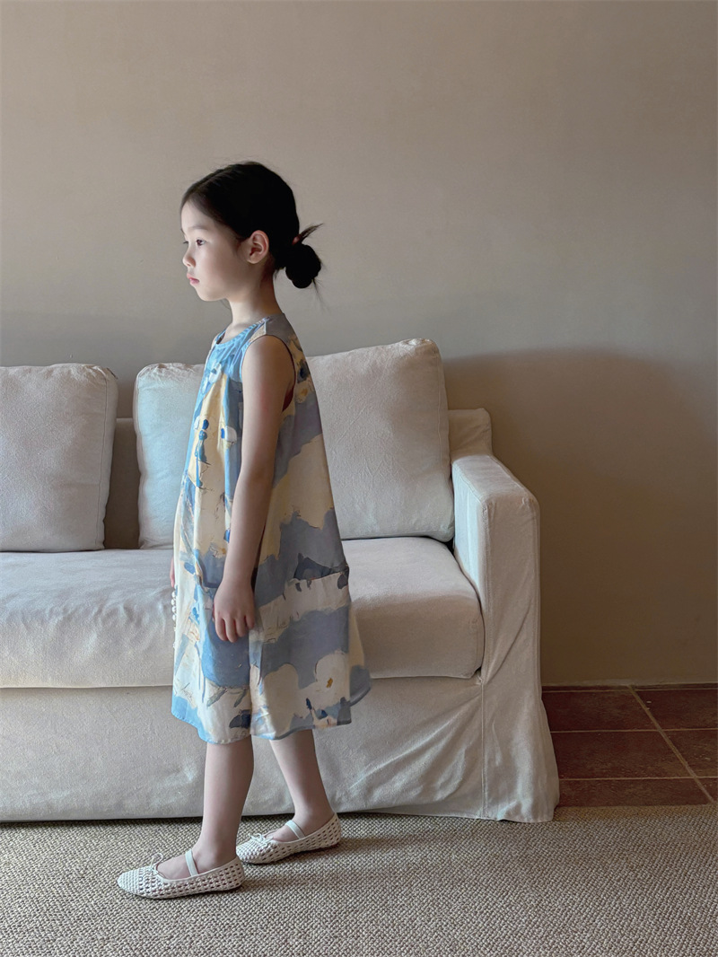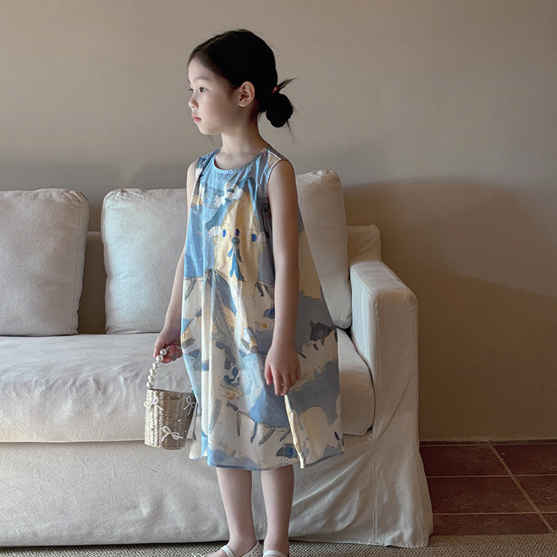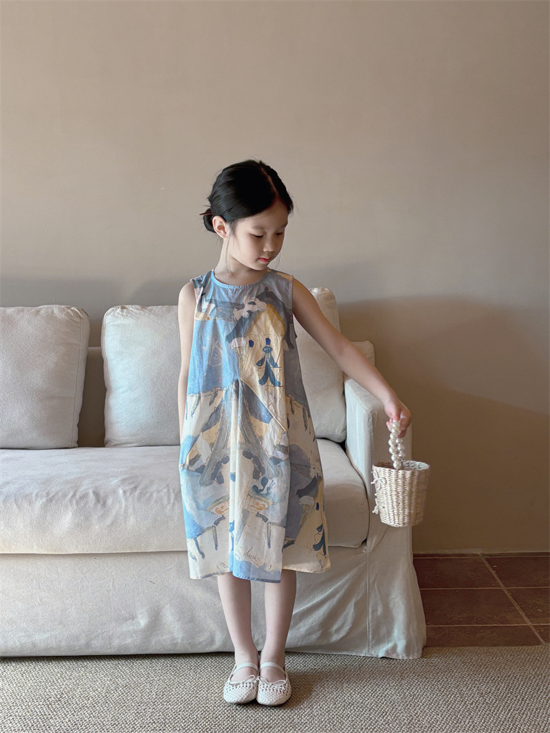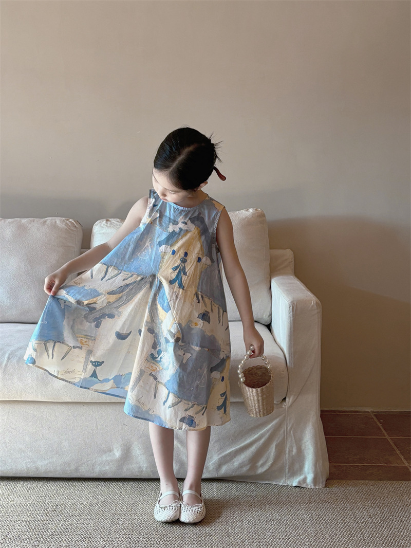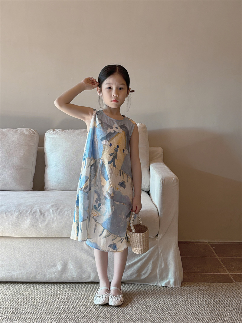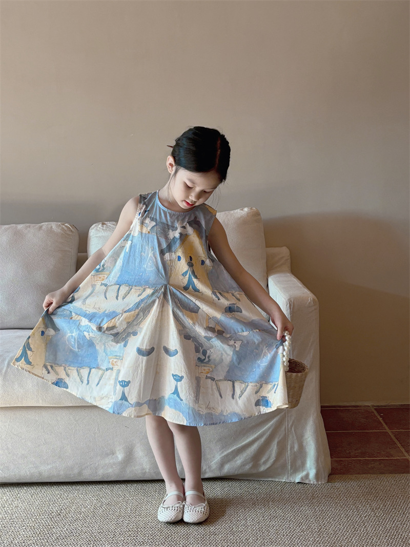어린이 의류 소녀 원피스 아기 2024 새로운 서양식 여름 스커트 어린이 푸른 꽃 조끼 스커트 Q391