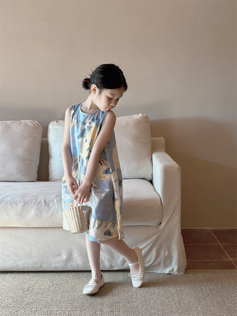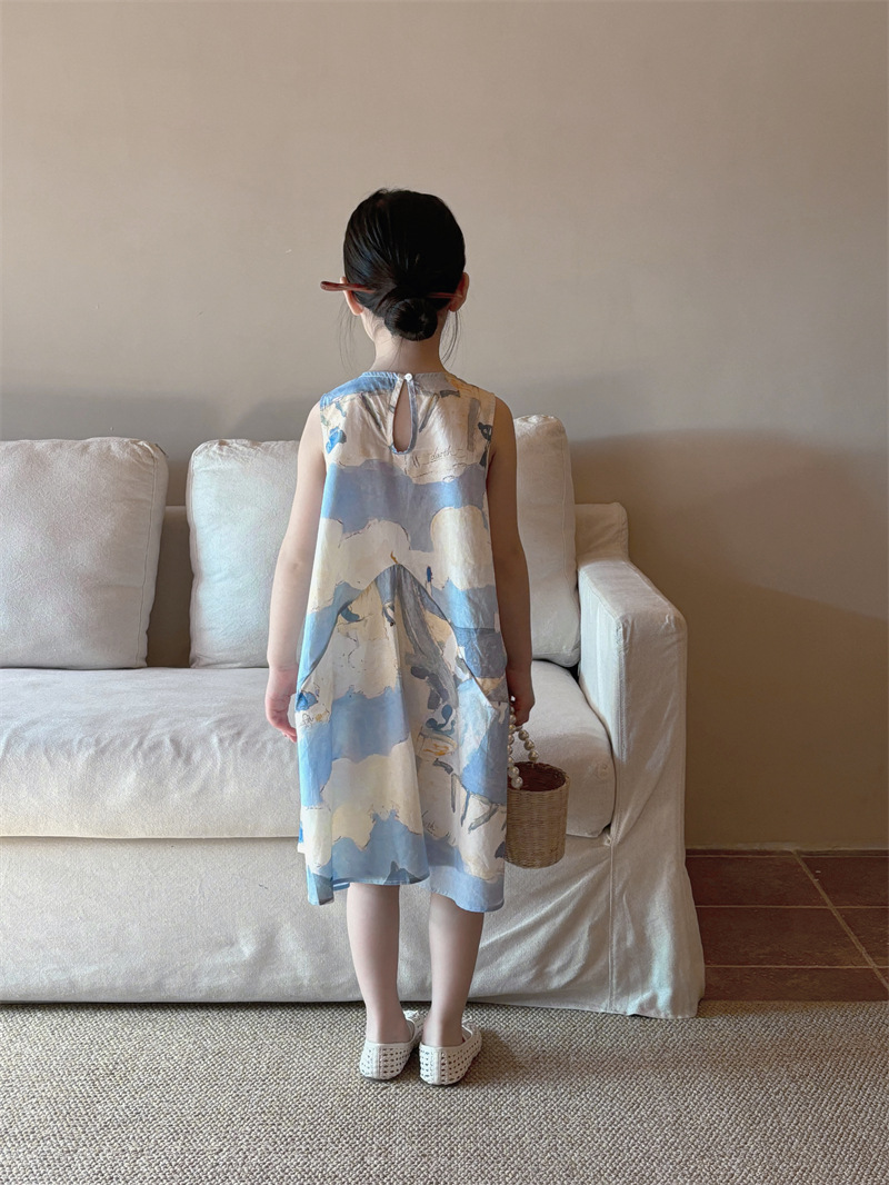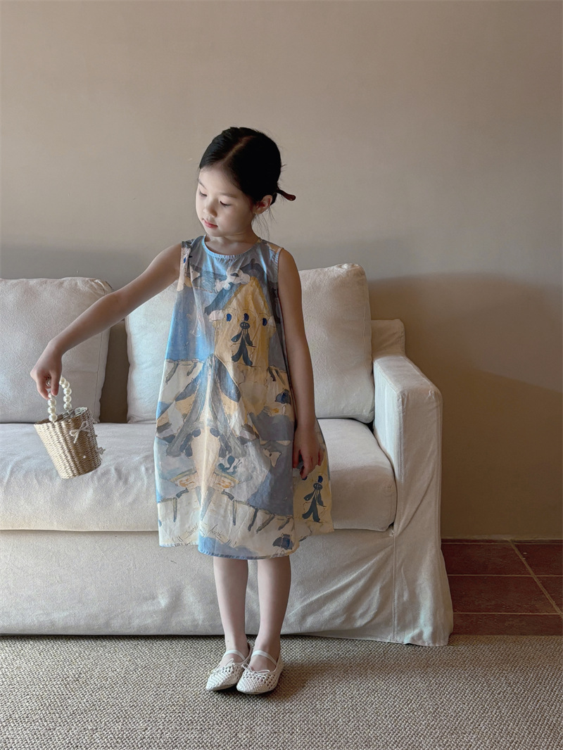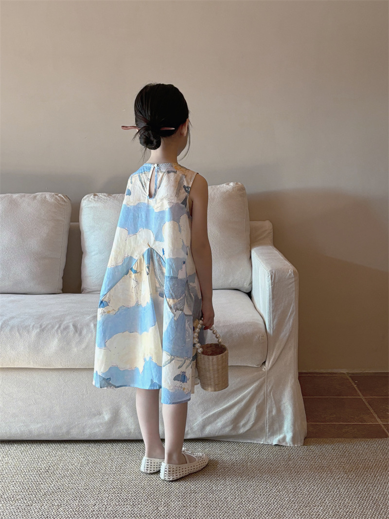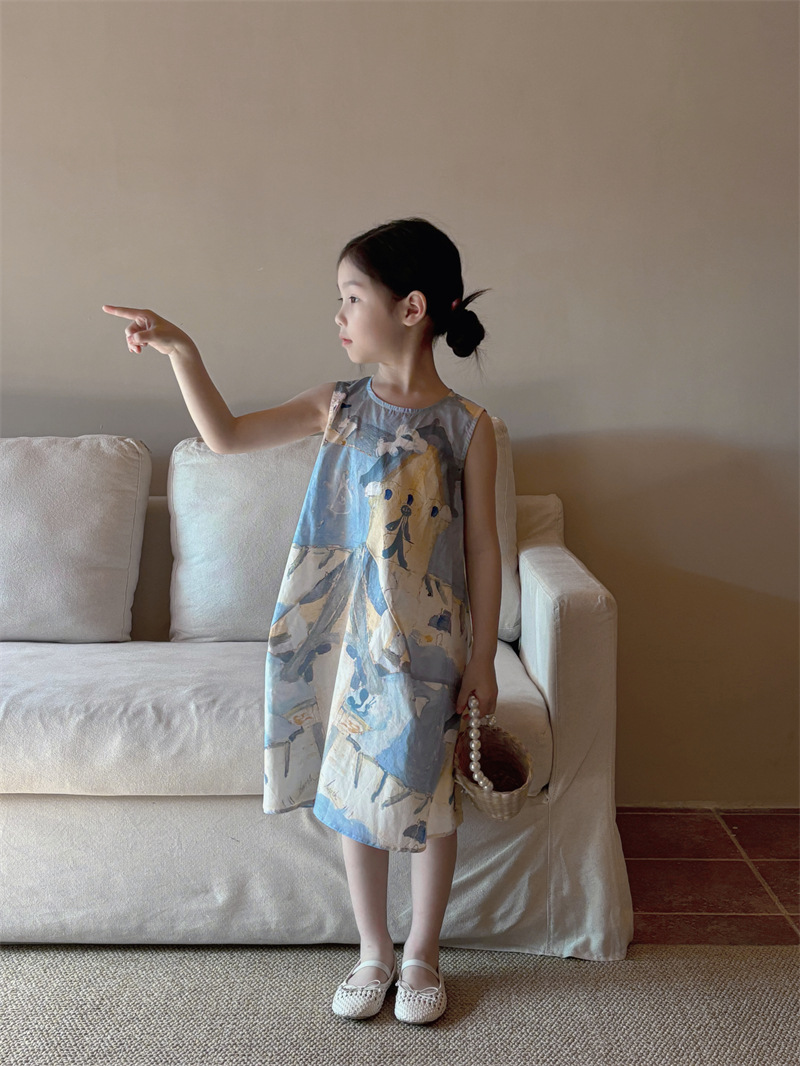 어린이 의류 소녀 원피스 아기 2024 새로운 서양식 여름 스커트 어린이 푸른 꽃 조끼 스커트 Q391