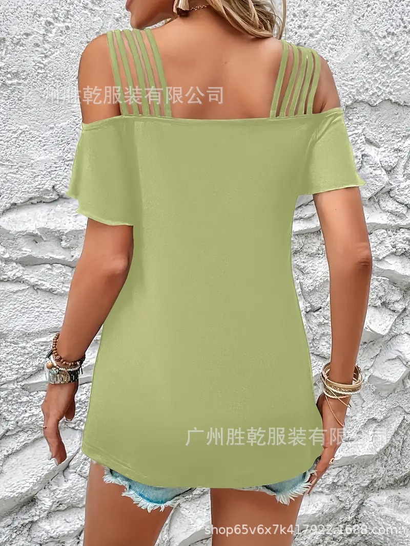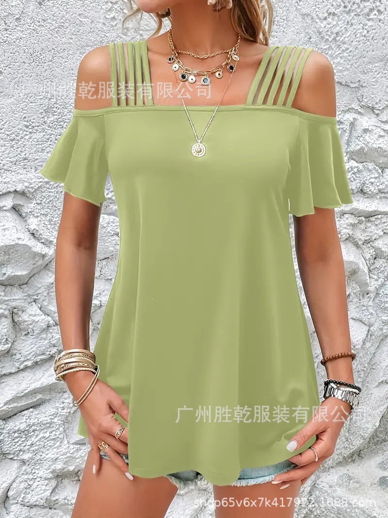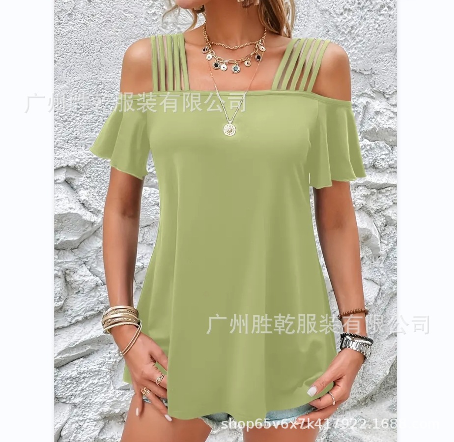 2024 단색 여성의 느슨한 캐주얼 반팔 블라우스 국경 전자 상거래 아마존 유럽과 미국의 오프 숄더 오프 숄더 T-블러드스토어 가기