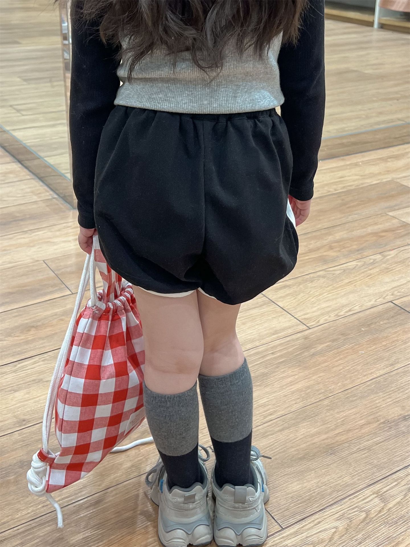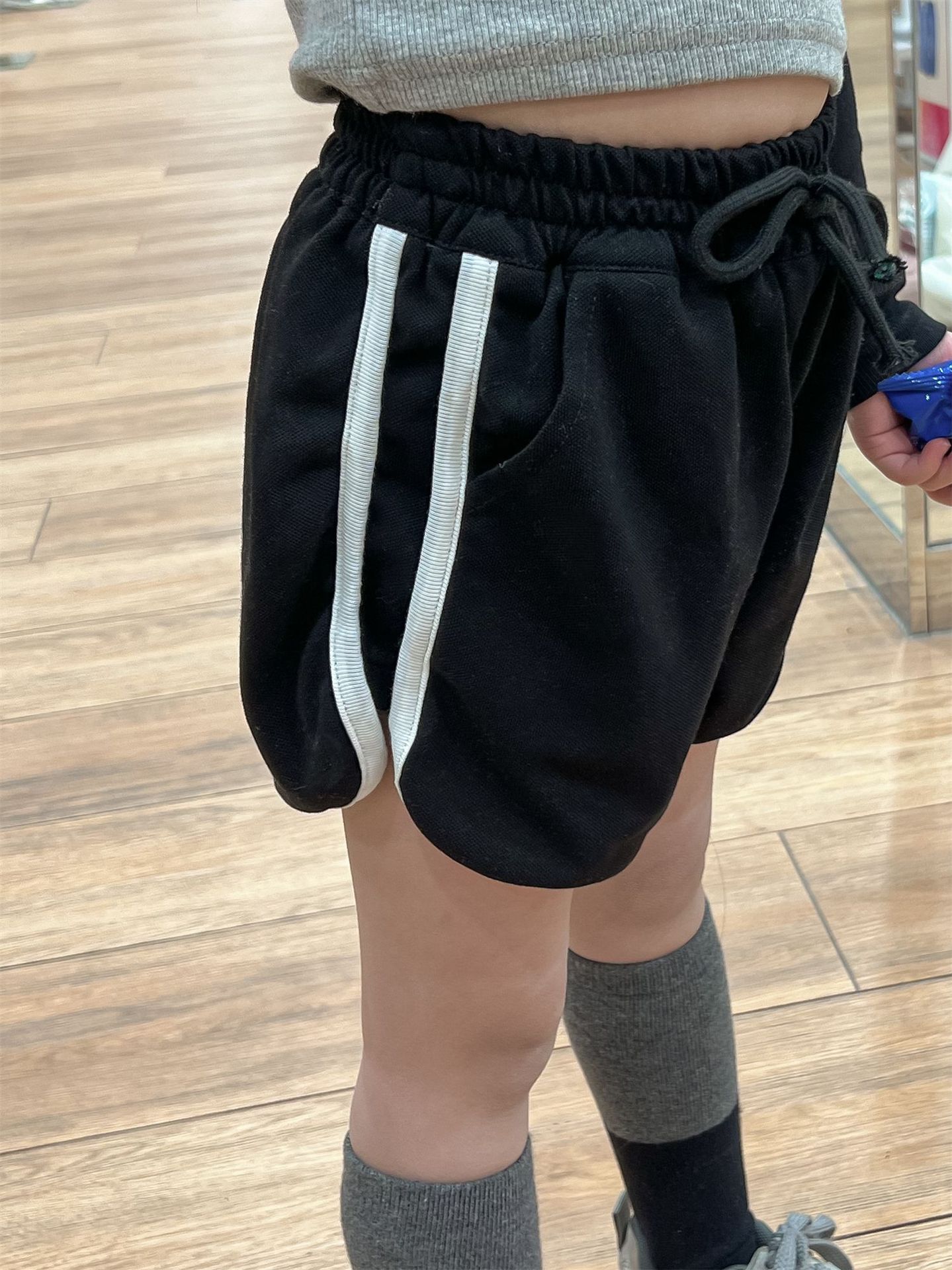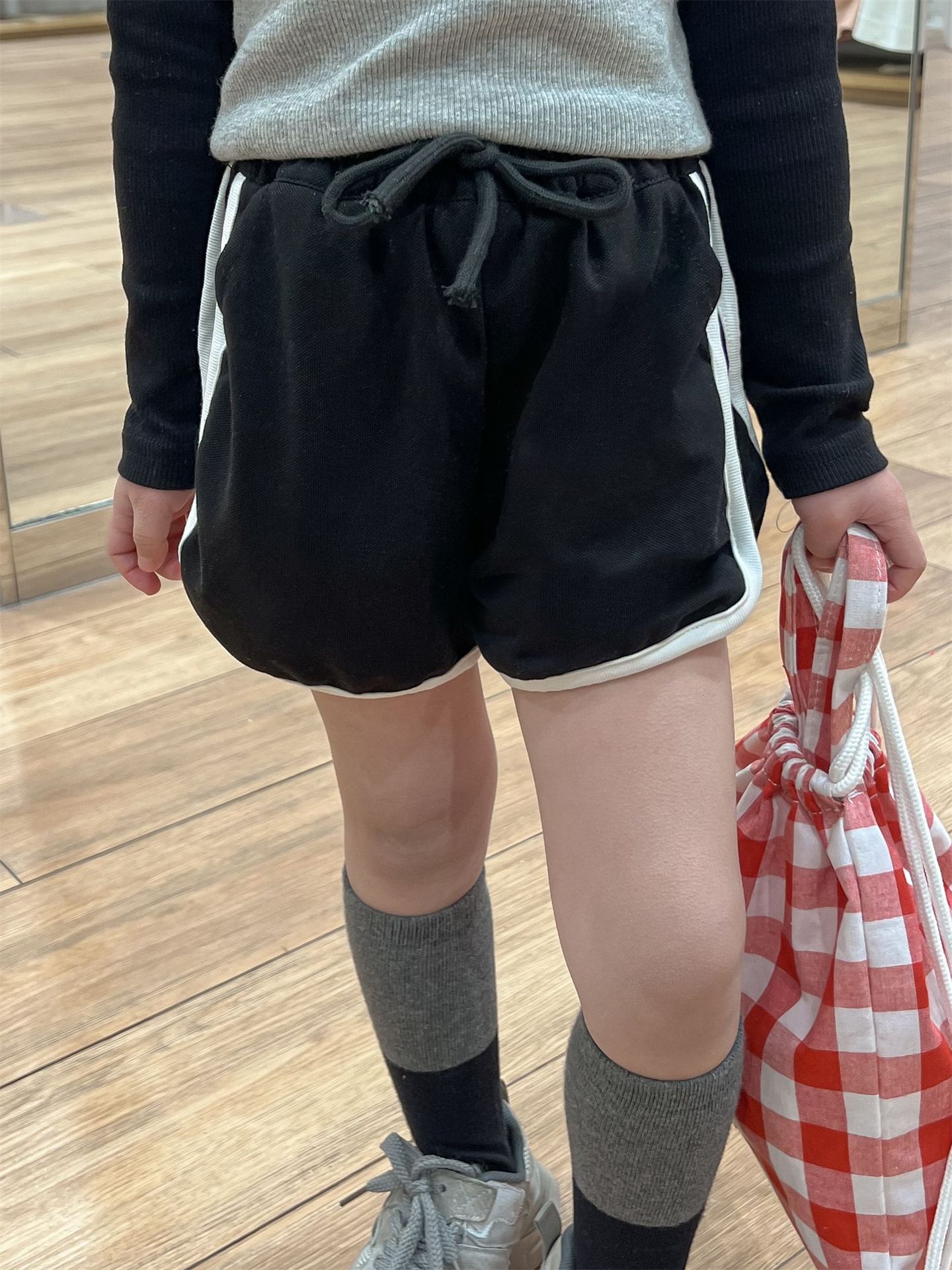 한국 아동복 소녀의 봄과 여름 대비 색상 둥근 목 긴 소매 바닥 셔츠 + 뜨거운 소녀 drawstring 넓은 다리 반바지 핫팬츠 대외 무역스토어 가기