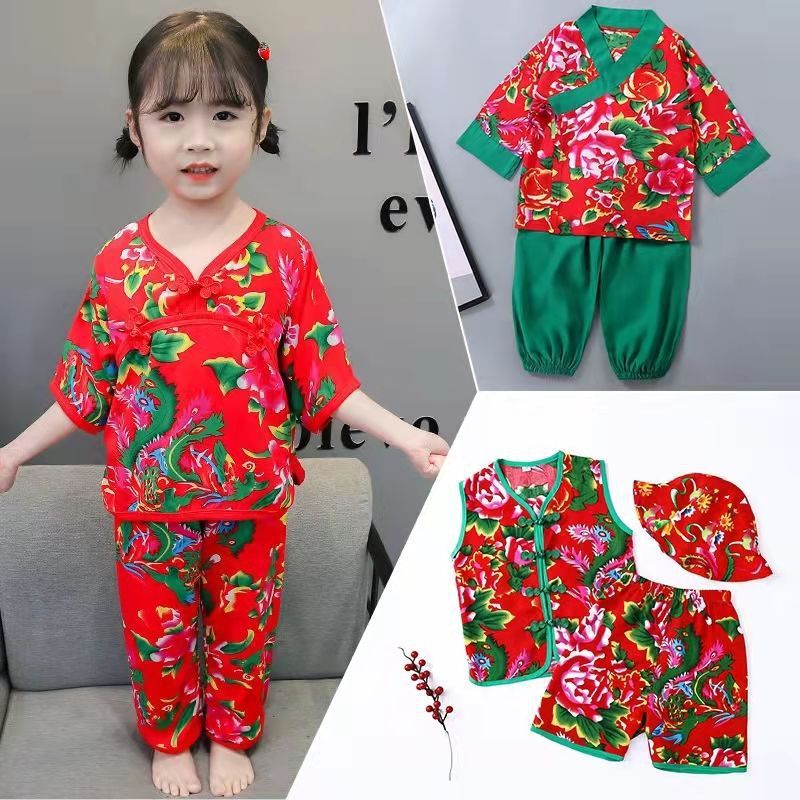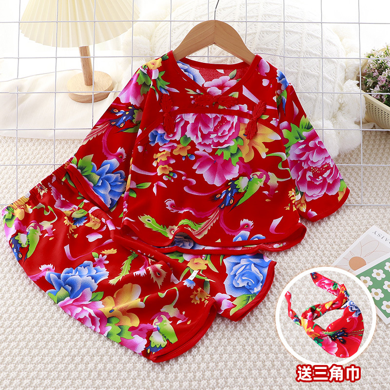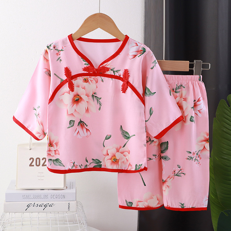 어린이 홈 착용 세트 에어컨 의류 베이비 코튼 실크 북동쪽 큰 꽃 반소매 크롭 바지 소년 소녀 여름 잠옷