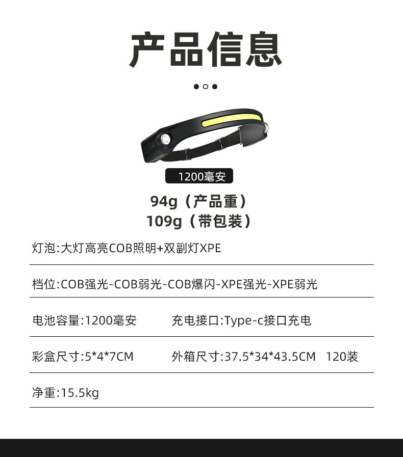 • 싱글 사이드 램프 COB 헤드 램프 폴리머 배터리 (1200 mA)