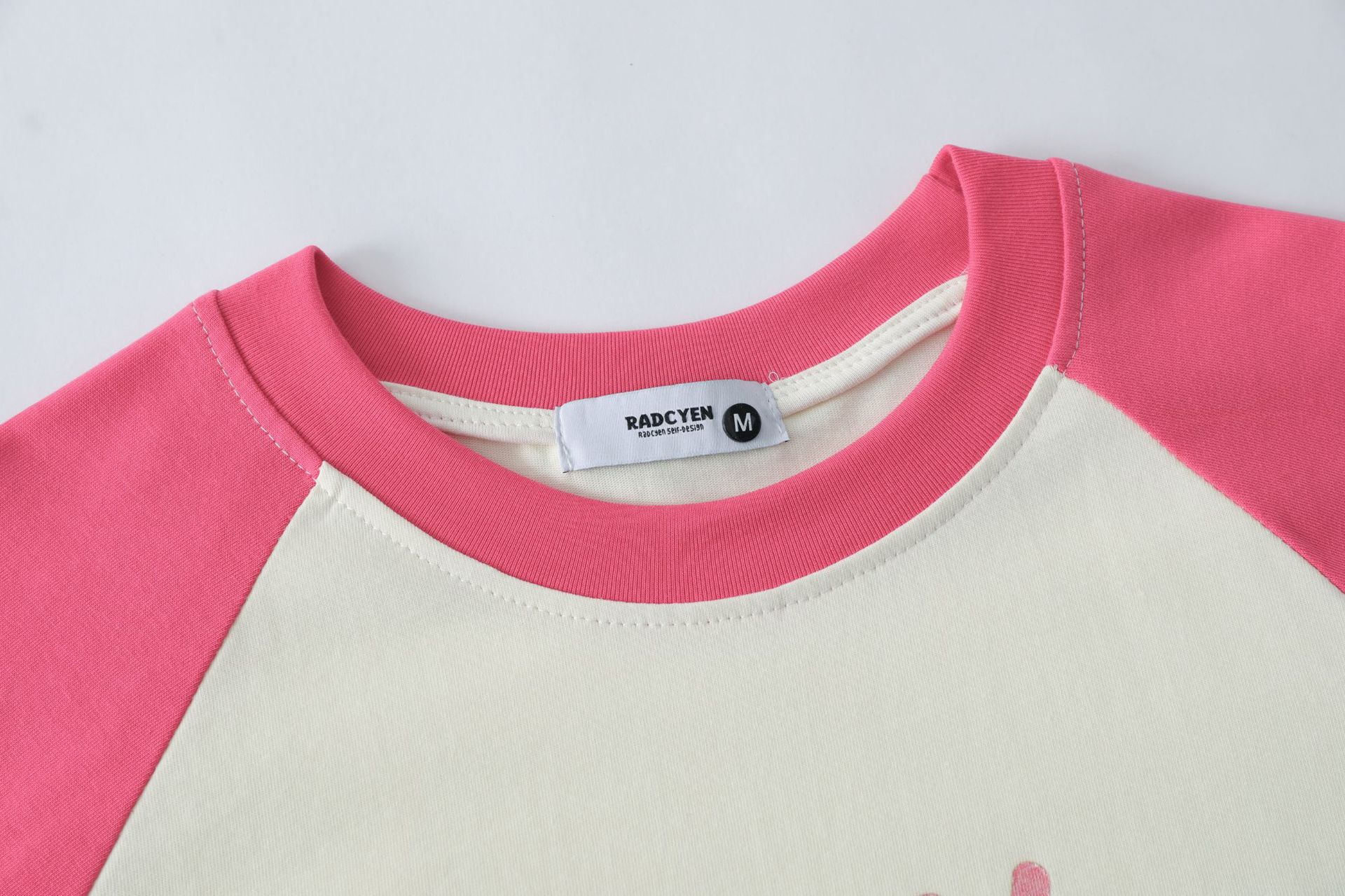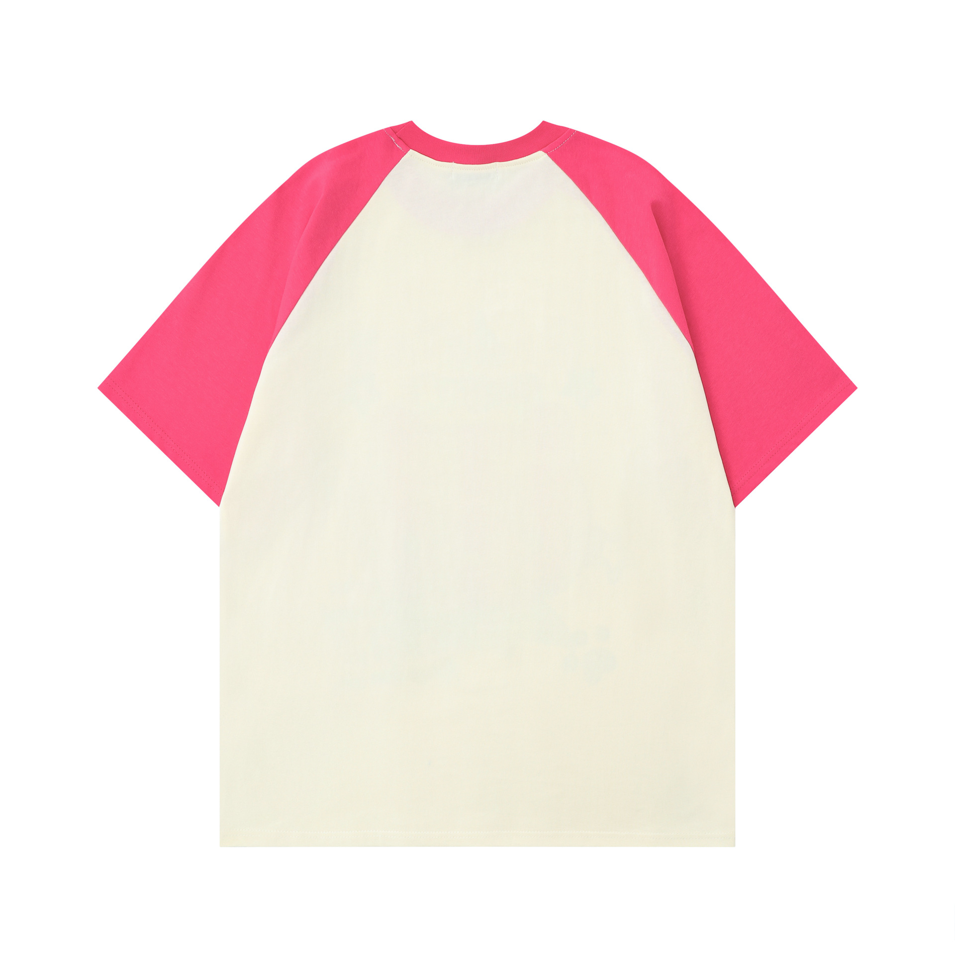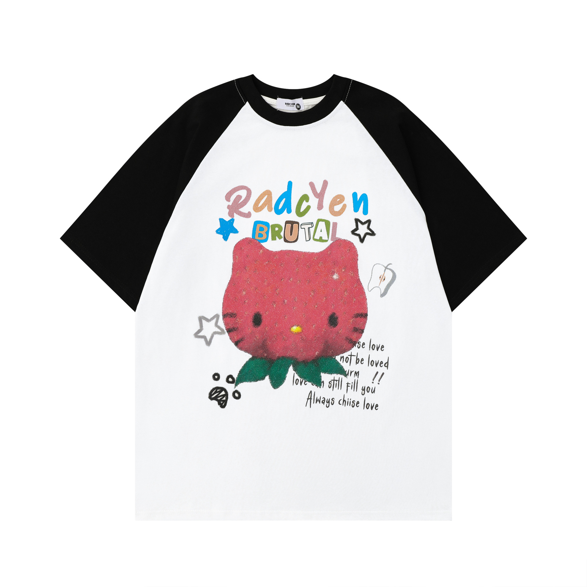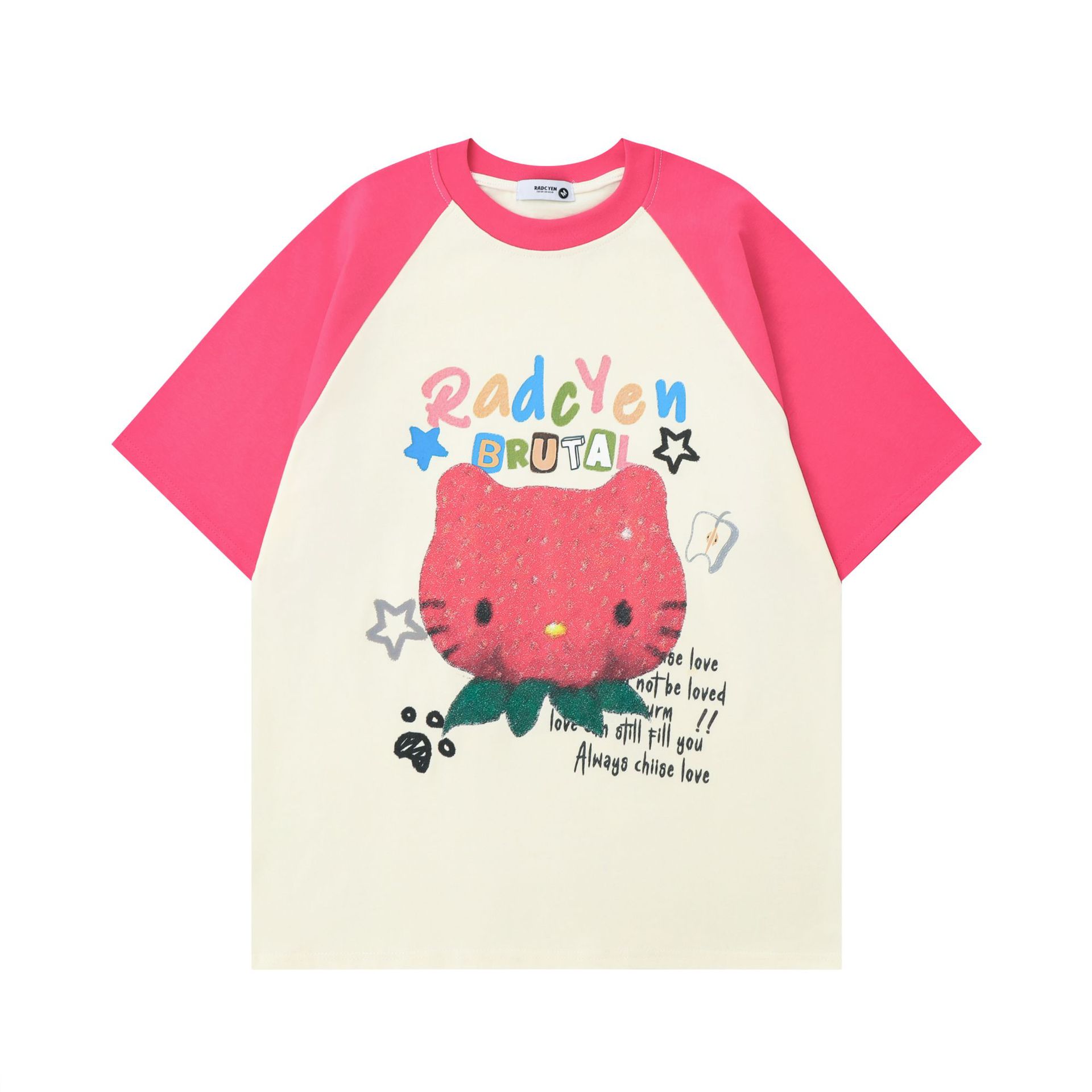 웃긴 딸기 KT 고양이 대비 컬러 스티칭 프린트 티셔츠 남녀 올매치 오버 사이즈 커플 반팔 티셔츠