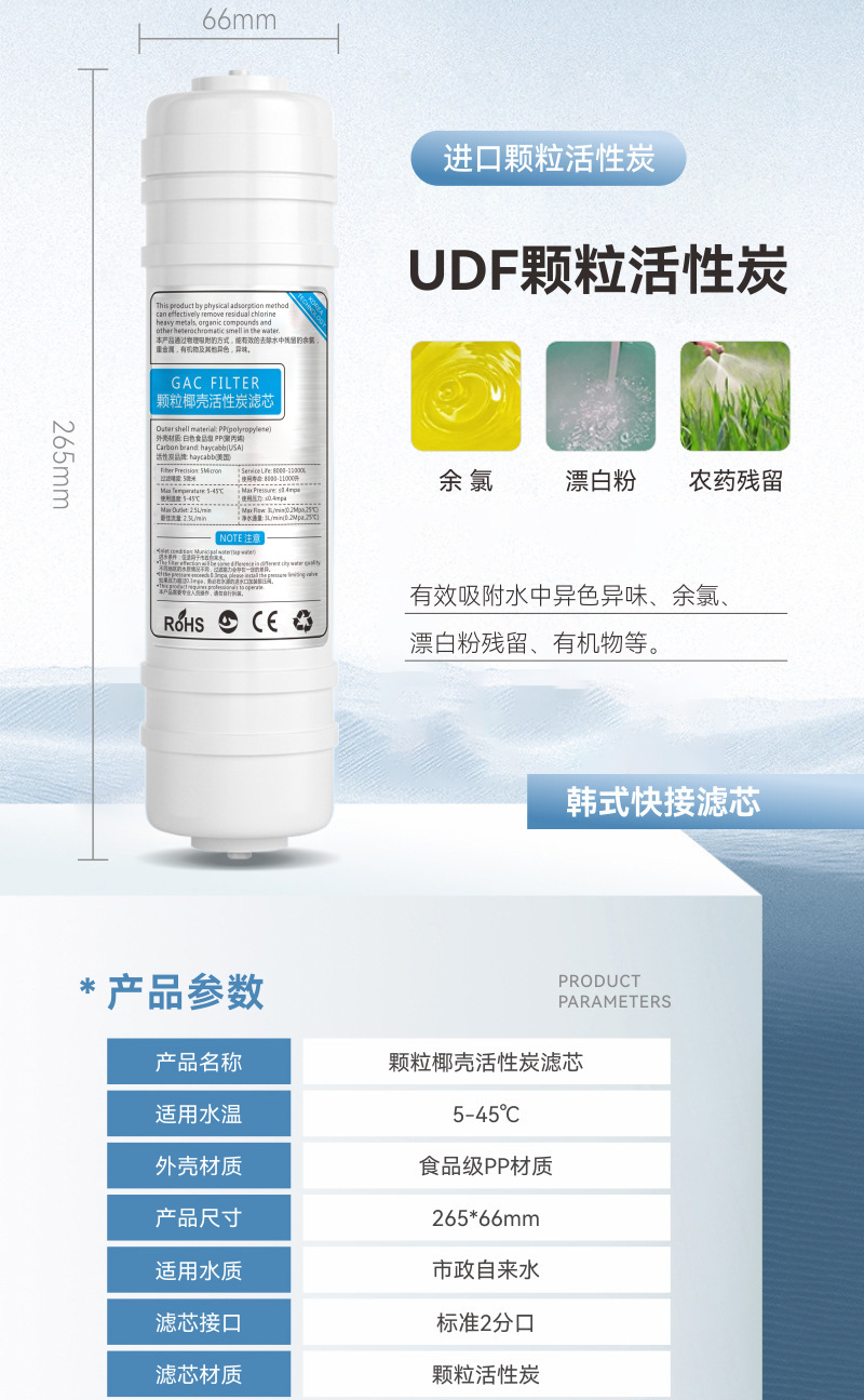 정수기 필터 카트리지 전처리 필터 입자 활성탄 퀵커넥트 UDF 초미세 여과 순수기 코코넛 껍질 활성탄 정수 필터 카트리지