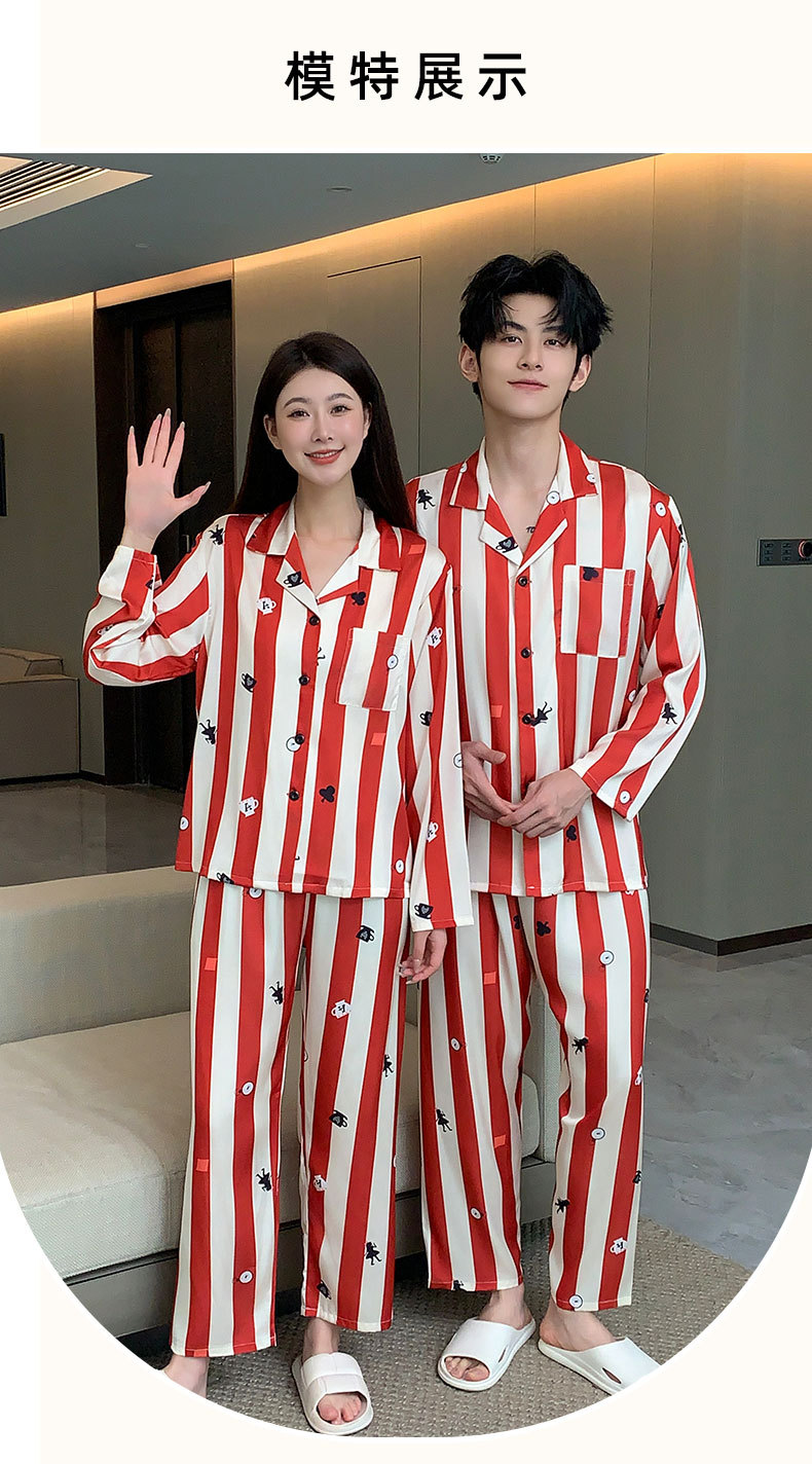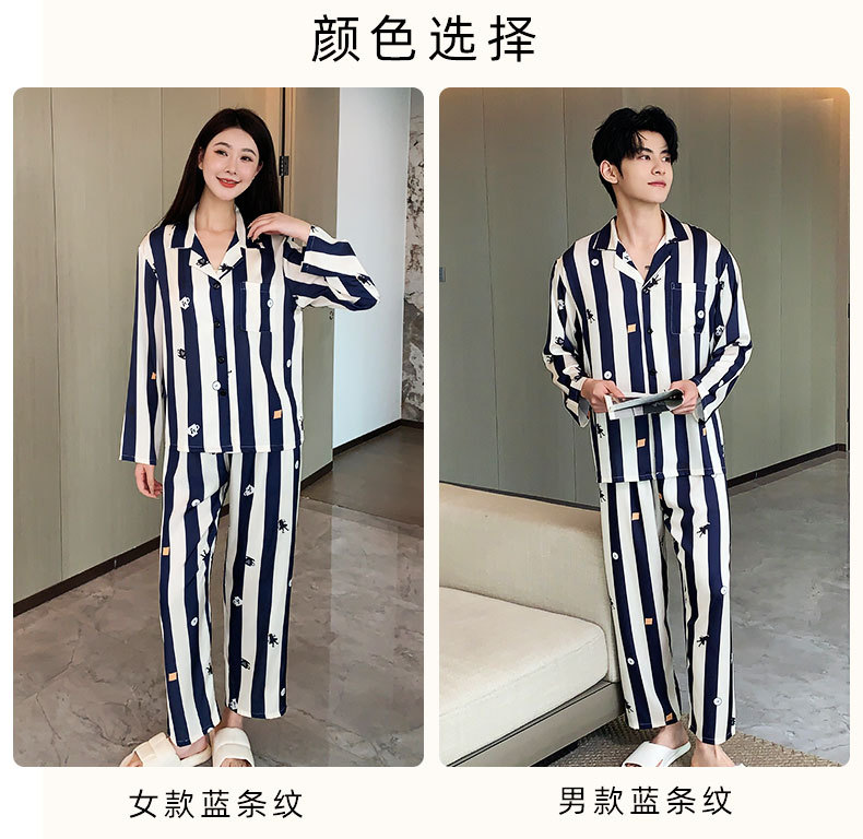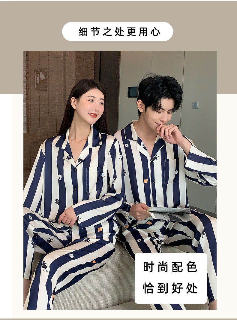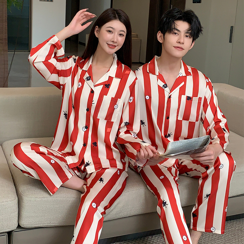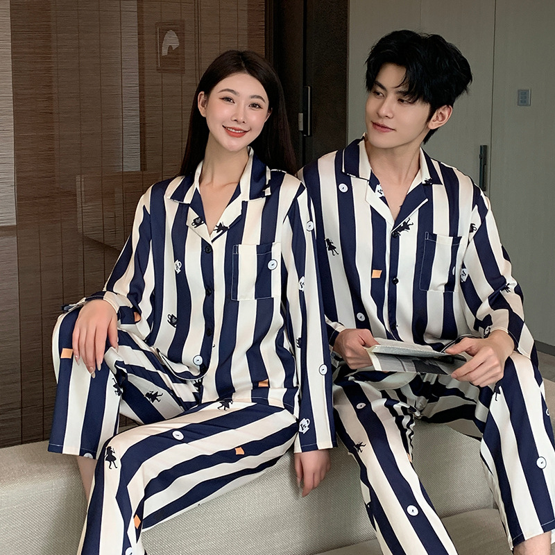 커플 잠옷 여성용 봄 가을 2025 신상 긴팔 아이스 실크 세트 인기 대형 남성용 스트라이프 홈웨어 도매스토어 가기