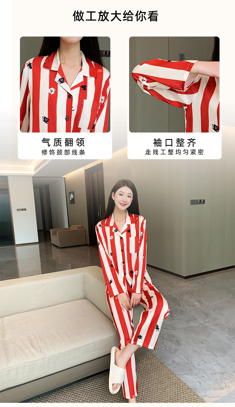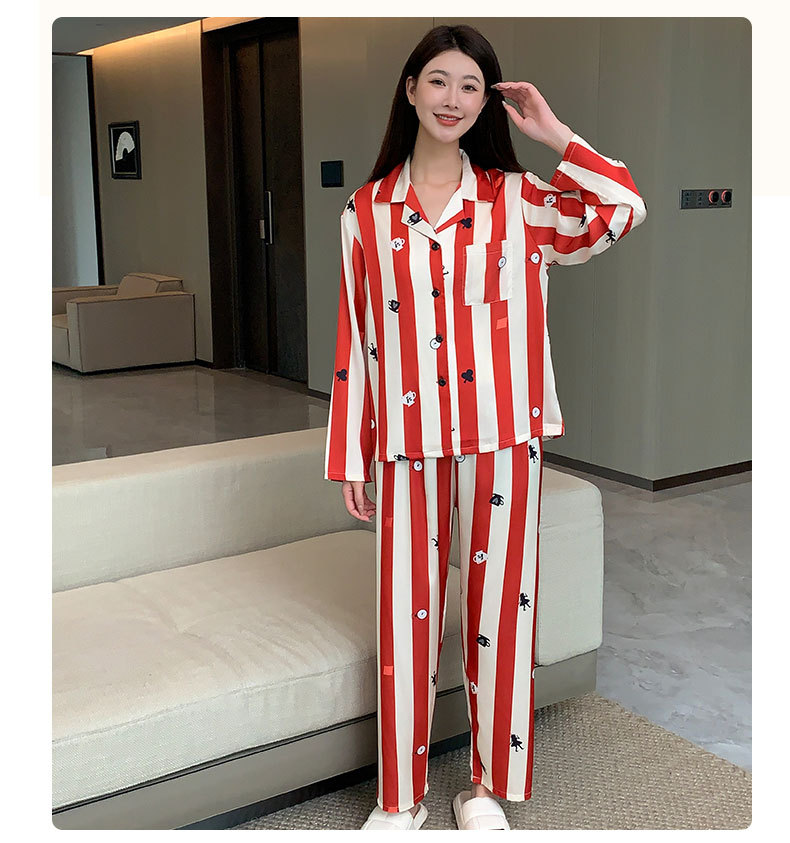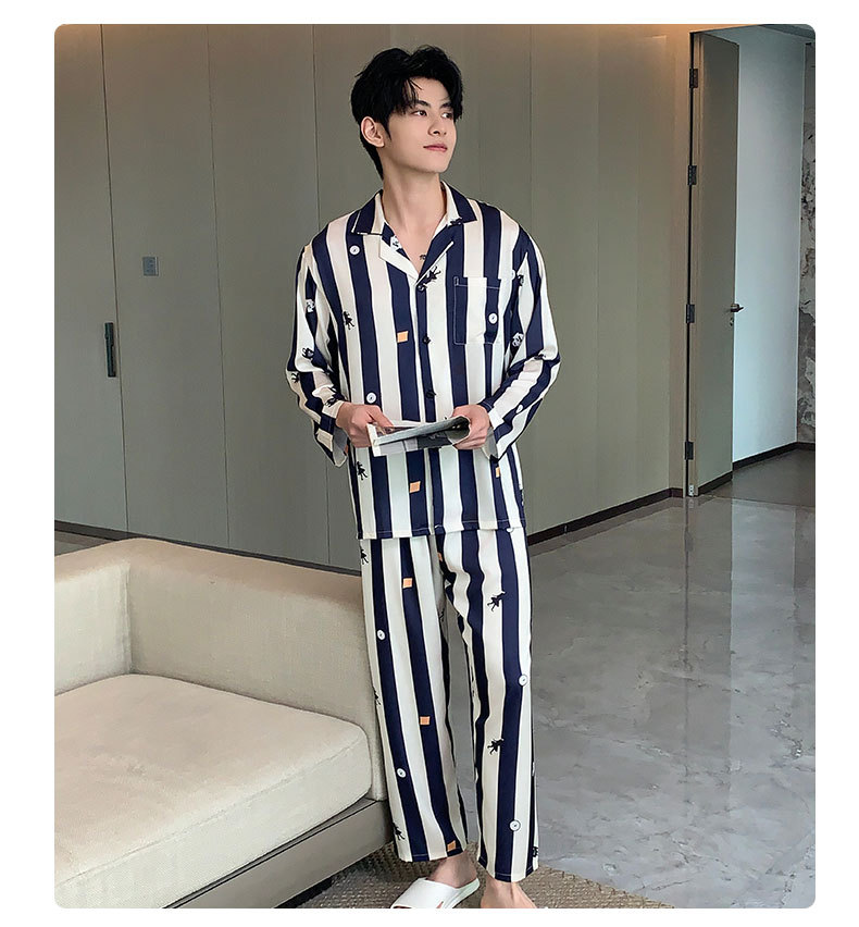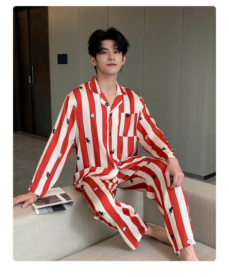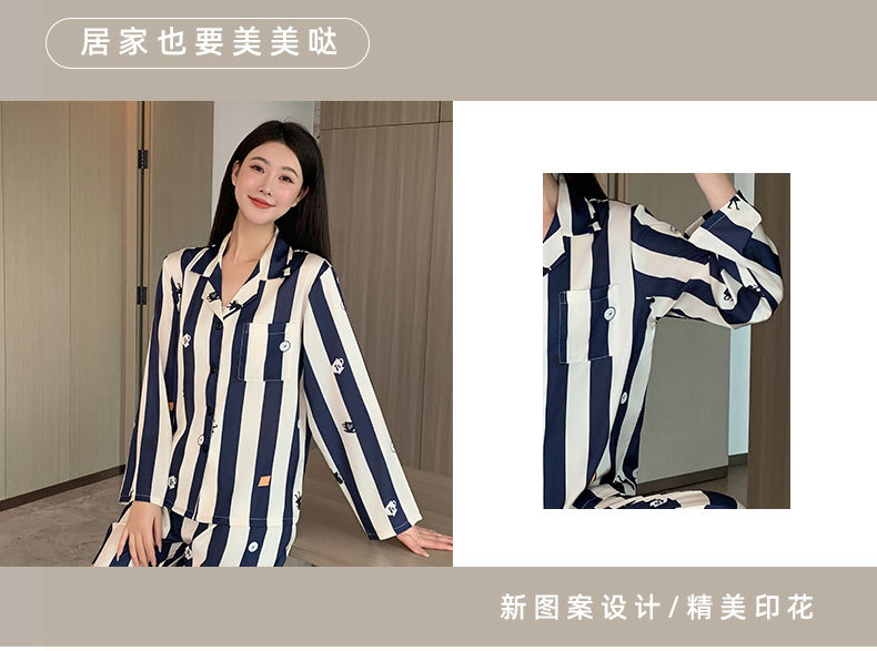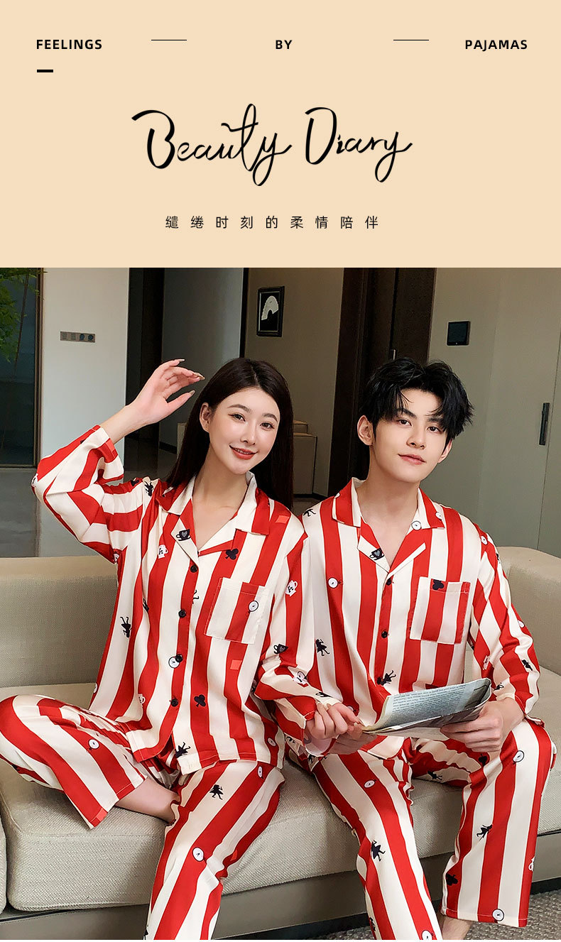 커플 잠옷 여성용 봄 가을 2025 신상 긴팔 아이스 실크 세트 인기 대형 남성용 스트라이프 홈웨어 도매스토어 가기
