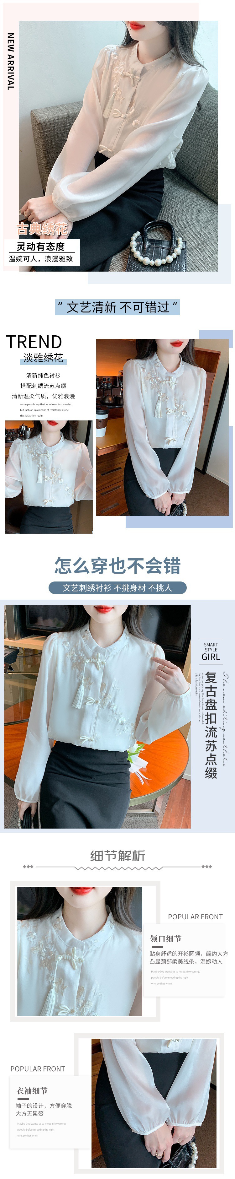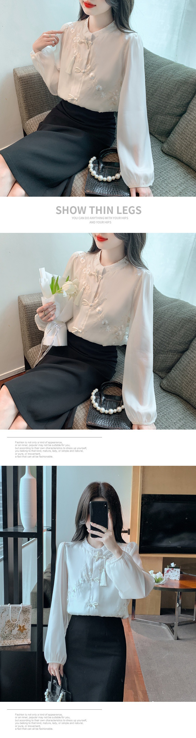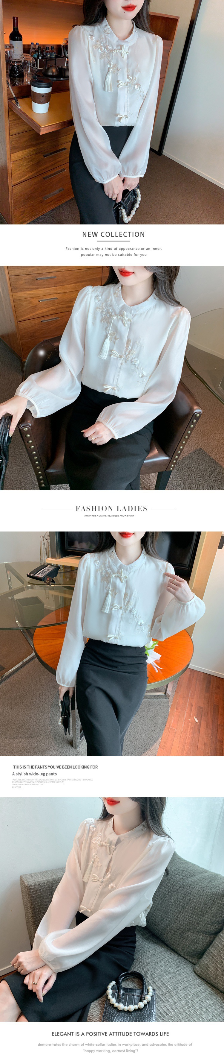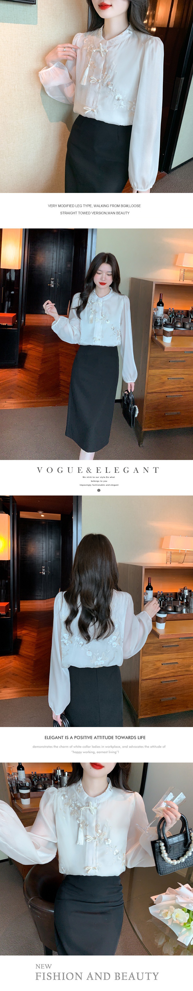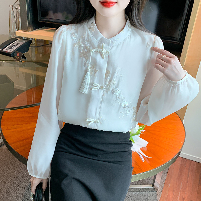 봄 2024 리얼 샷 ◆ ◆ 재고 ◆ 새로운 자수 랜턴 소매 레이스 업 스위트 쉬폰 레이디 셔츠스토어 가기