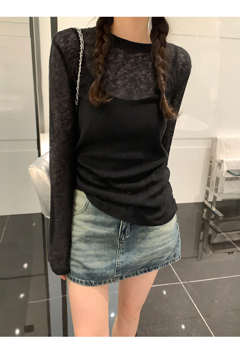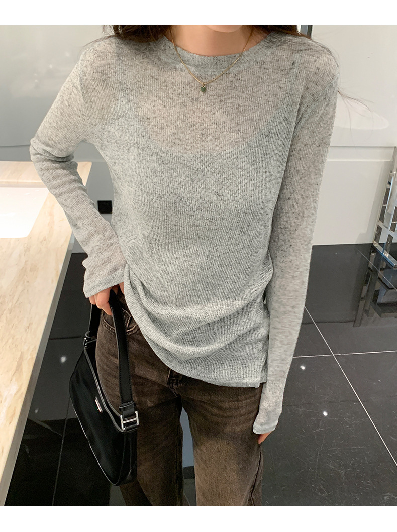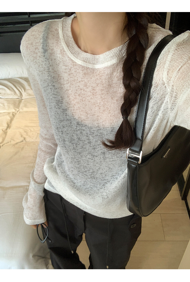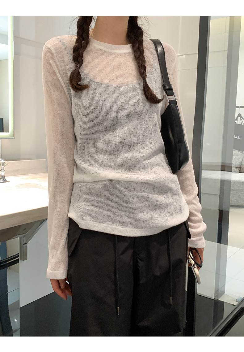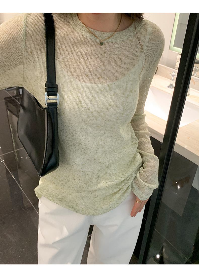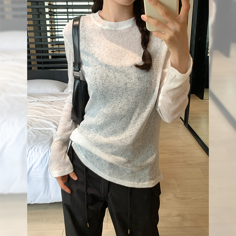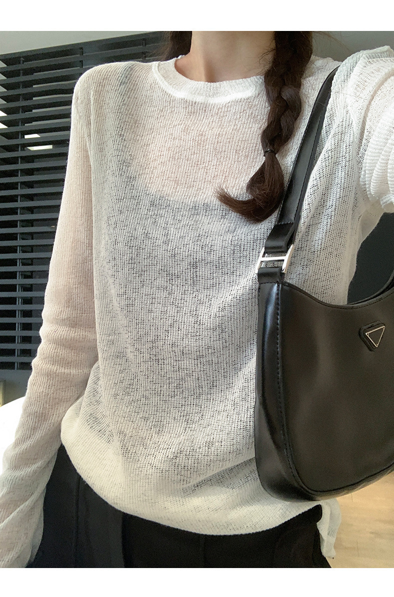 봄과 여름 게으른 니트 블라우스 탑 여성의 얇은 약간 투명한 외부 착용 고급 둥근 목 태양 보호 긴 소매