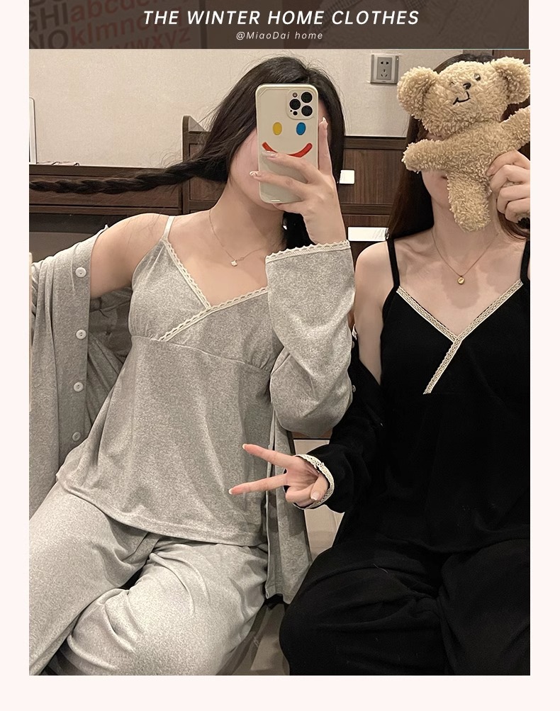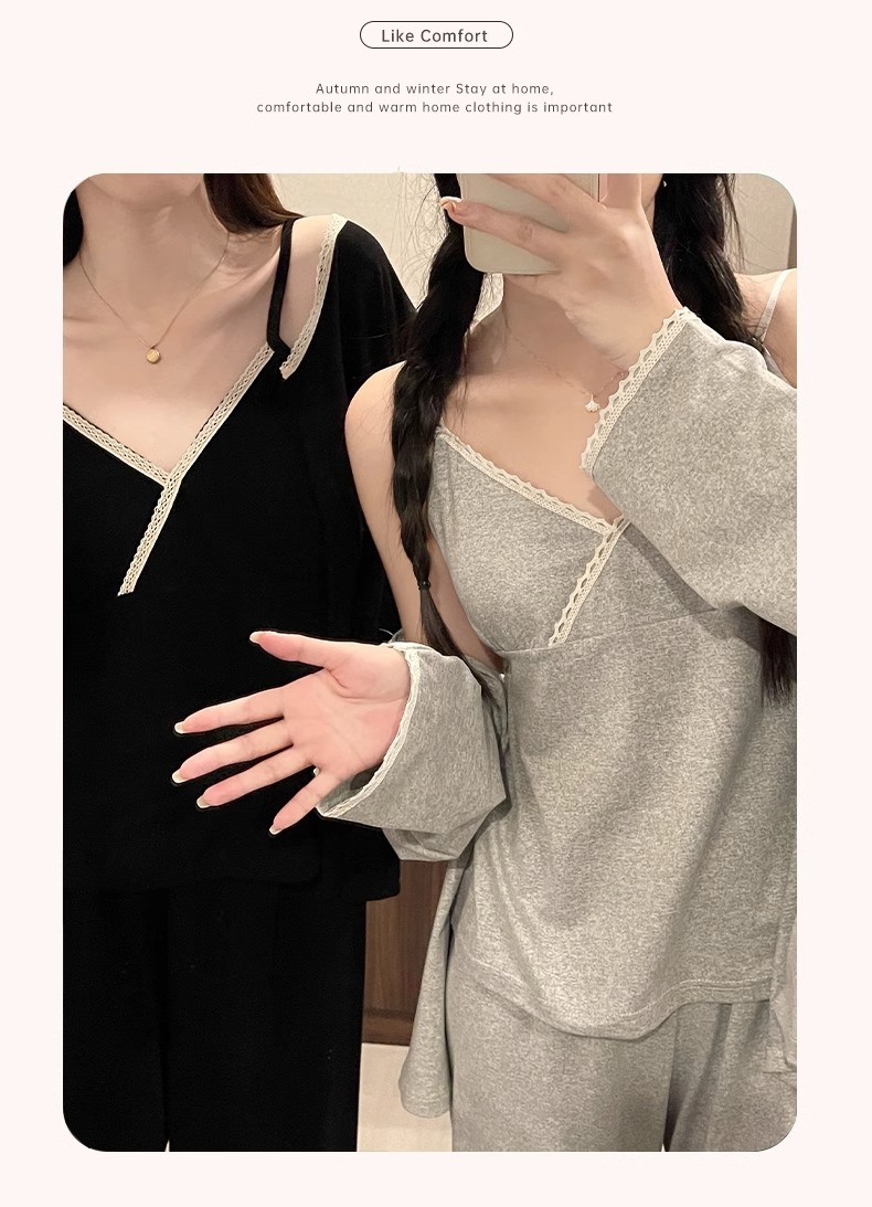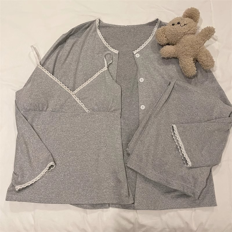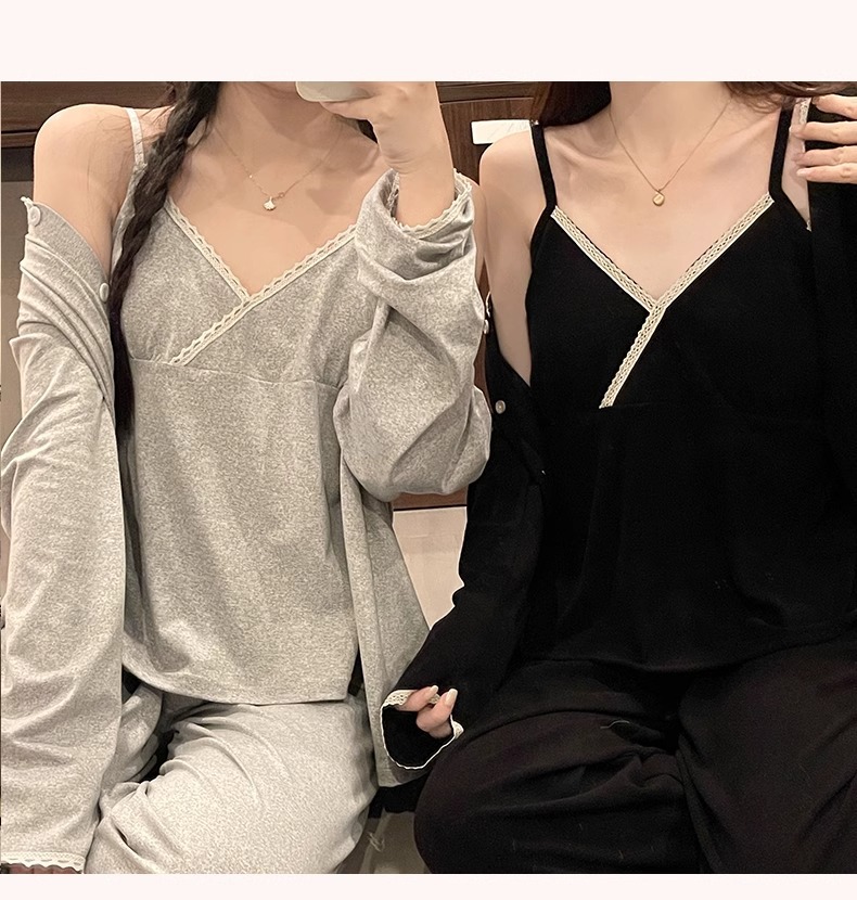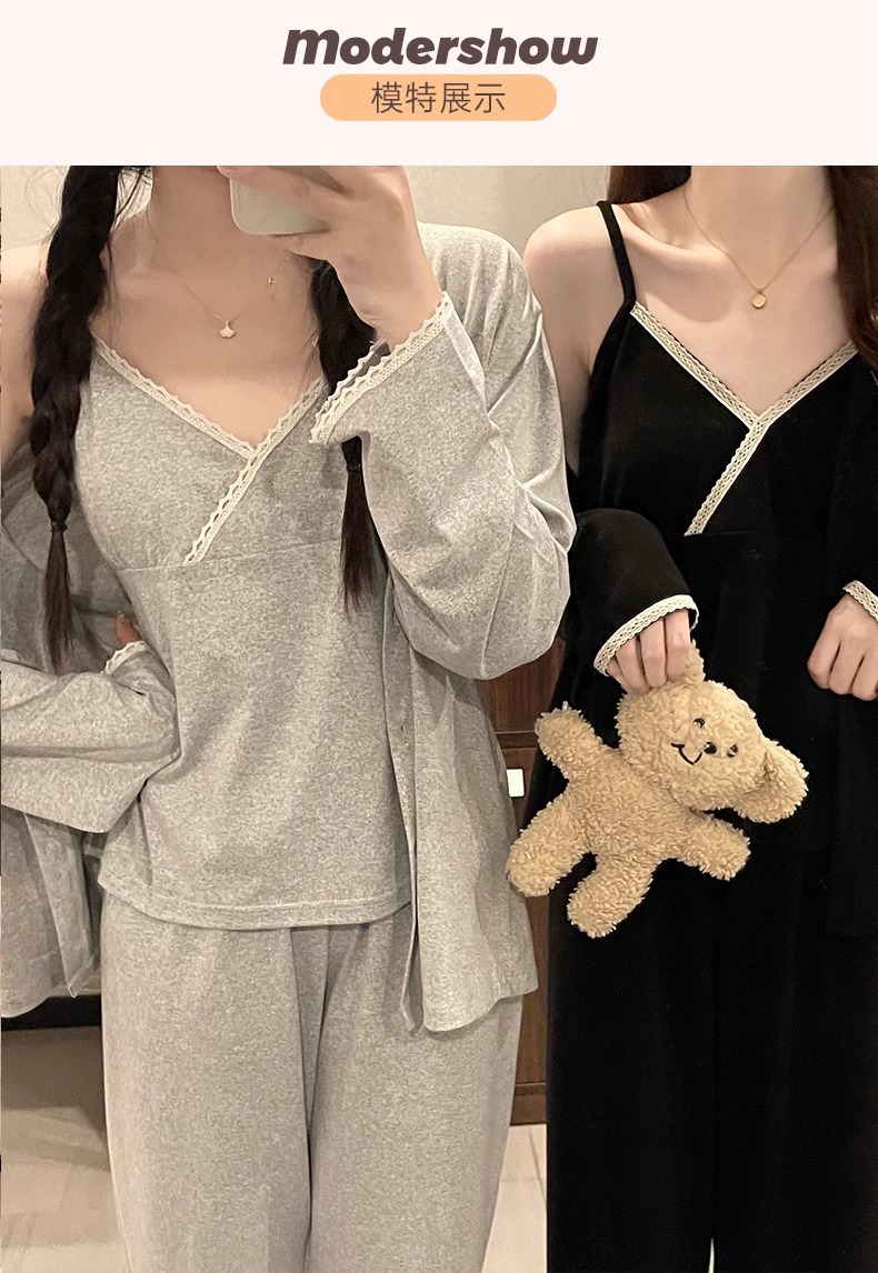 가슴 패드가 있는 여성용 잠옷 봄 가을 긴팔 얇은 레이스 슬립 3피스 세트 섹시하고 달콤한 홈웨어 신상품스토어 가기