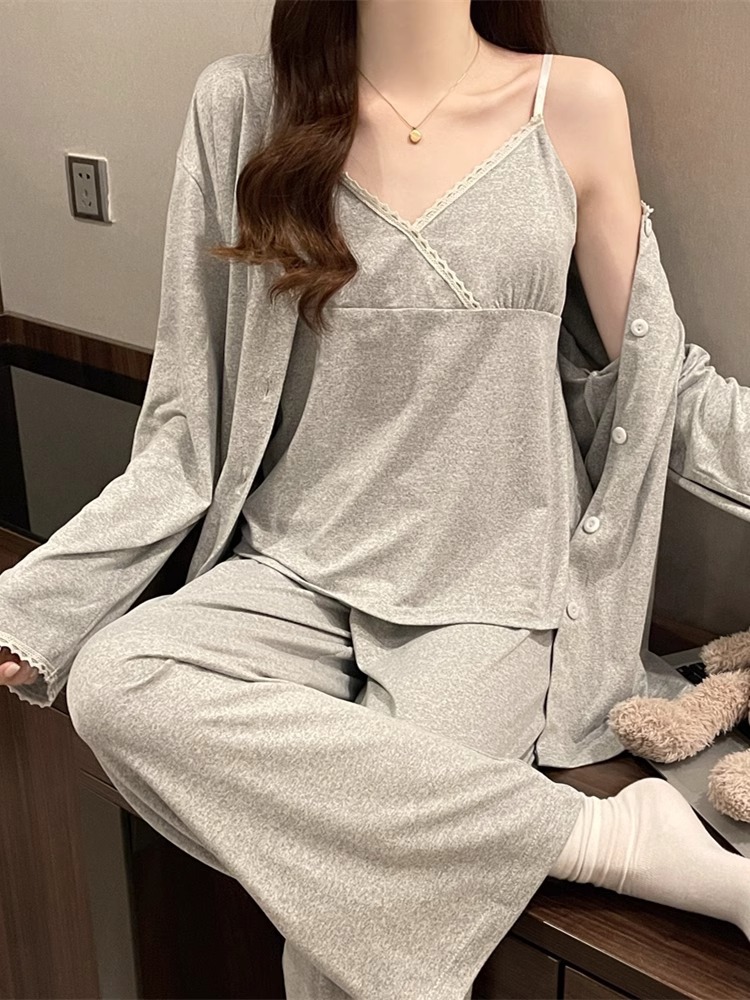 가슴 패드가 있는 여성용 잠옷 봄 가을 긴팔 얇은 레이스 슬립 3피스 세트 섹시하고 달콤한 홈웨어 신상품
