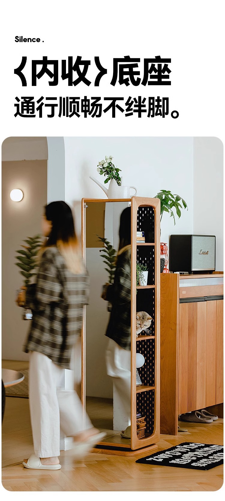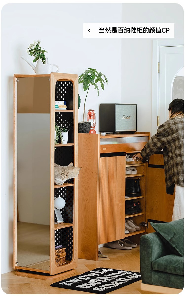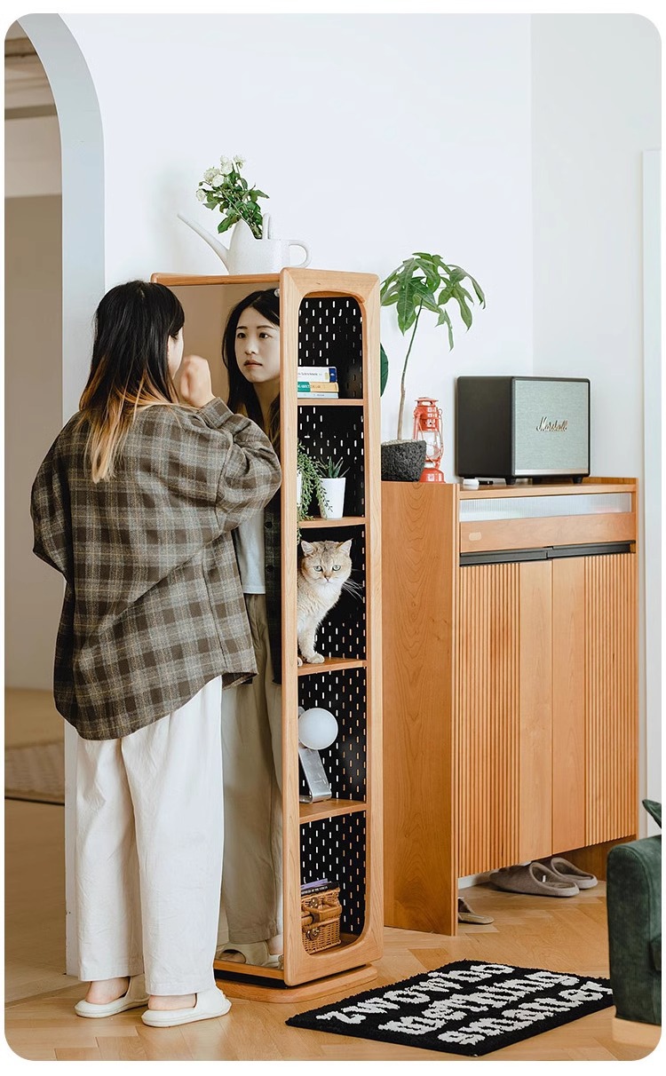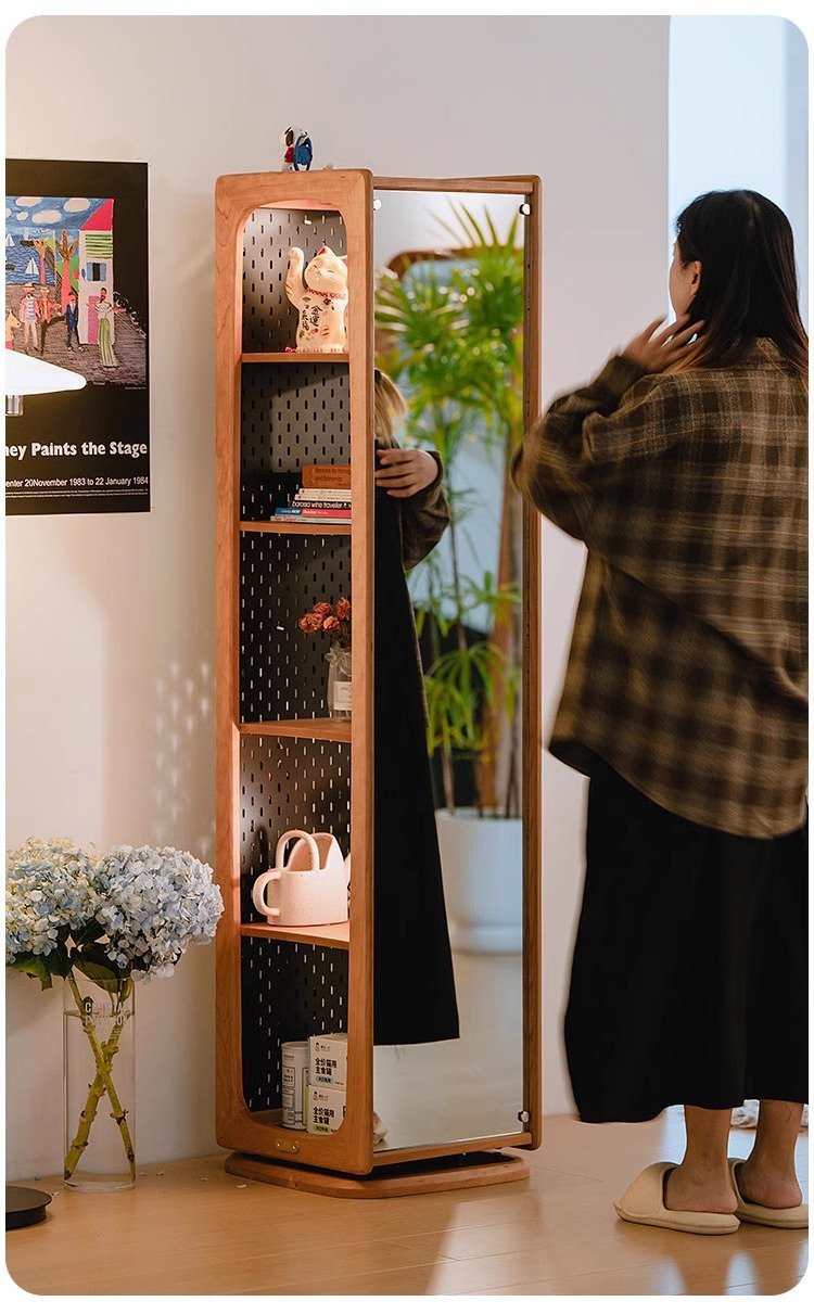 회전 드레싱 거울 단단한 나무 회전 책장 체리 나무 바닥 전신 거울 디스플레이 캐비닛 책장 보관 선반 책장