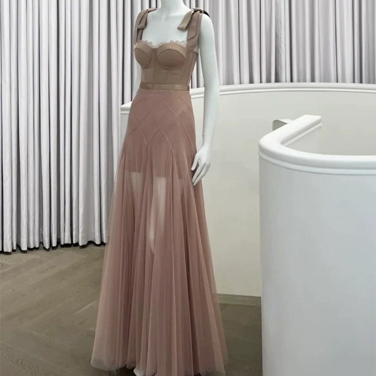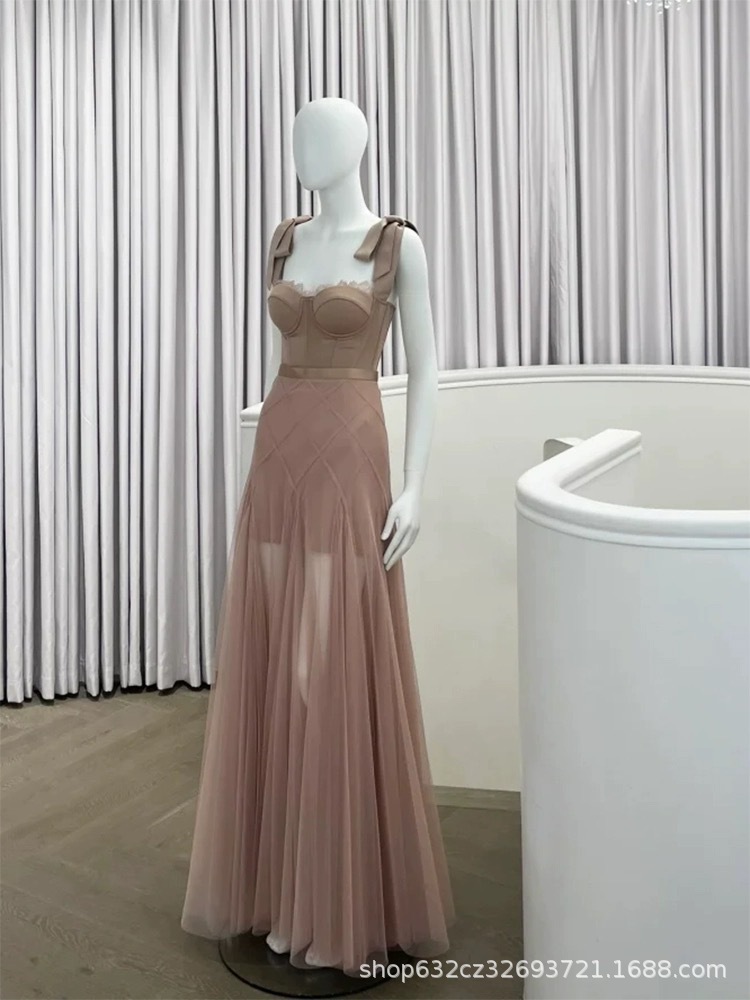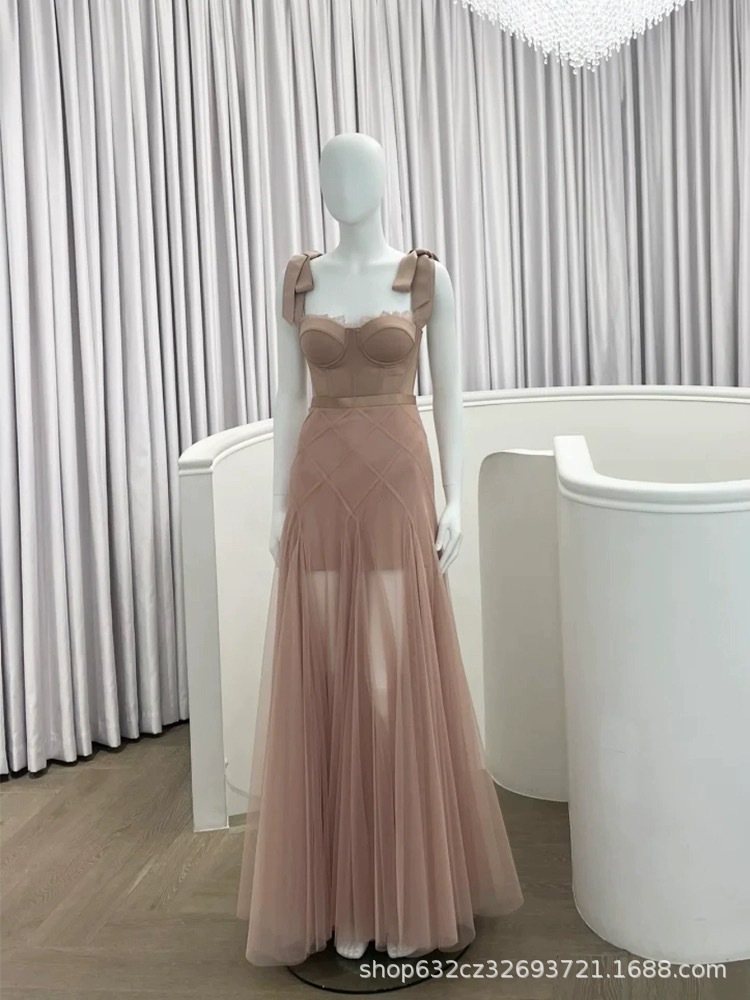 프랑스 스타일 샤넬 슬링 원피스 여성 2024 년 봄과 여름 새로운 하이 엔드 느낌 올해 인기있는 메쉬 원피스
