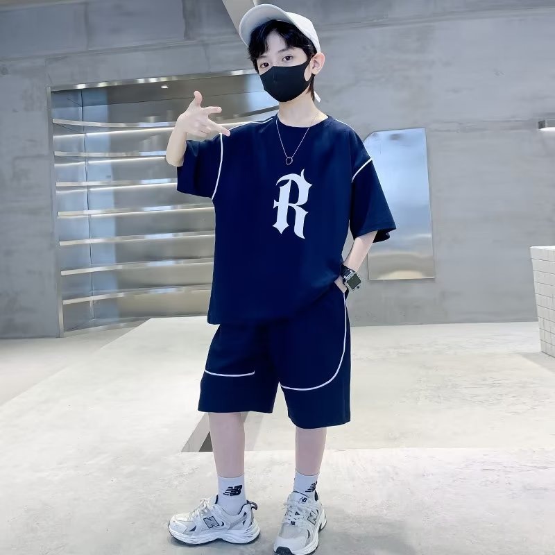 소년 여름 의류 세트 2024 새로운 중형 및 대형 어린이 튀김 스트리트 스포츠 넷 레드 짧은 소매 여름 아이들의 잘 생긴 여름 패션