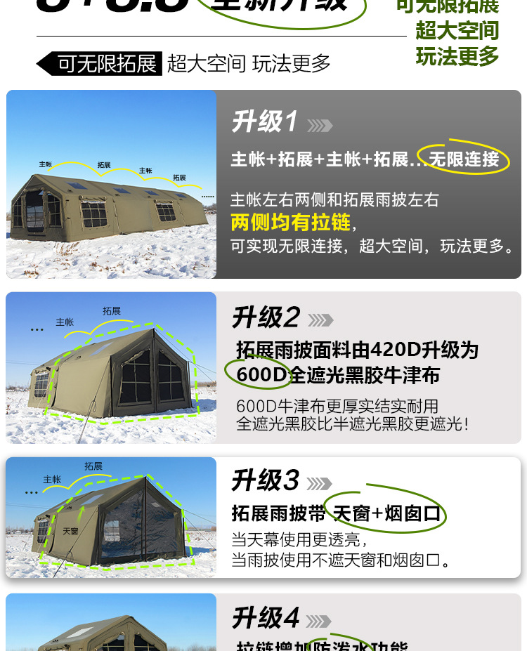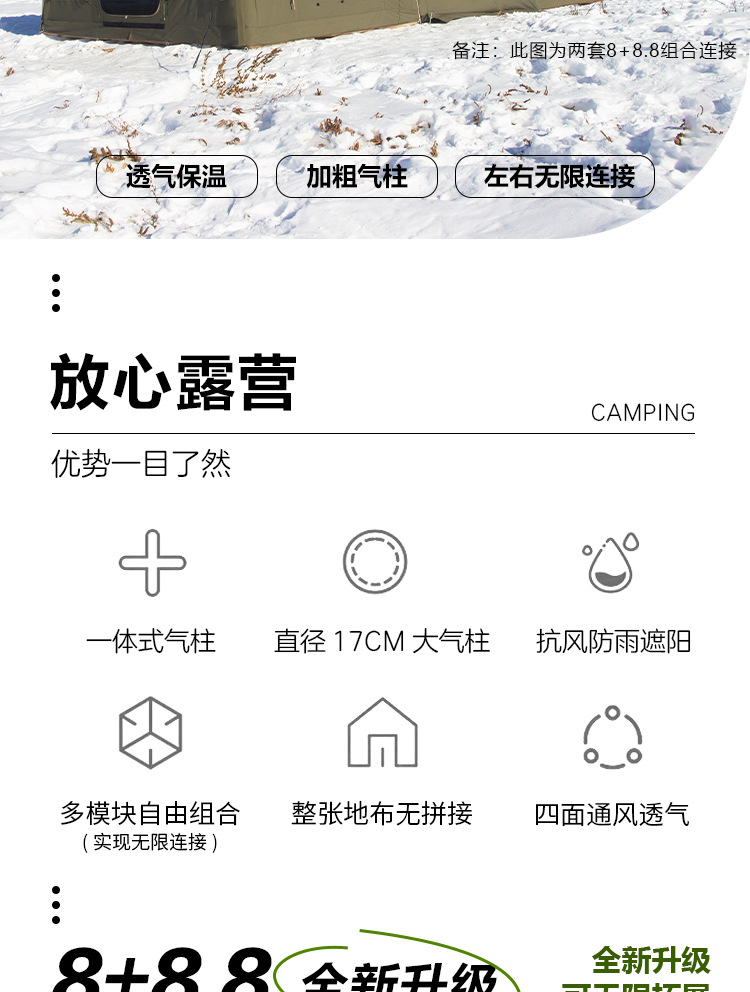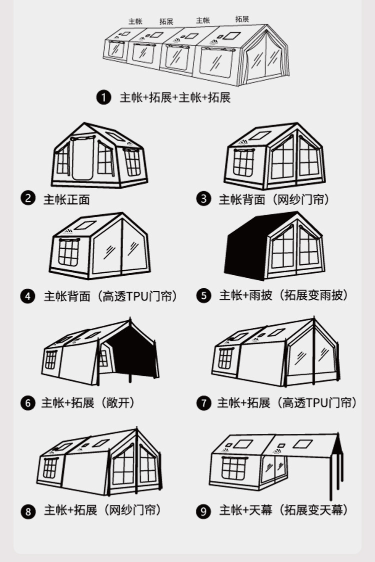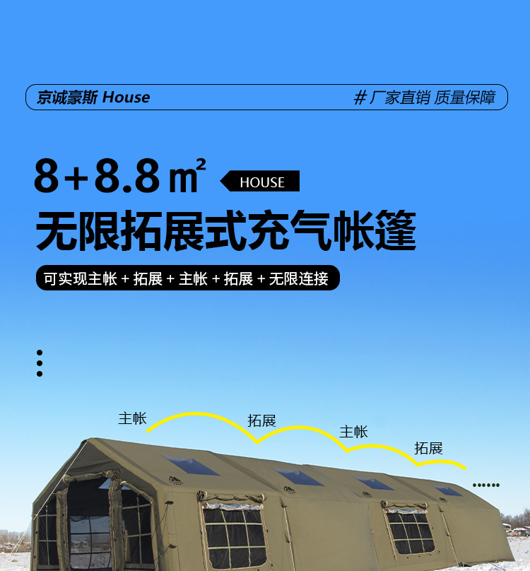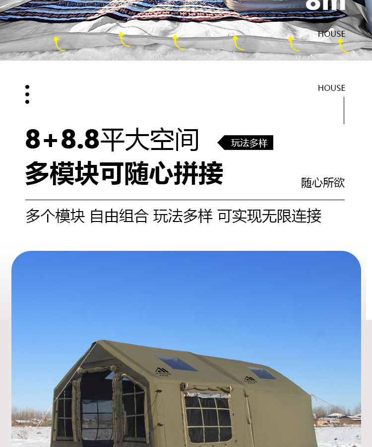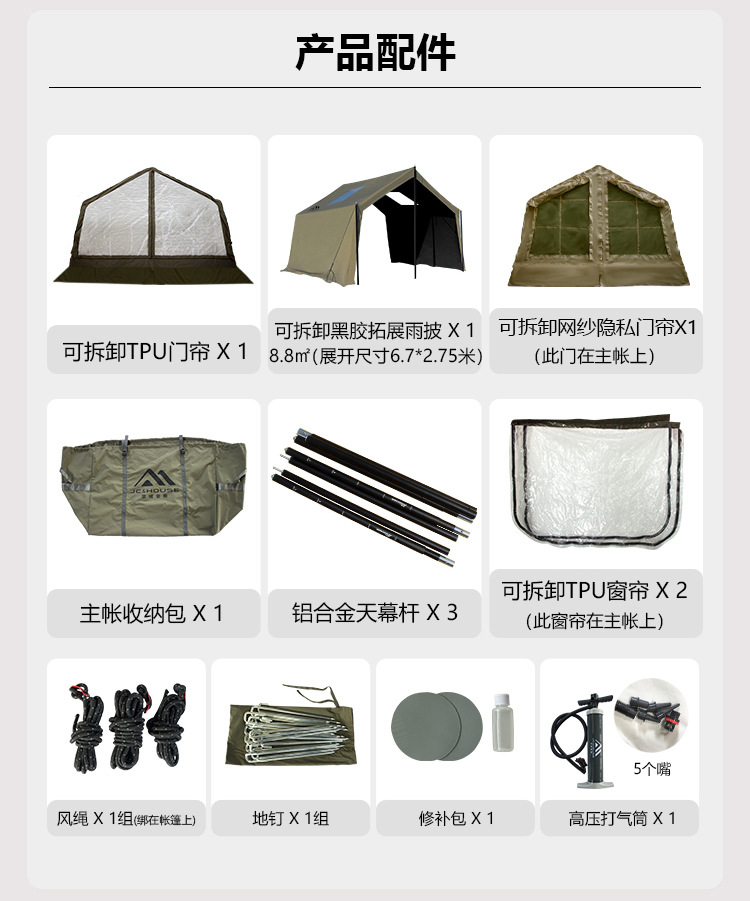 • 밀리터리 그린 8+8.8 ㎡ (확장된 공기 기둥 + 메인 텐트 + 확장 + 탈착식 TPU 커튼 + 캐노피 폴 3개의 전체 세트) (5일 이내 배송)