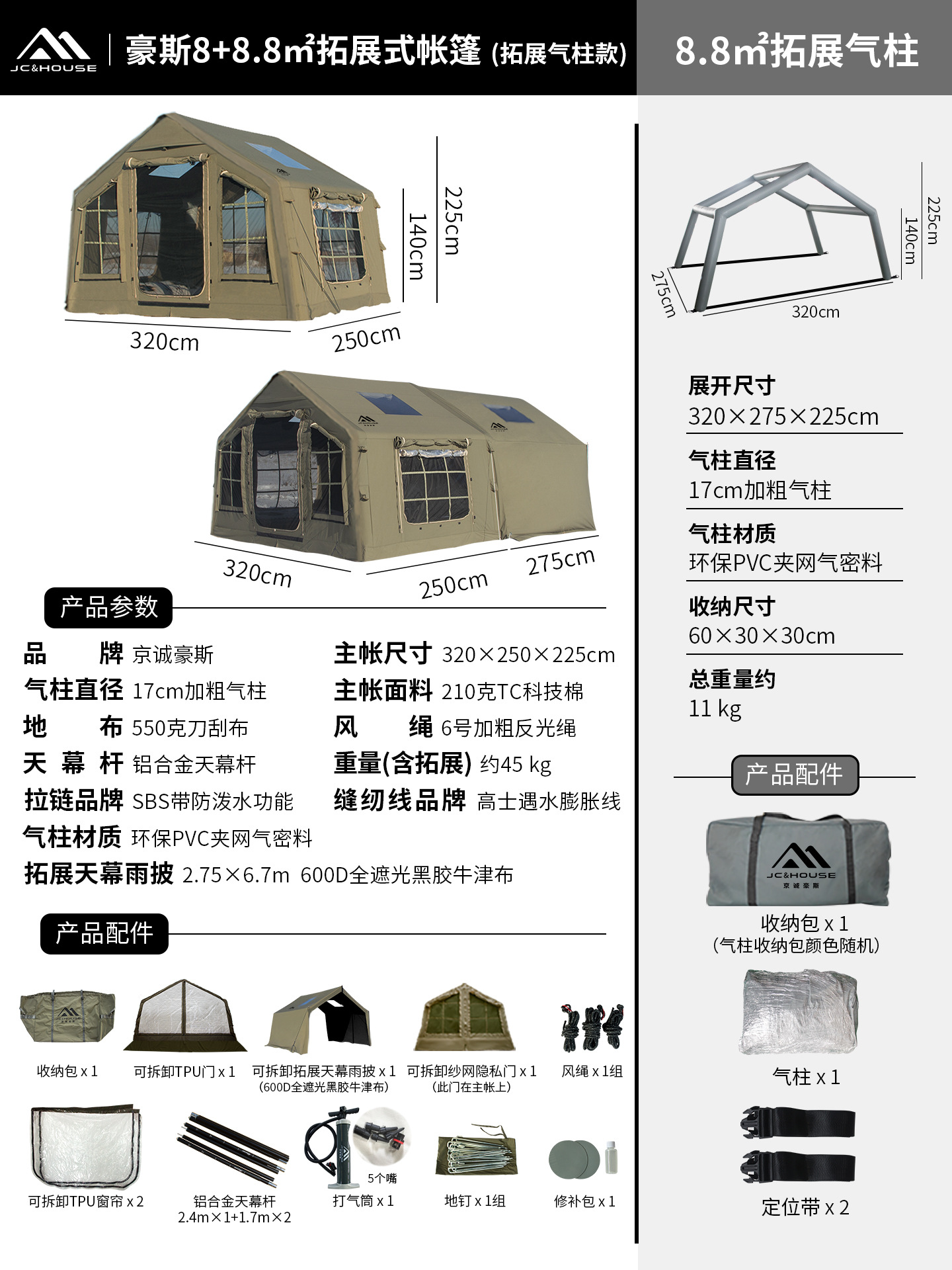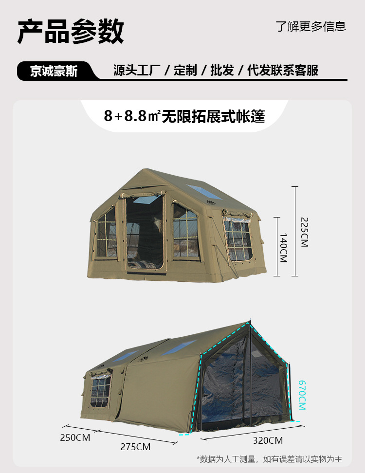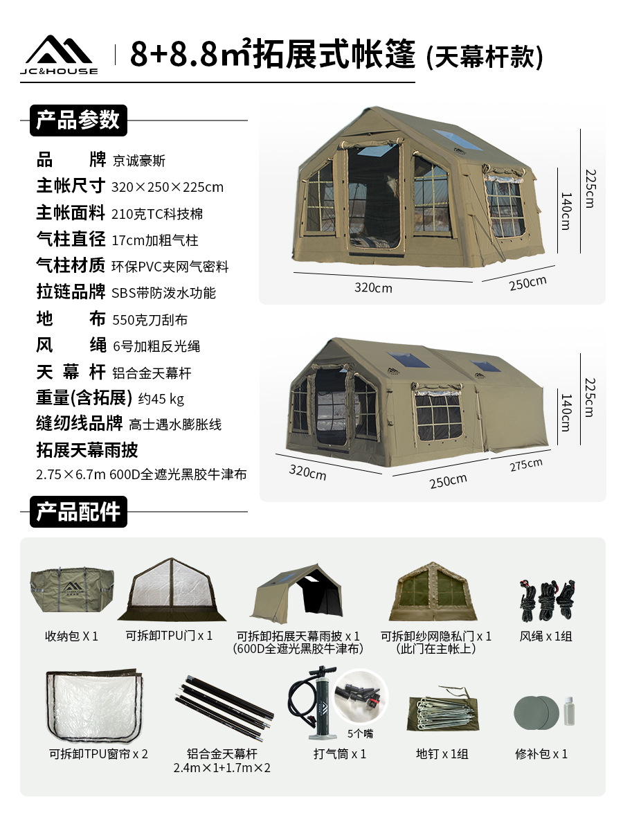 징청하우스JcHouse8+8.8 ㎡ 에어텐트 캠핑 캠핑지 확장형 루프텐트