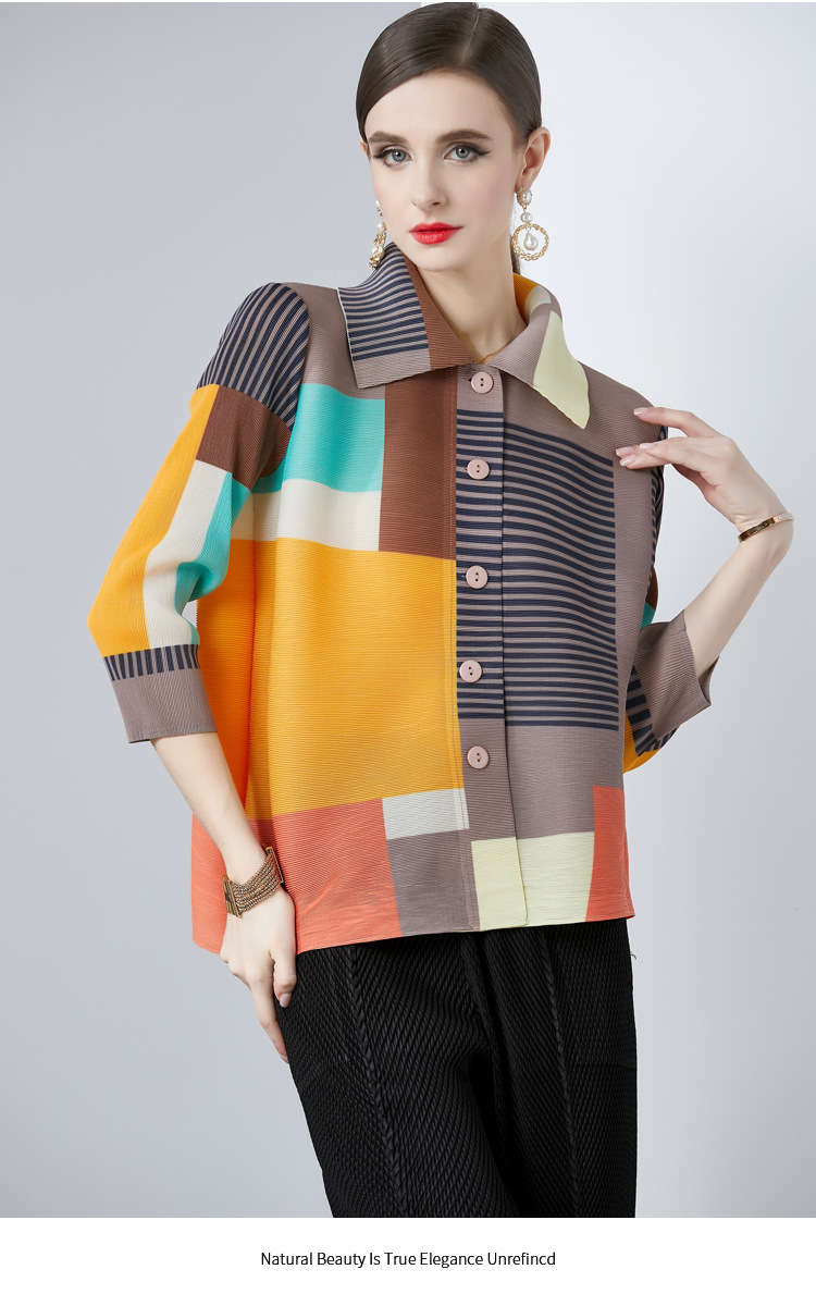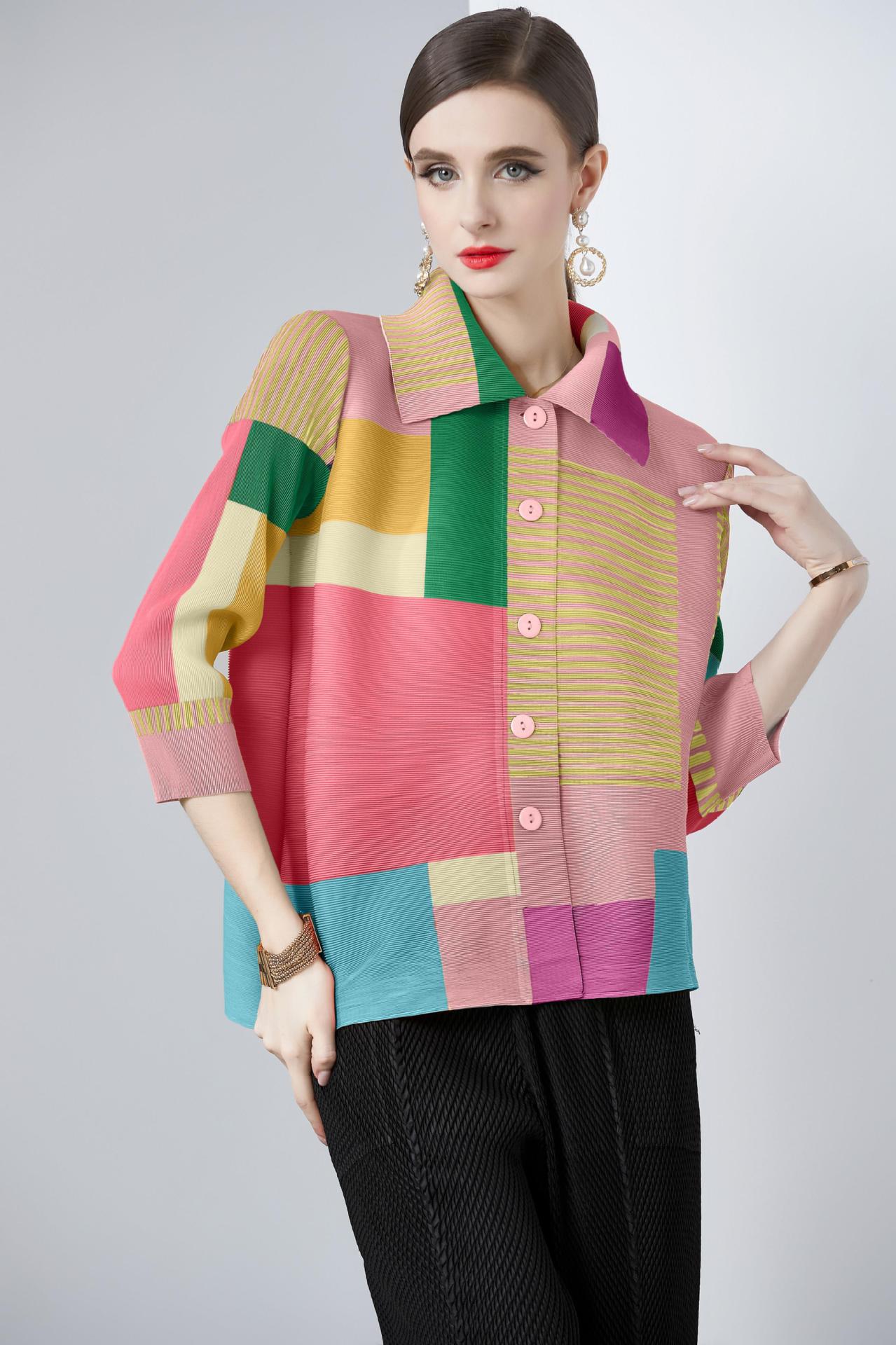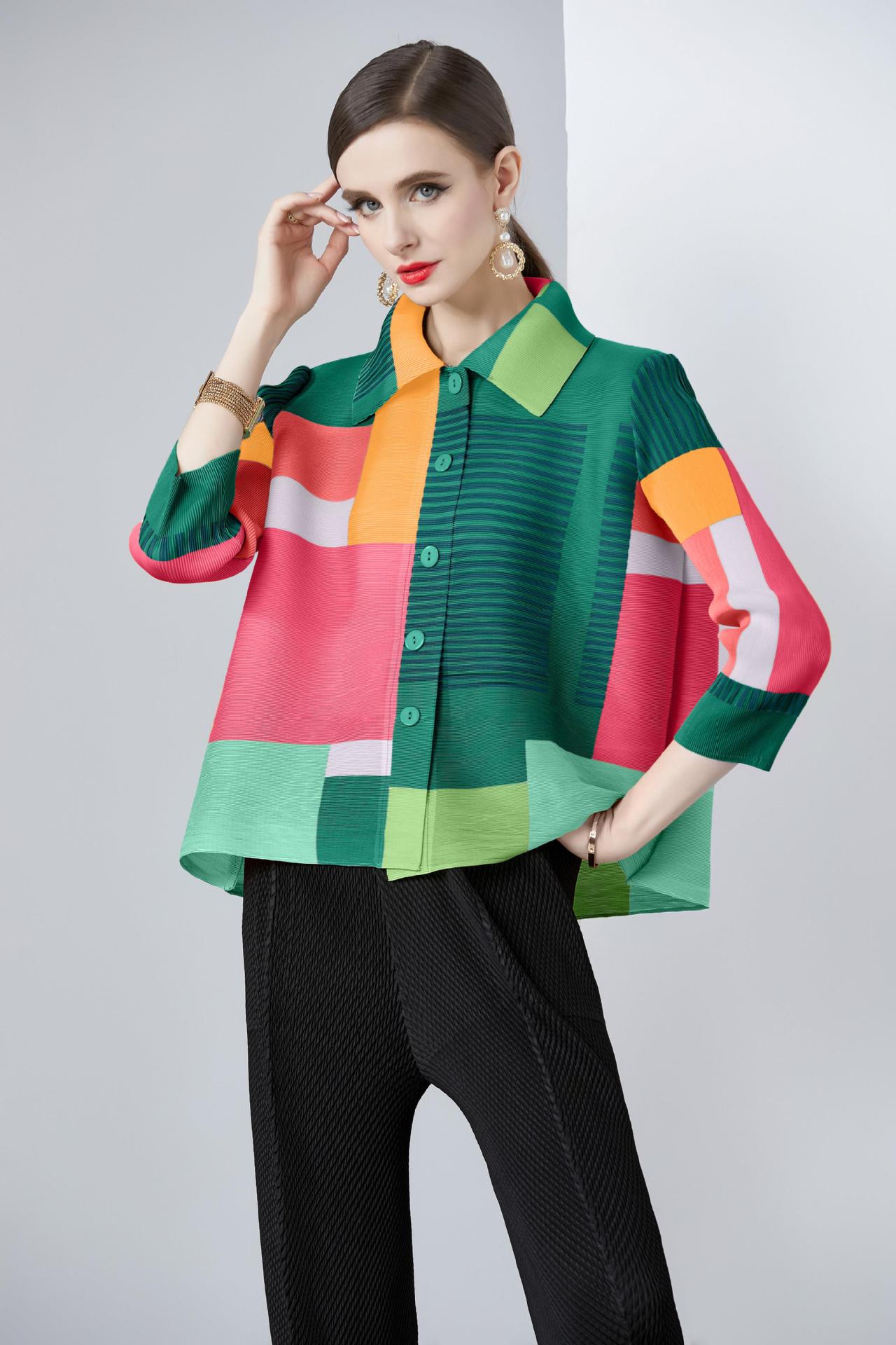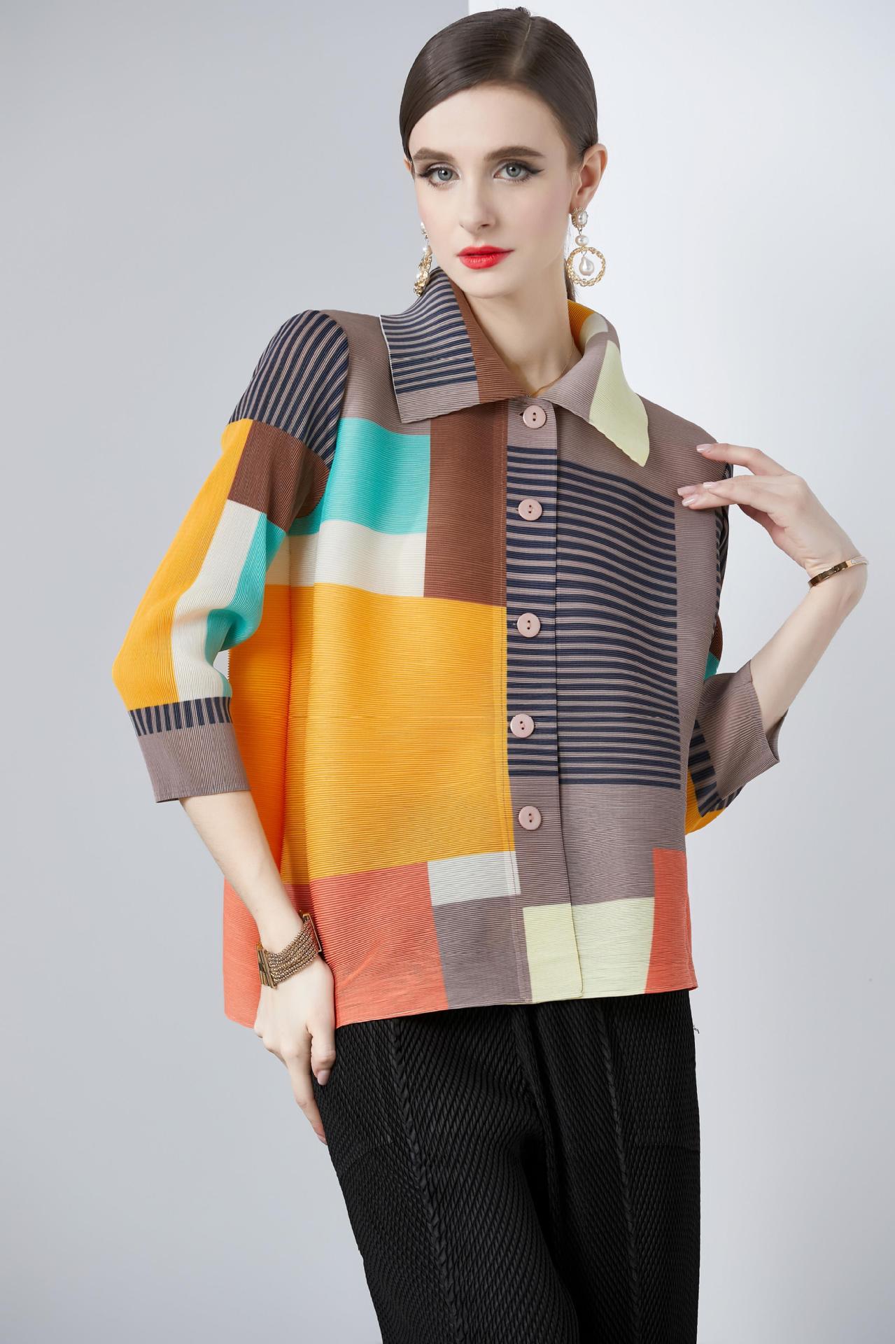 5611 리얼 샷 봄과 여름 새로운 여성의 주름 컬러 블록 인쇄 우아한 유행 작은 재킷 캐주얼 루즈 셔츠