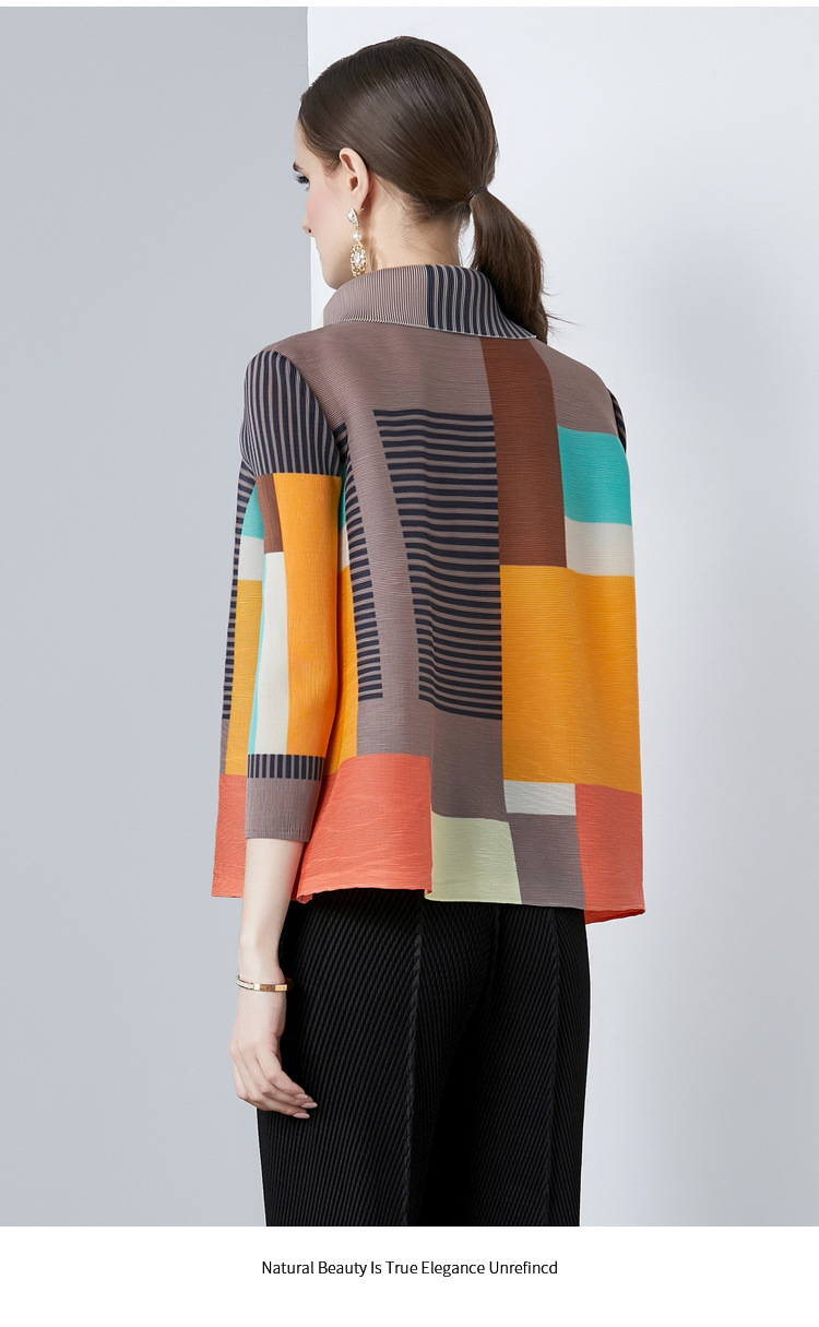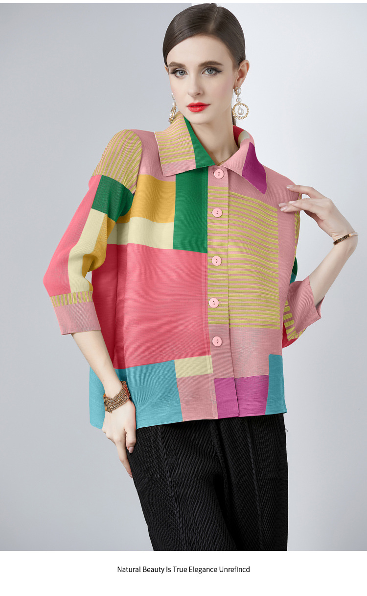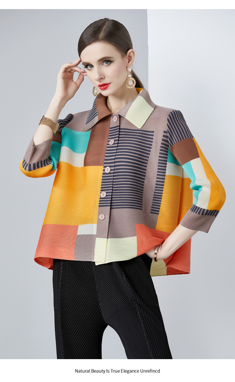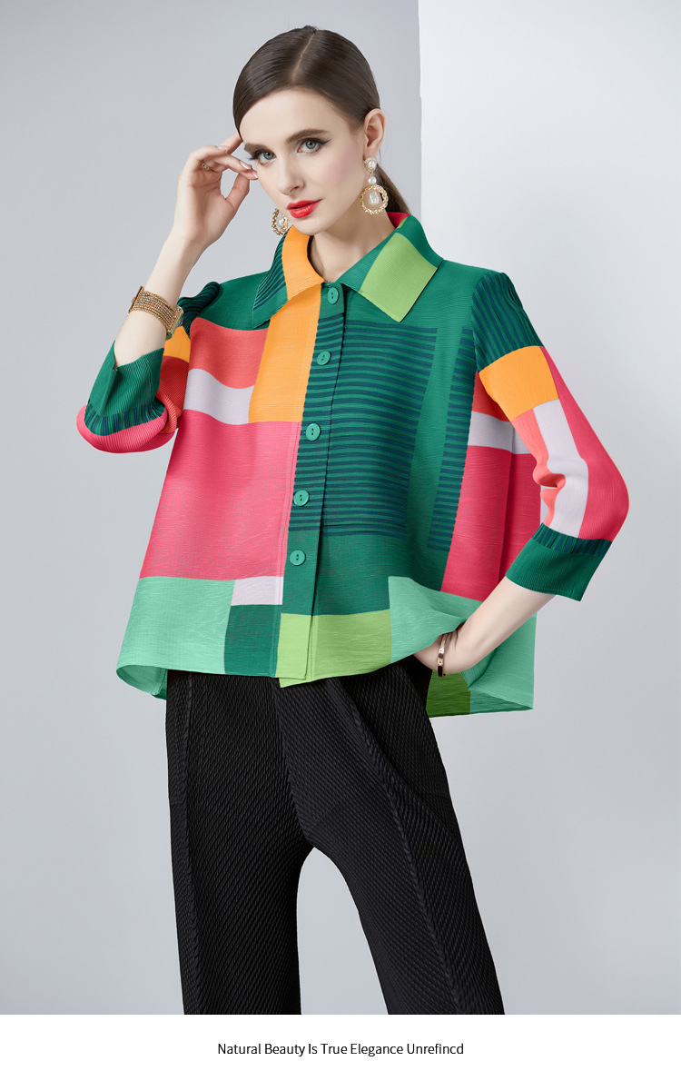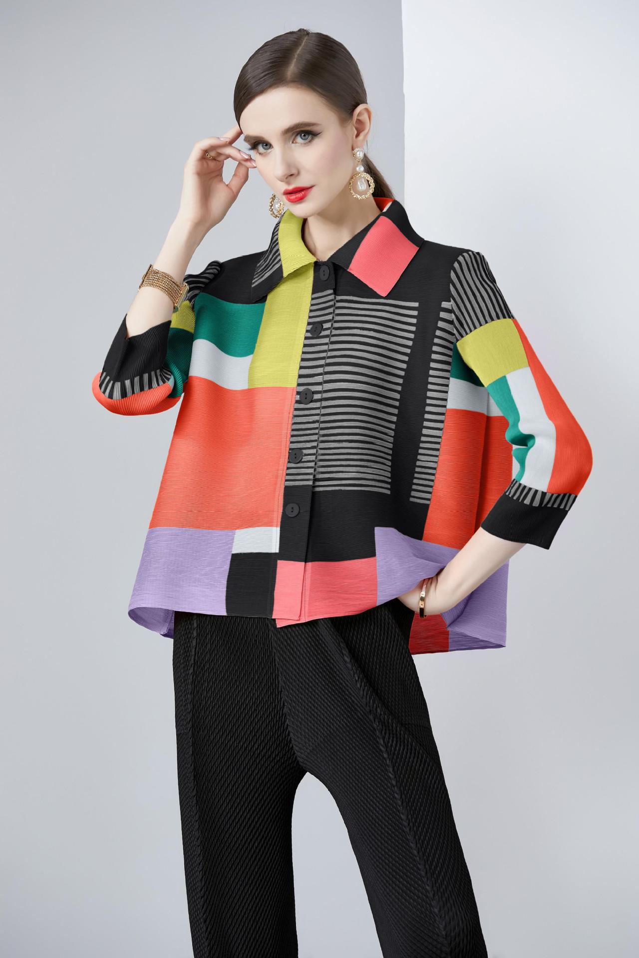 5611 리얼 샷 봄과 여름 새로운 여성의 주름 컬러 블록 인쇄 우아한 유행 작은 재킷 캐주얼 루즈 셔츠