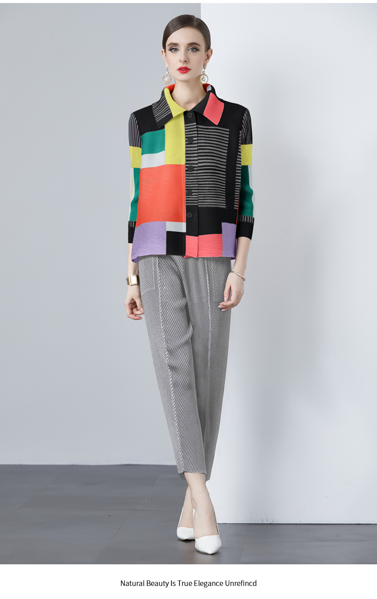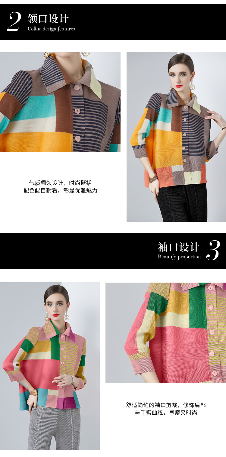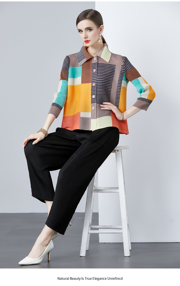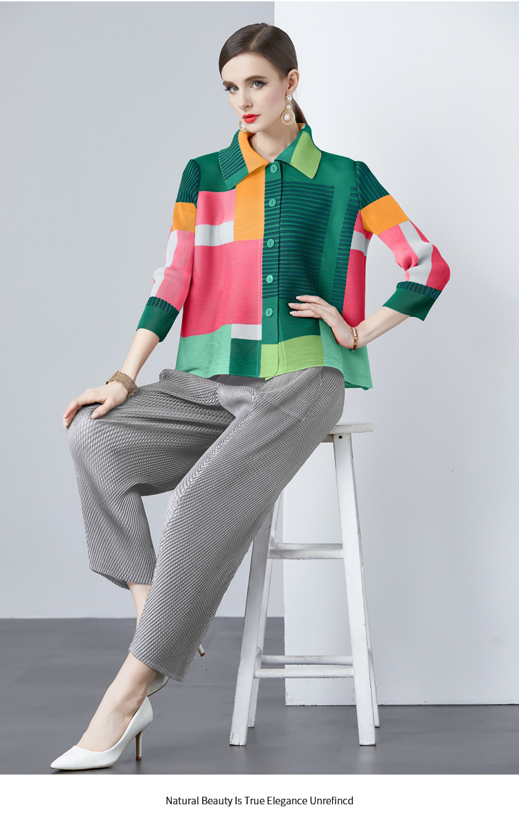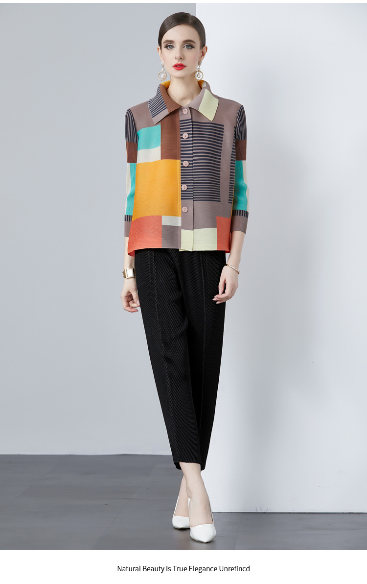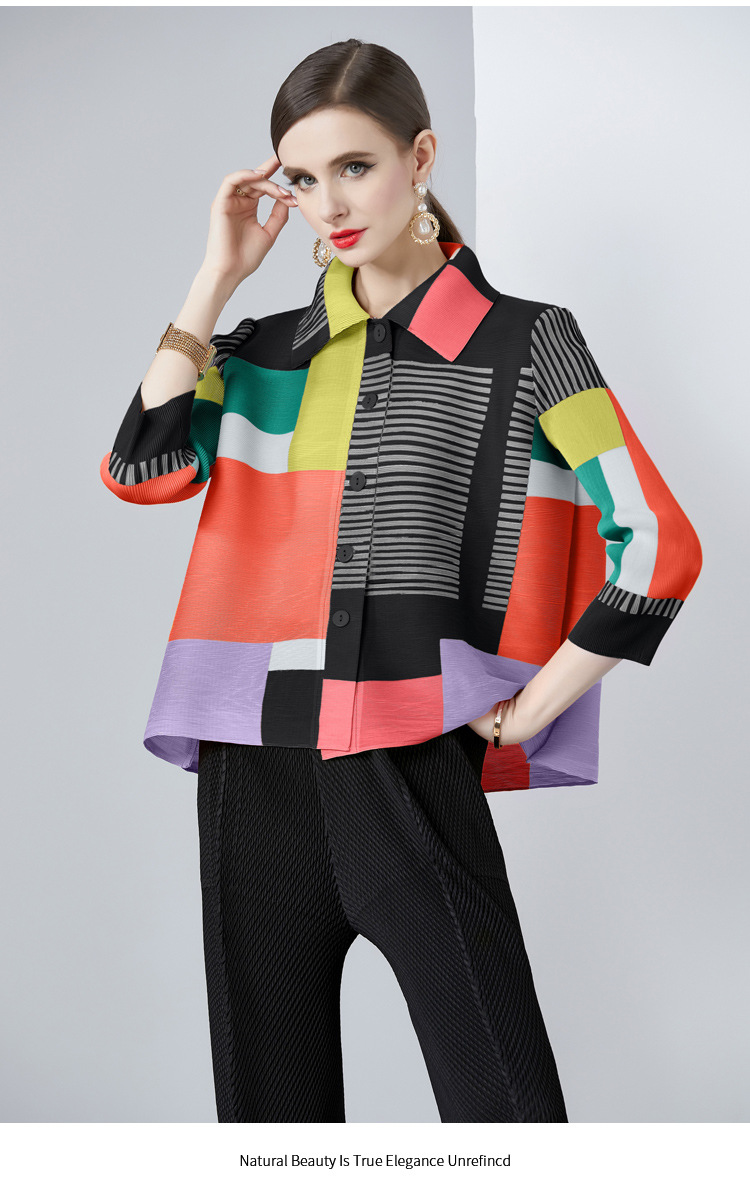 5611 리얼 샷 봄과 여름 새로운 여성의 주름 컬러 블록 인쇄 우아한 유행 작은 재킷 캐주얼 루즈 셔츠
