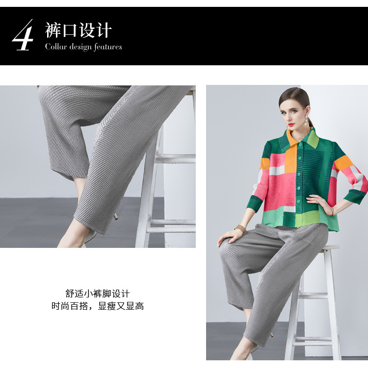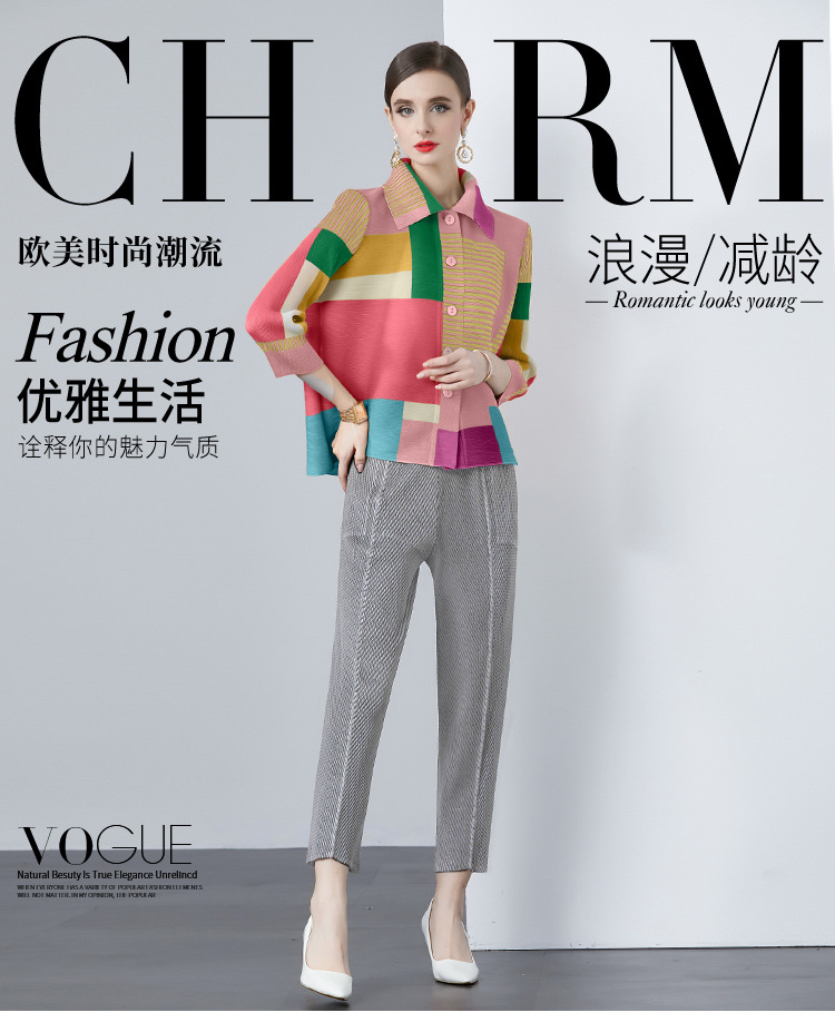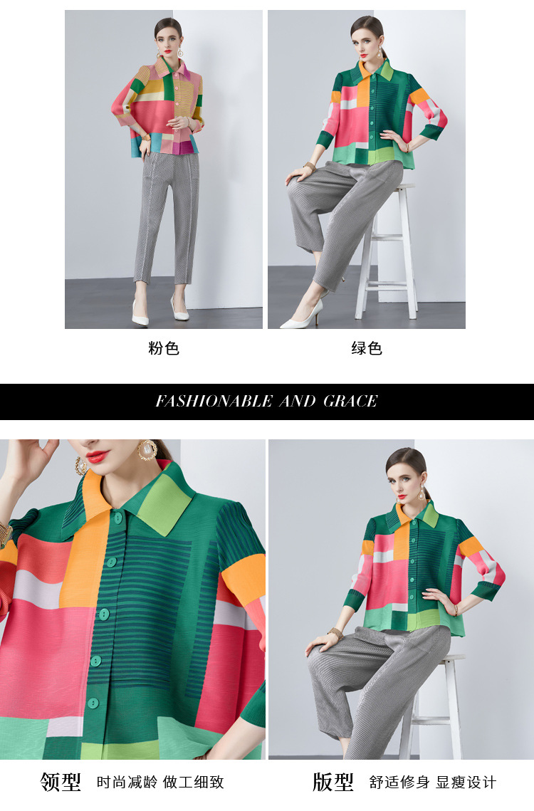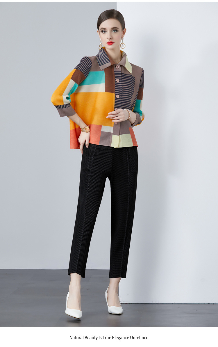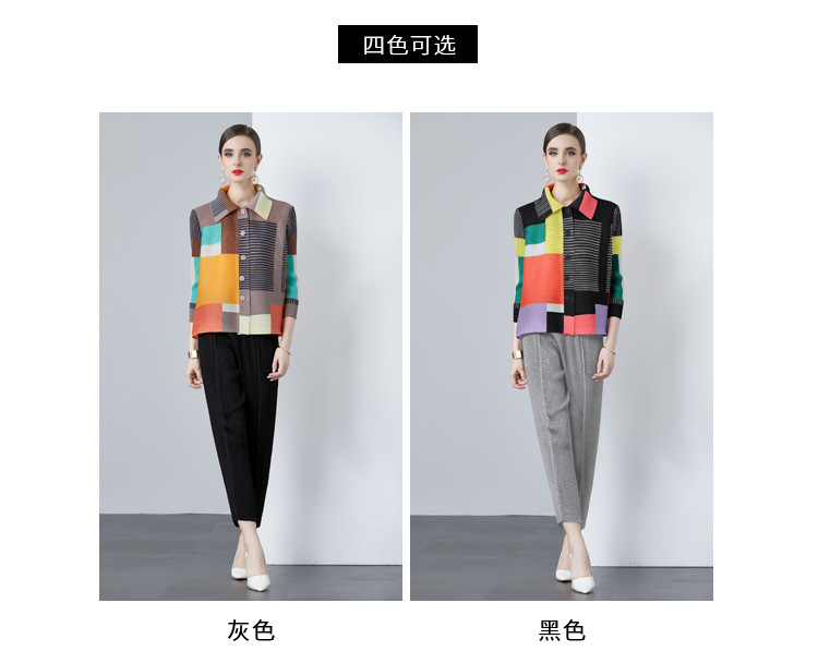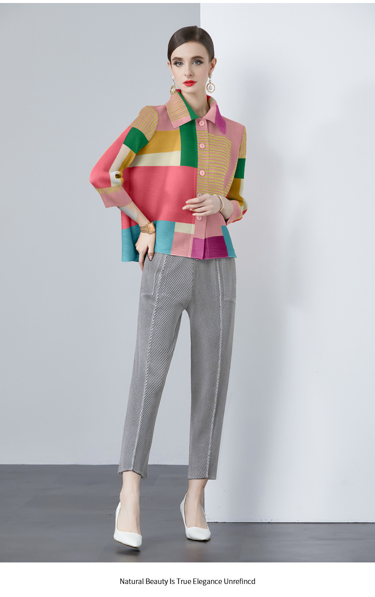 5611 리얼 샷 봄과 여름 새로운 여성의 주름 컬러 블록 인쇄 우아한 유행 작은 재킷 캐주얼 루즈 셔츠