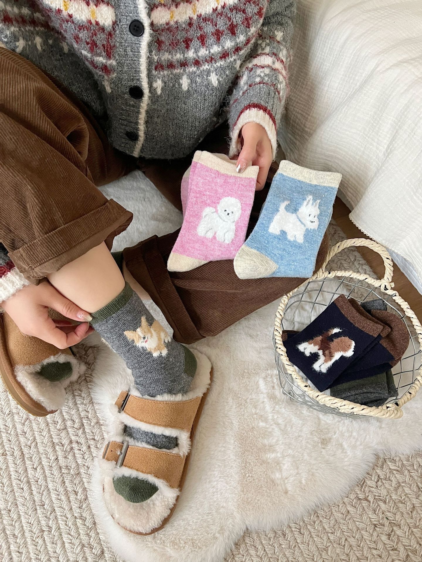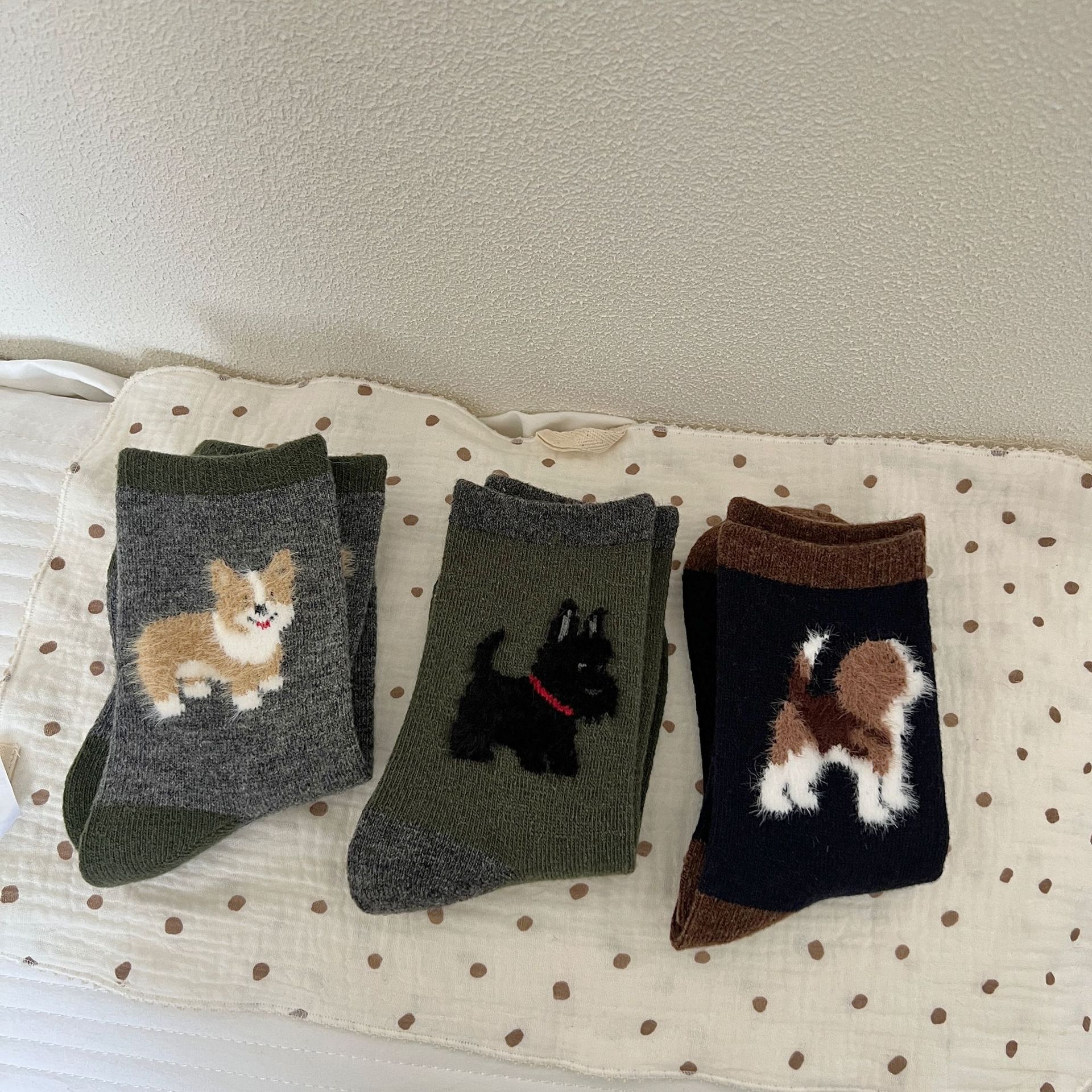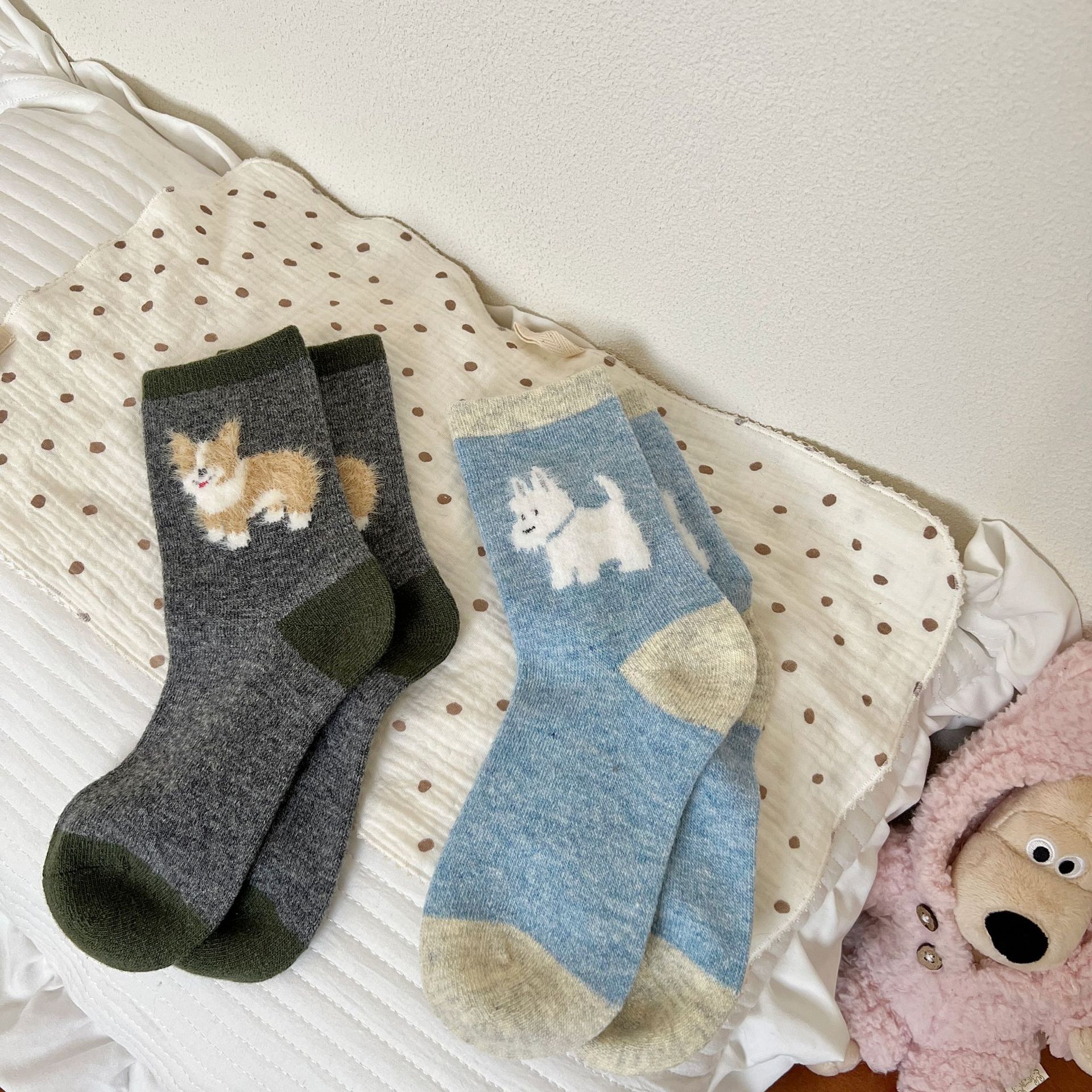 봄과 가을 양모 강아지 만화 양말 귀여운 바람 다섯 개 무리는 학문적 바람 색상 매칭 파일 양말스토어 가기