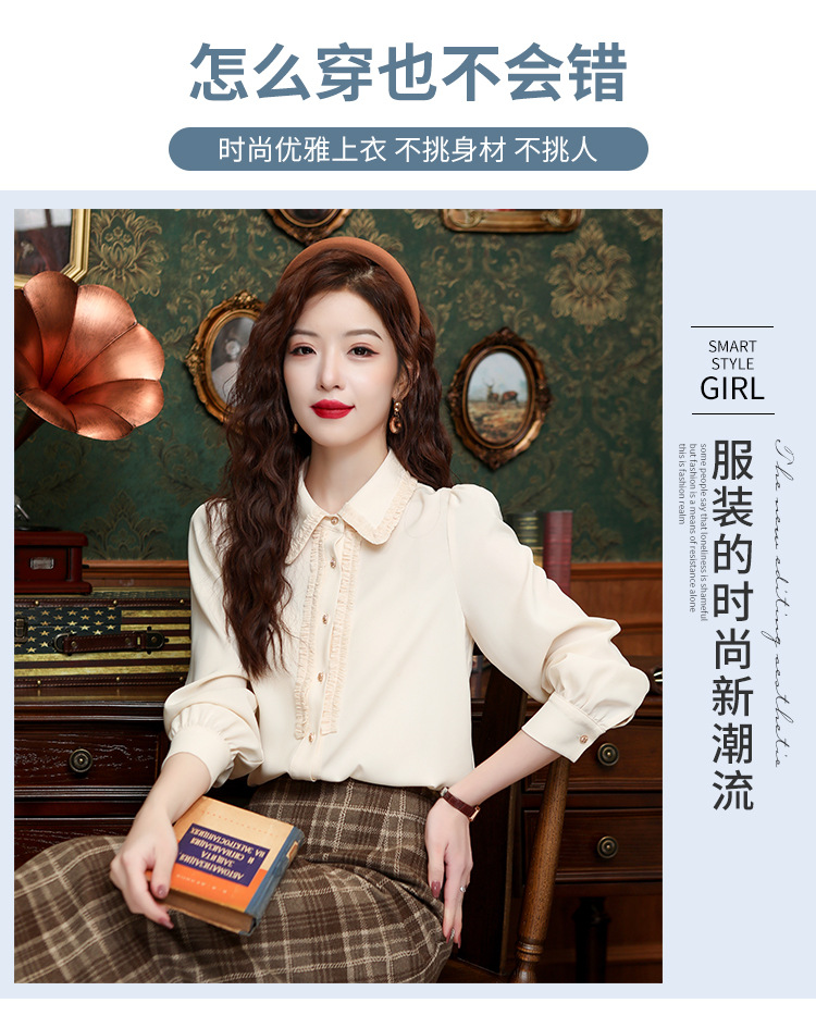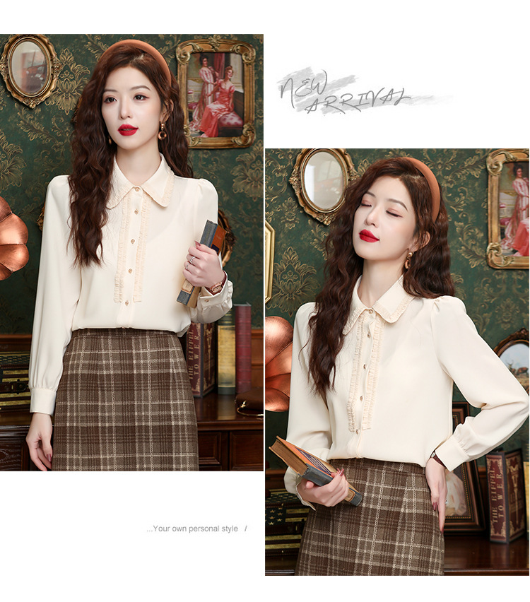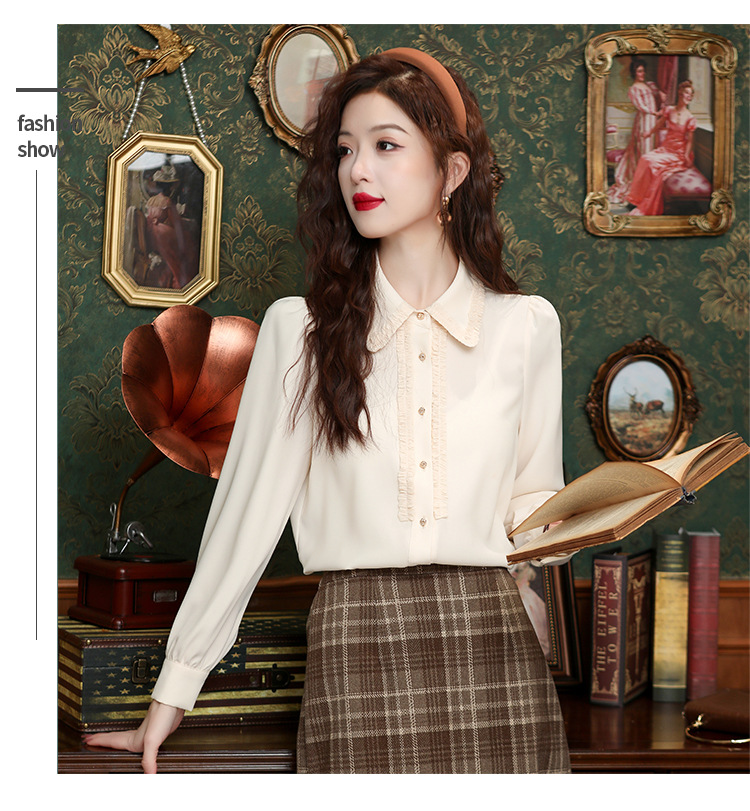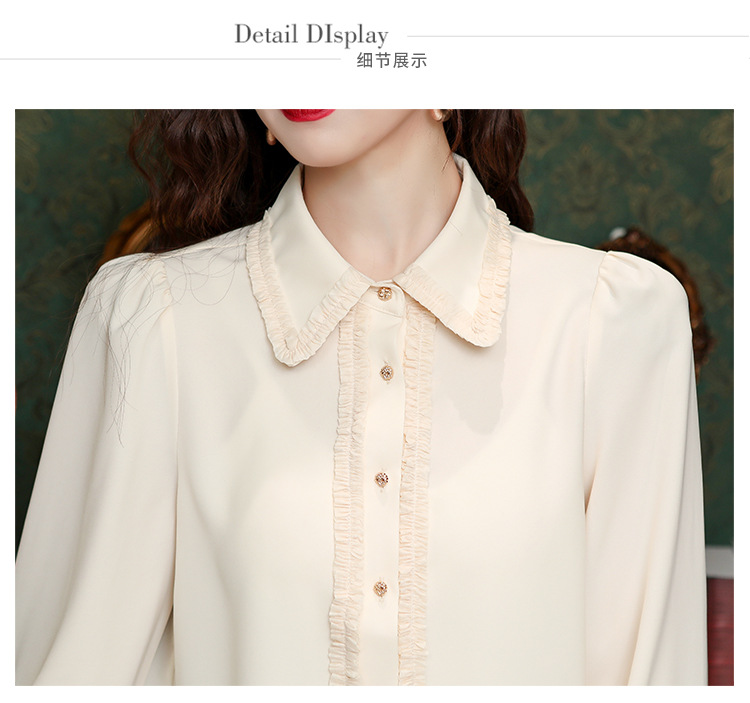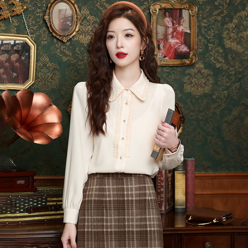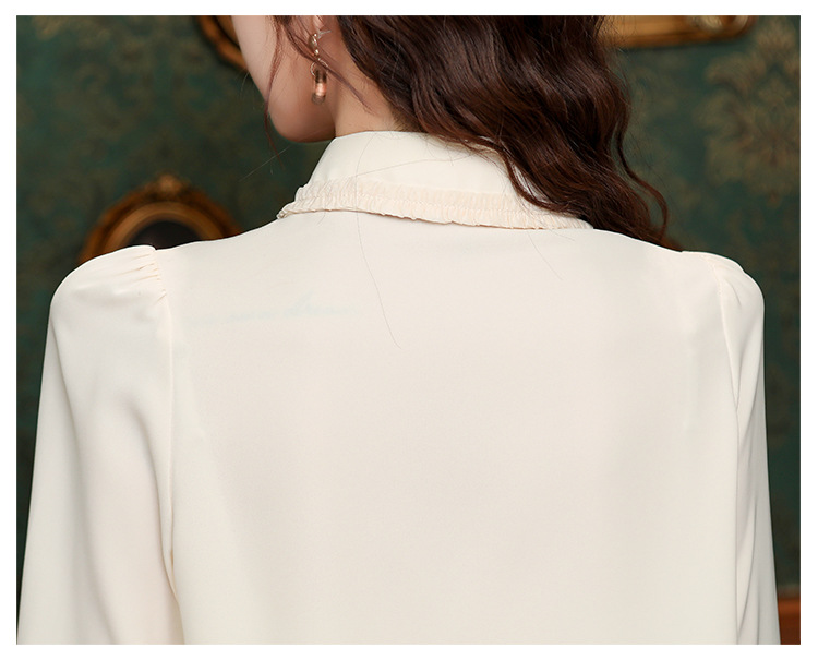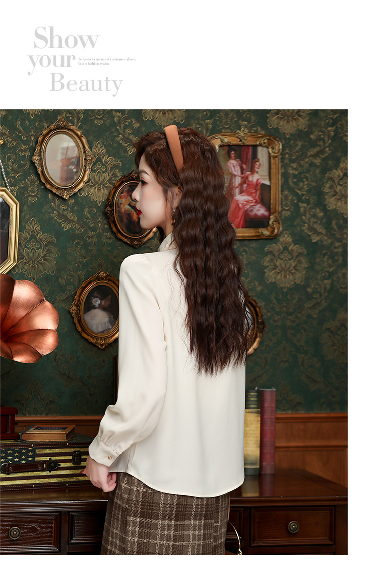 나무 귀 인형 칼라 쉬폰 셔츠 새틴 셔츠 여성 긴 소매 2024 봄과 가을 새로운 OL 기질 작은 셔츠 도매스토어 가기