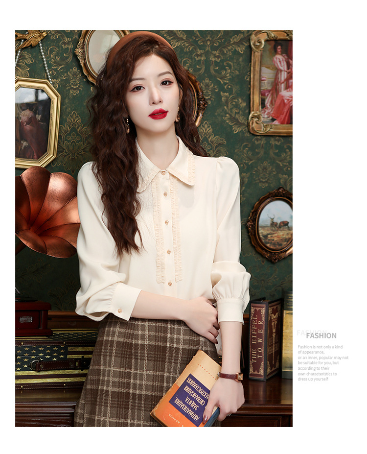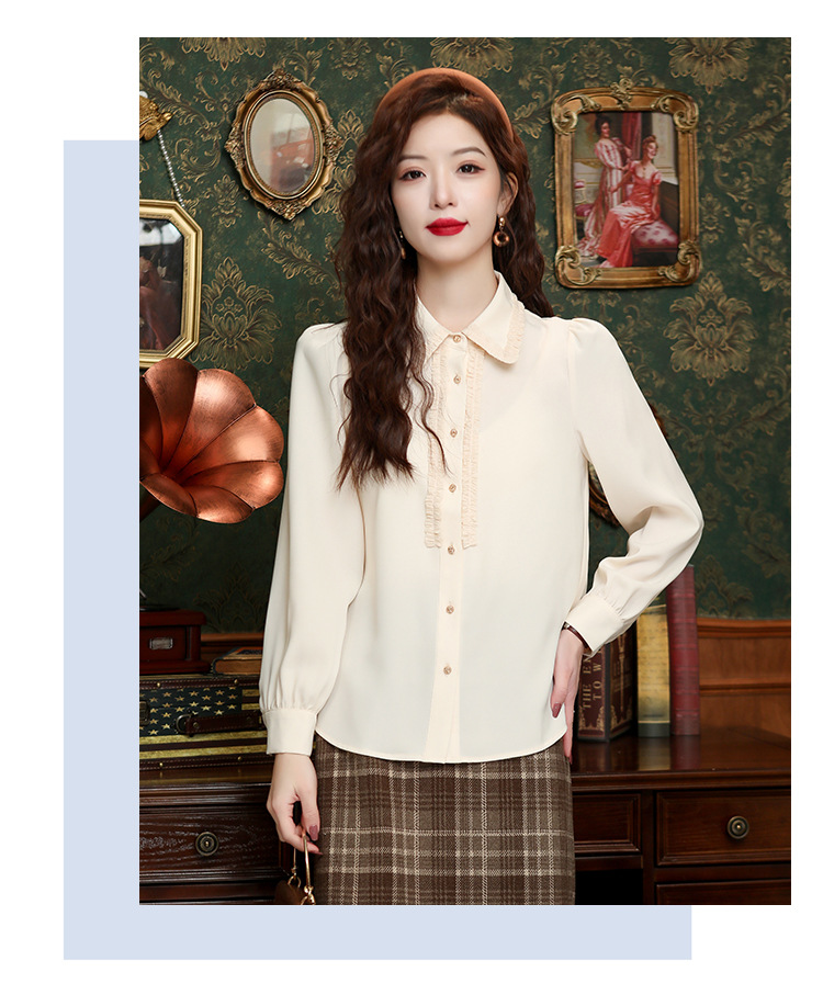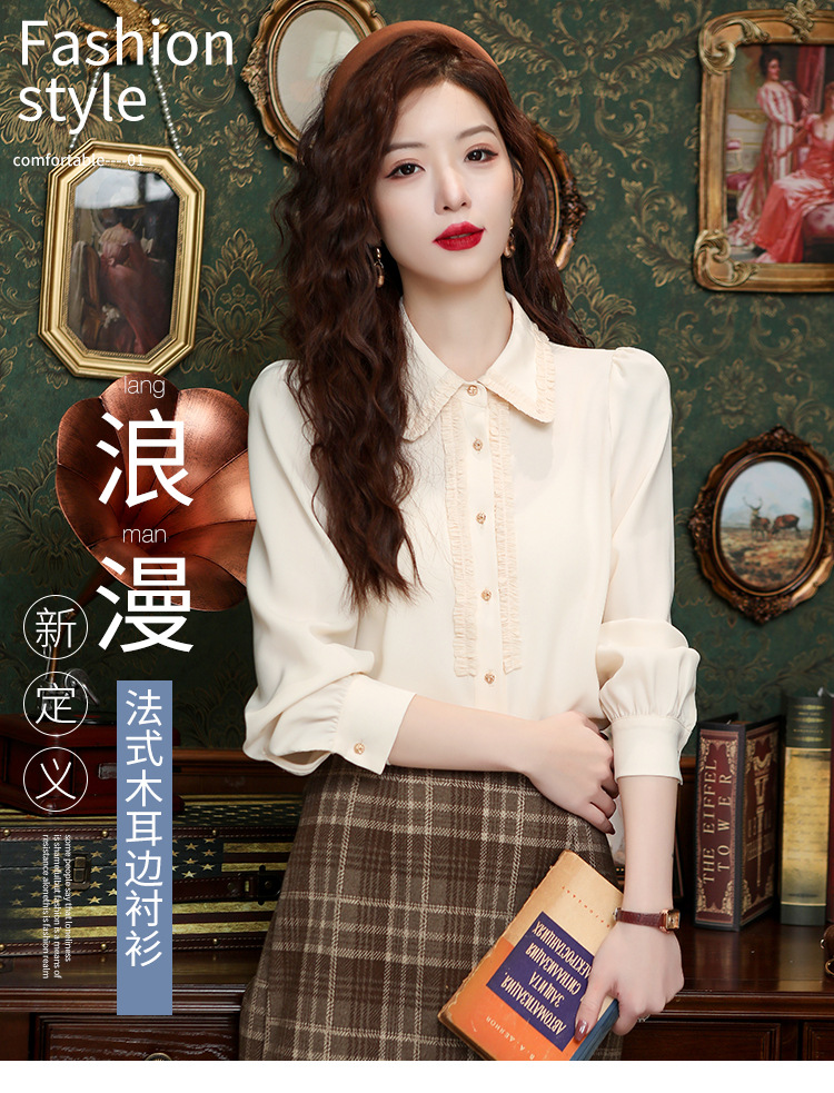 나무 귀 인형 칼라 쉬폰 셔츠 새틴 셔츠 여성 긴 소매 2024 봄과 가을 새로운 OL 기질 작은 셔츠 도매