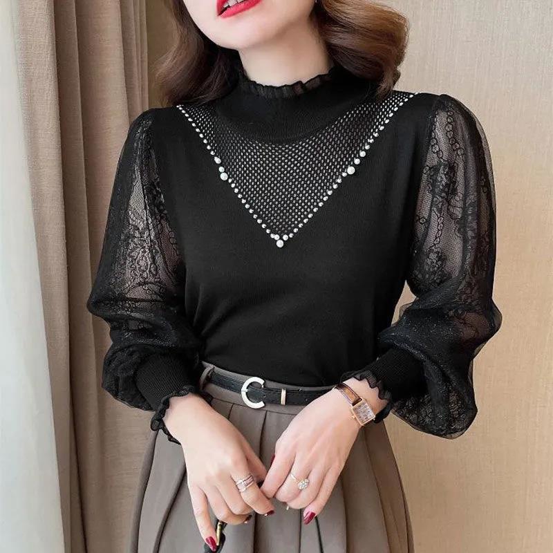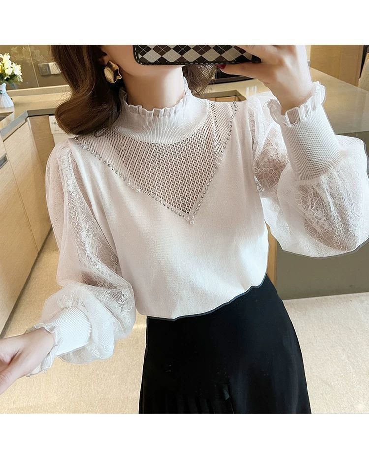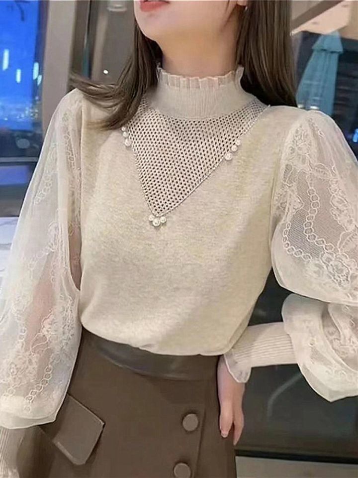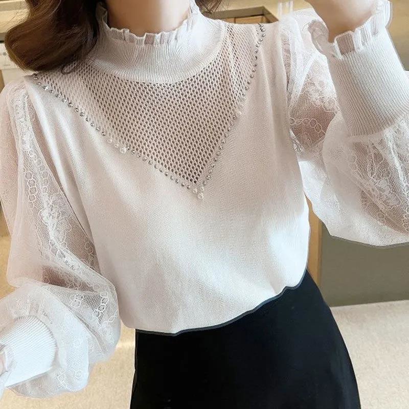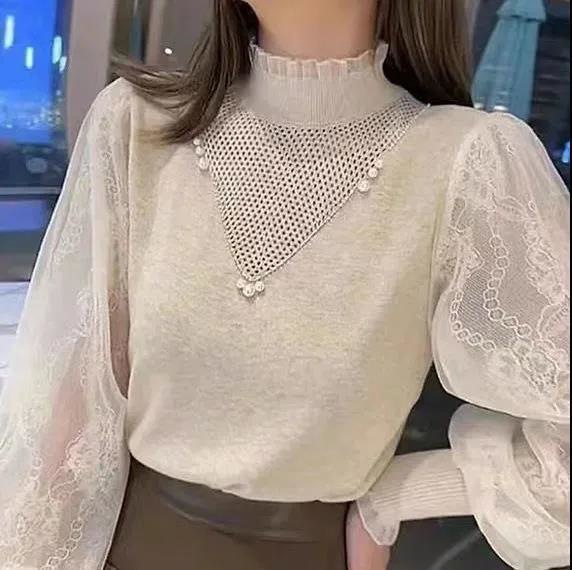 여성 레이스 스티칭 스웨터 2023 봄 새로운 중공 레이스 신중한 기계 기질 느슨한 바닥 상단