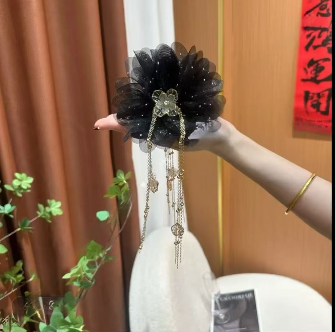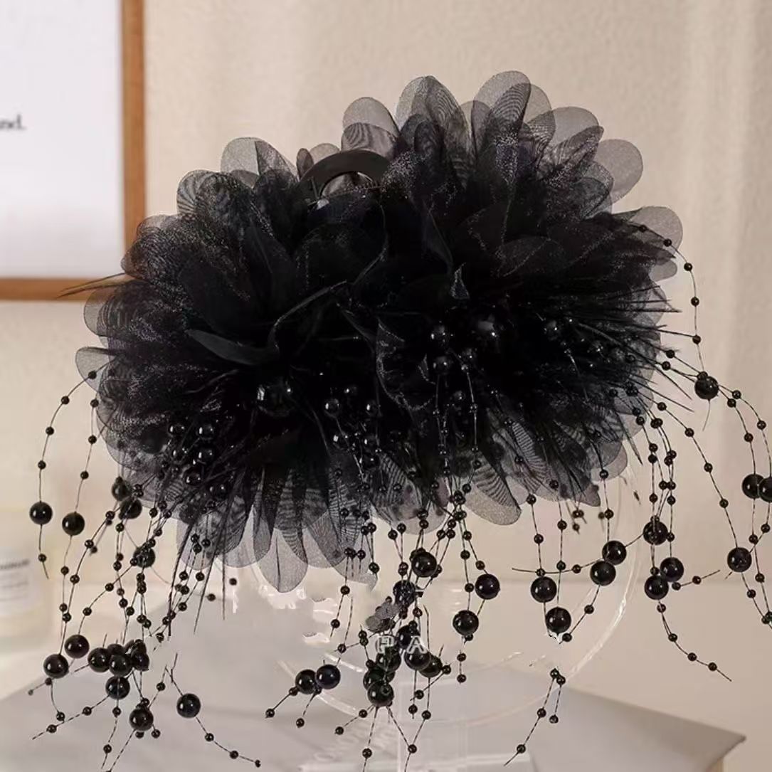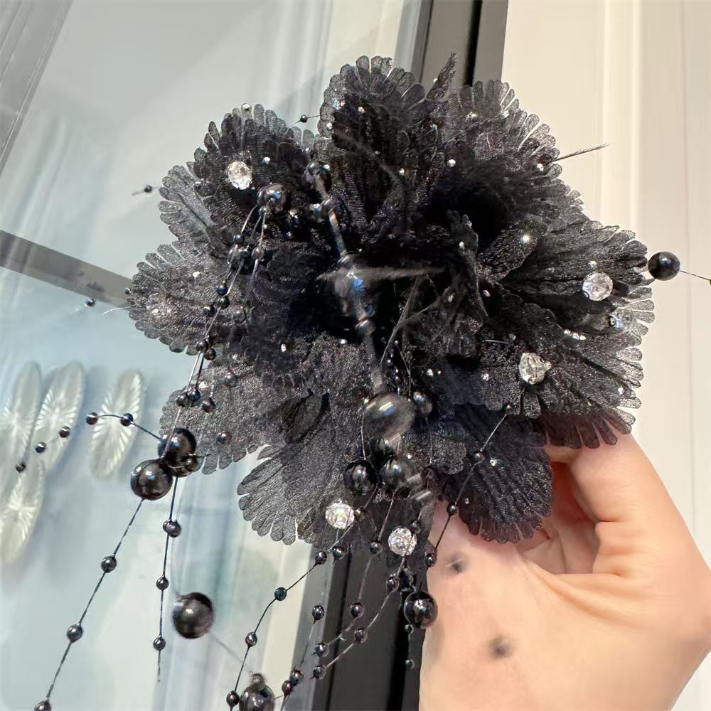 • 검정색 모란꽃 체인 비즈 집게핀