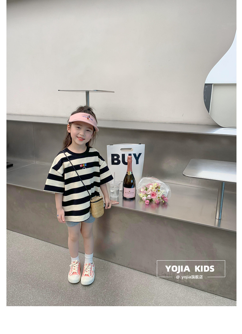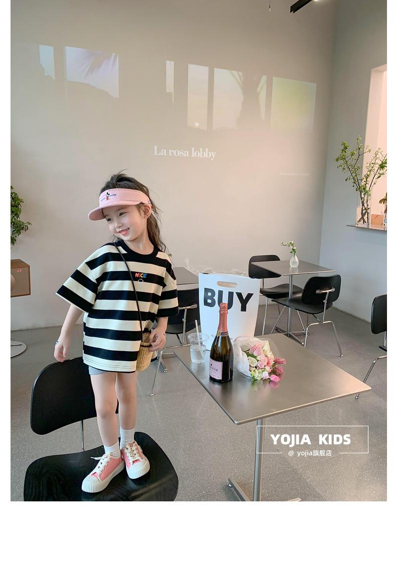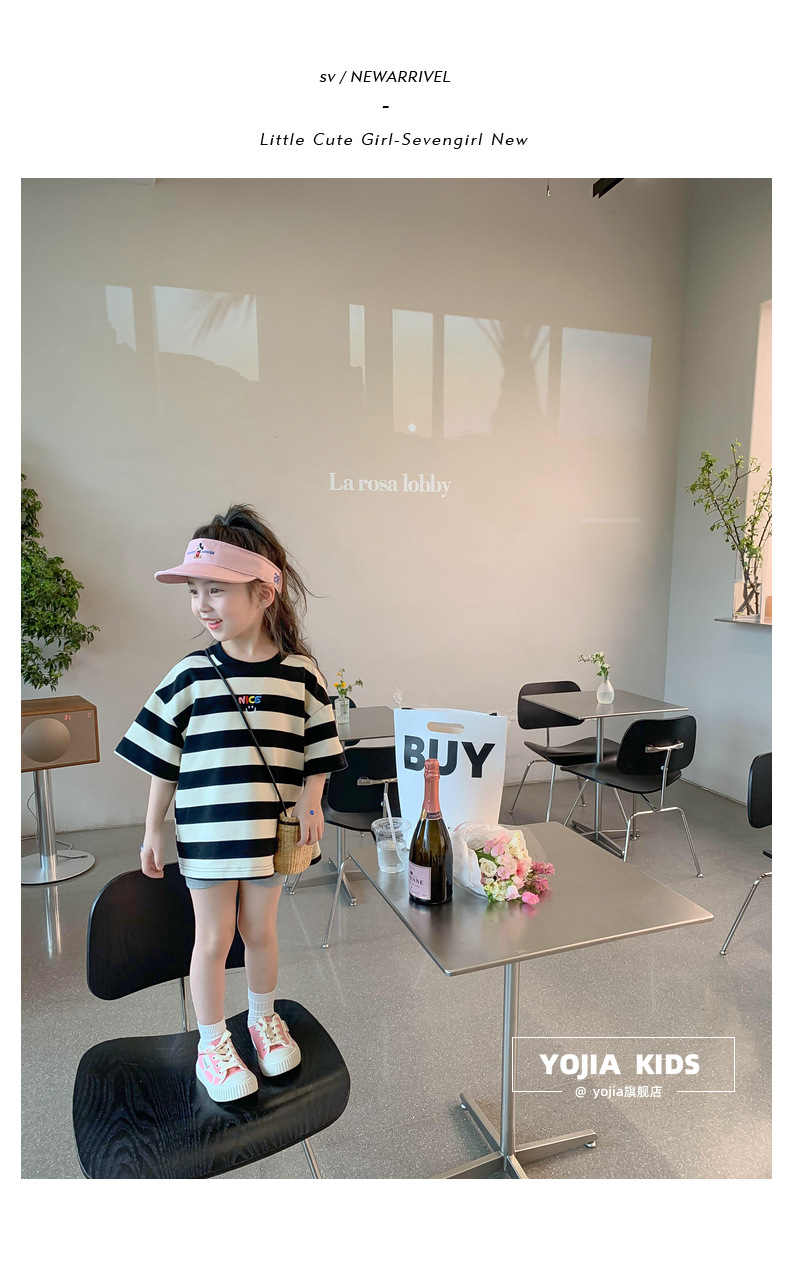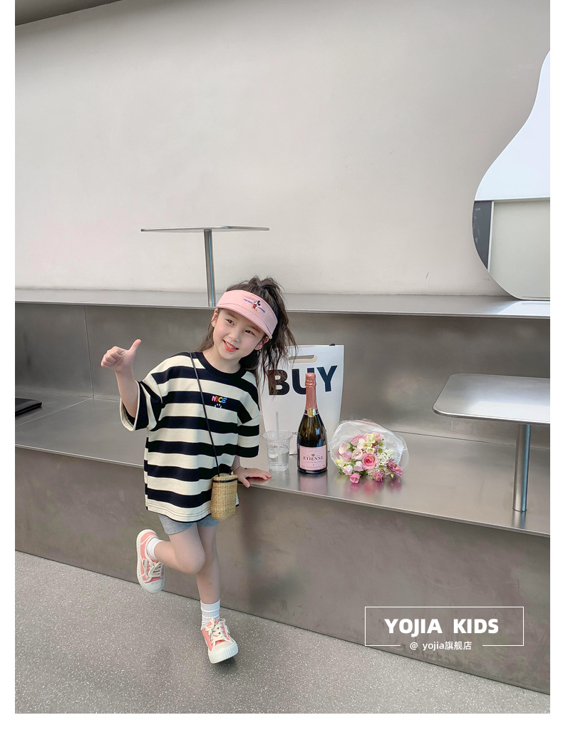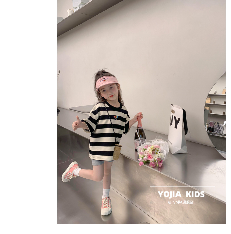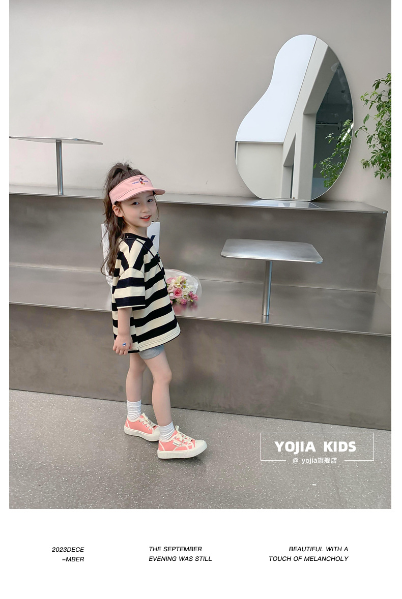 여자 여름 티셔츠 2023 여름 새로운 한국 스타일 여자 줄무늬 반팔 느슨한 어린이 여름 옷 한국 스타일 유행 어린이스토어 가기