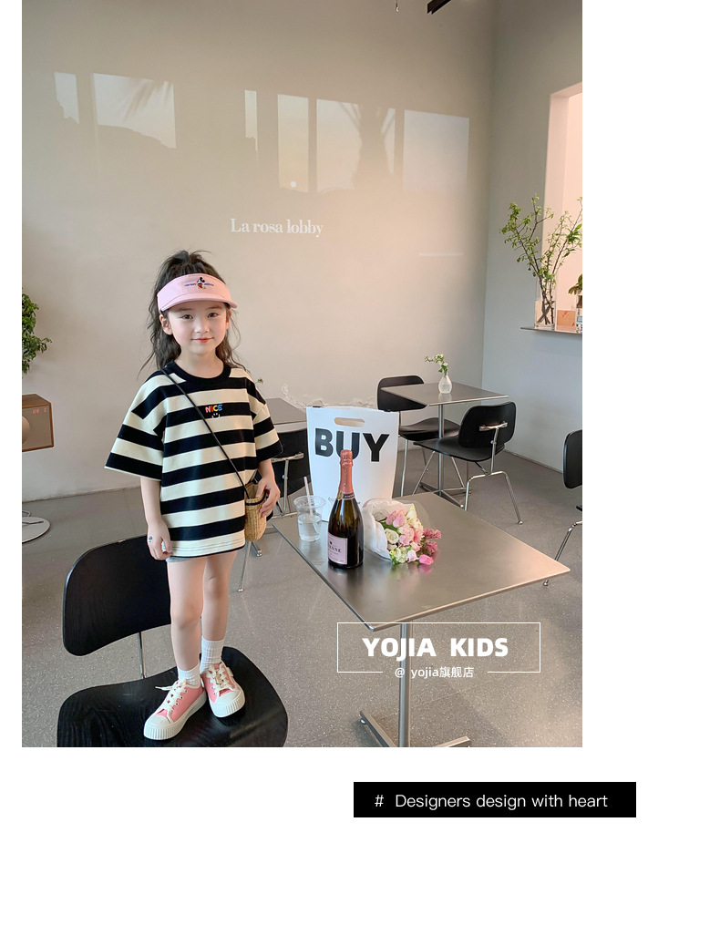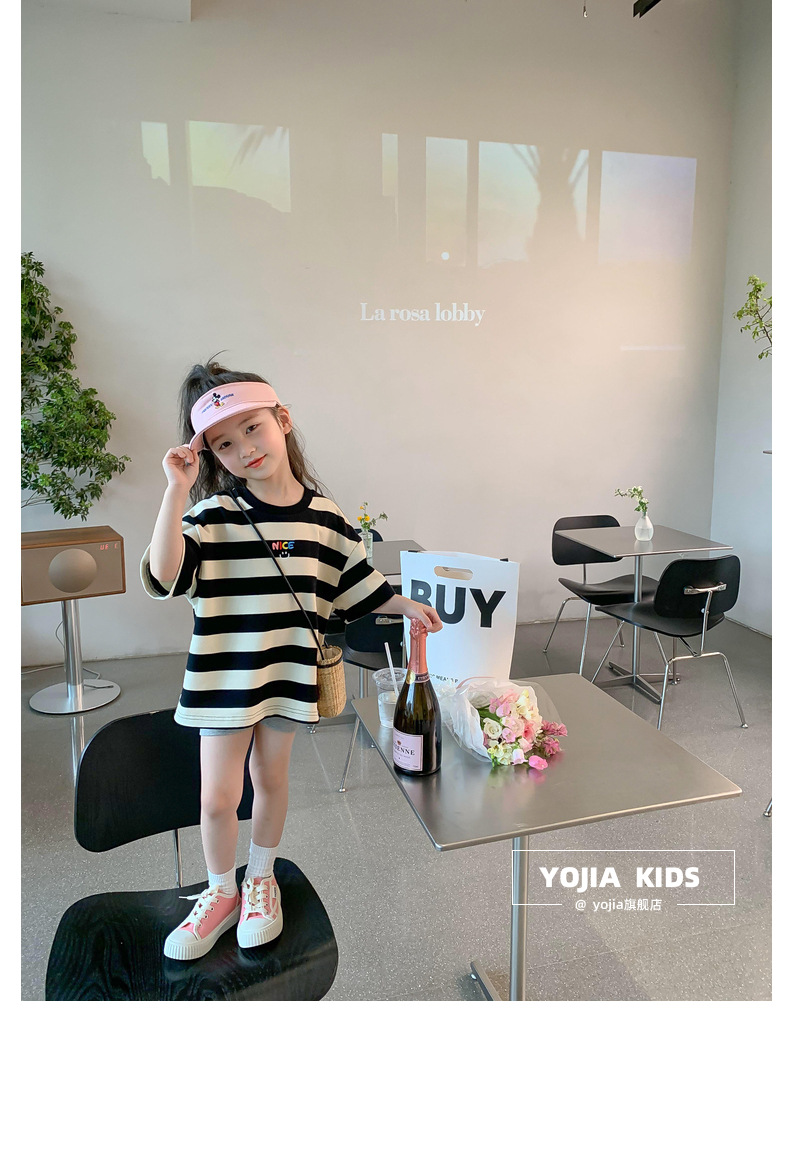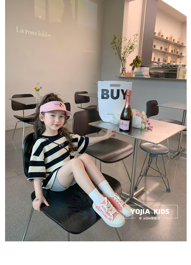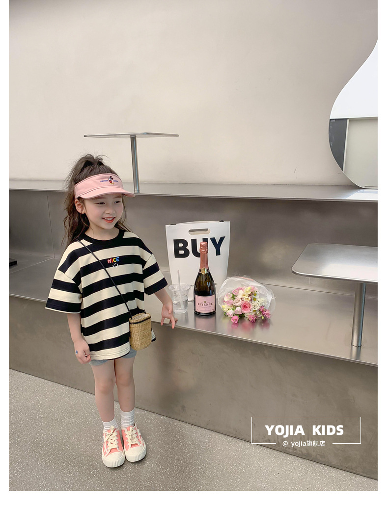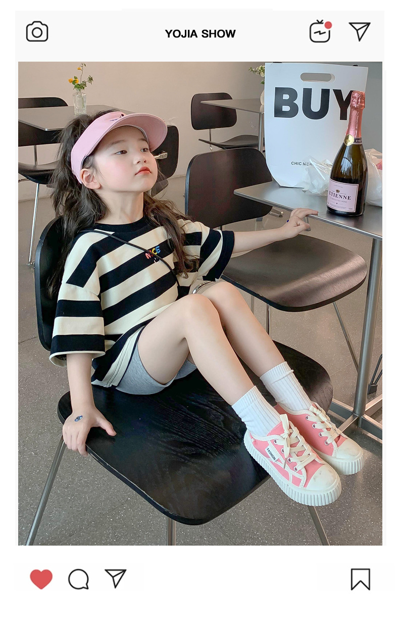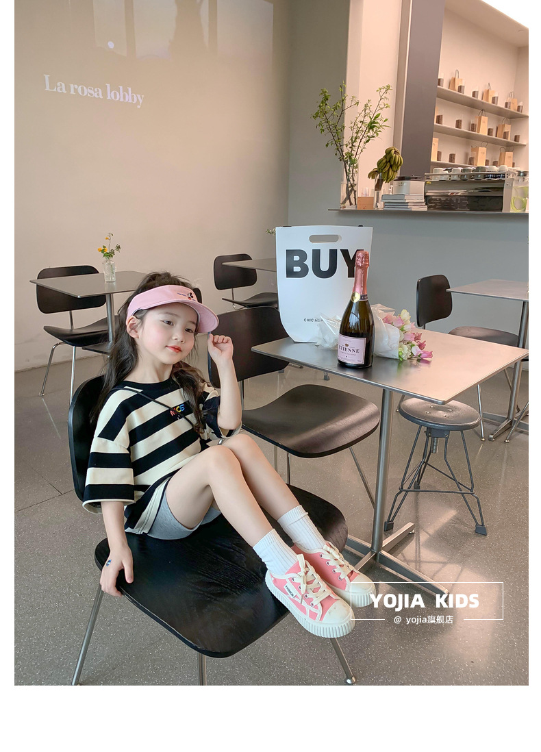여자 여름 티셔츠 2023 여름 새로운 한국 스타일 여자 줄무늬 반팔 느슨한 어린이 여름 옷 한국 스타일 유행 어린이스토어 가기