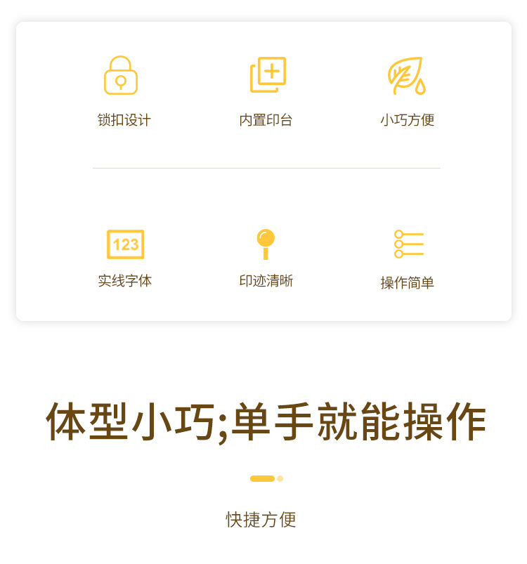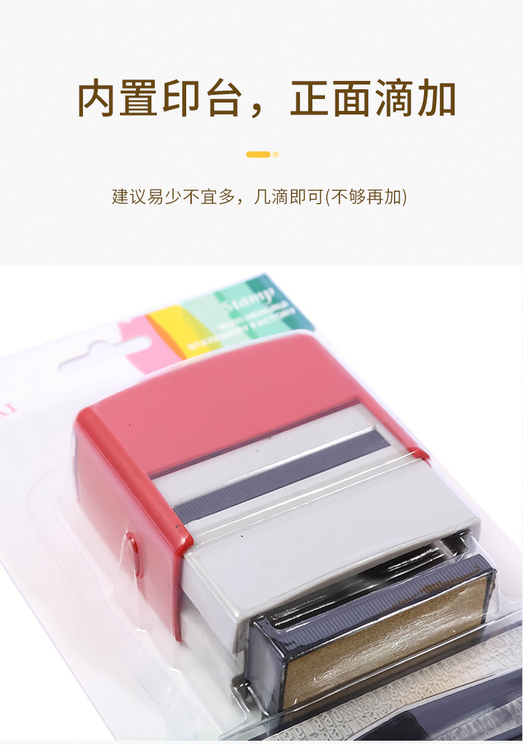 印章:印面尺寸:14*38MM,印章自主回墨使用方面,盖章清晰,字粒可随意更换。