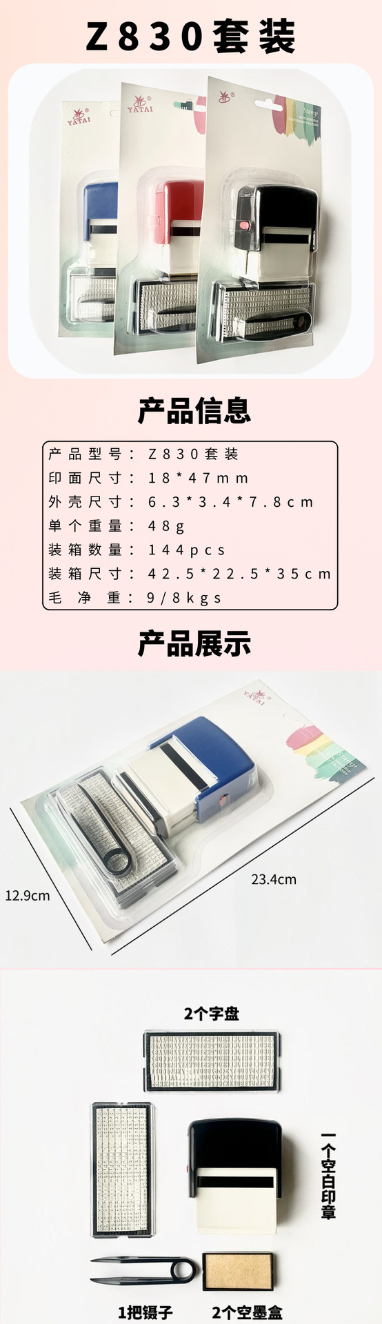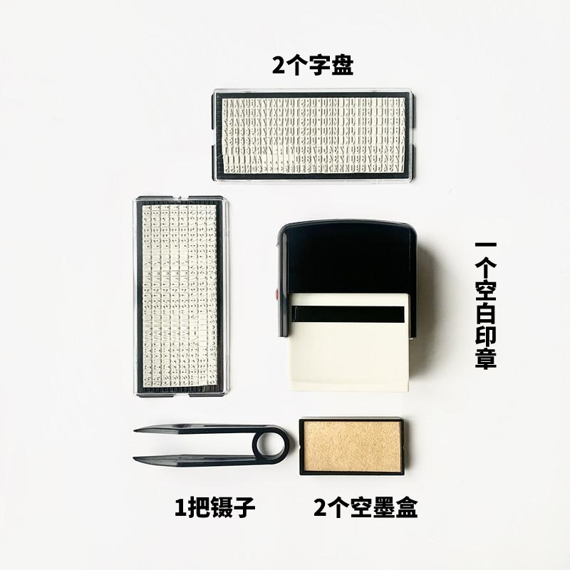 套装组合中包含一个印章,1个墨盒,1合字盘以及一把镊子