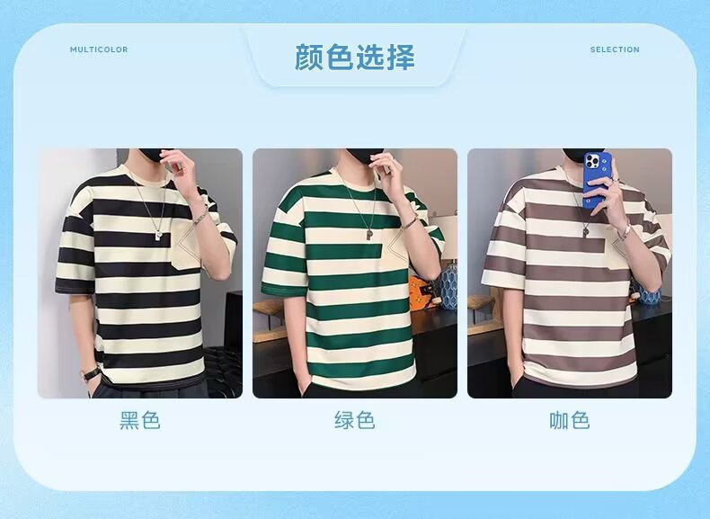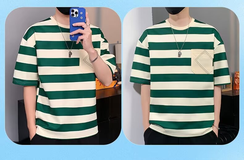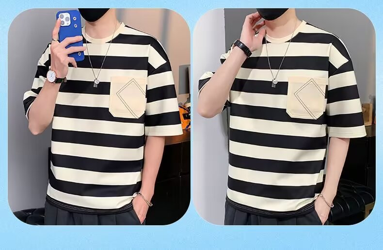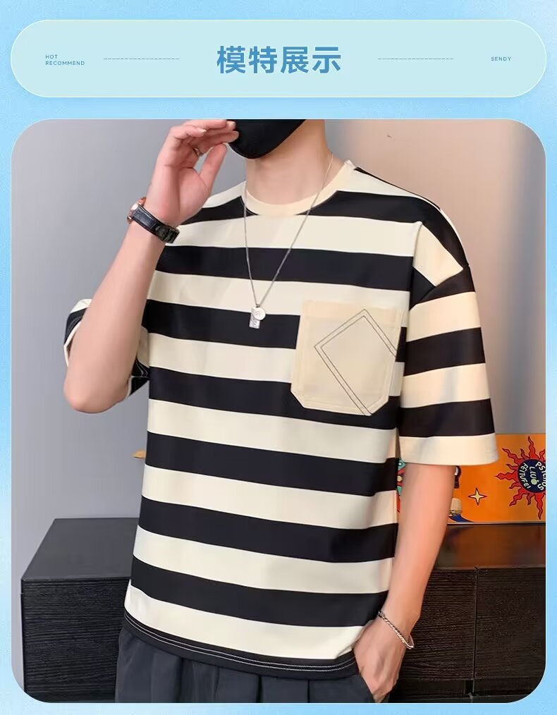 반팔 남성 여름 새 줄무늬 티셔츠 남성 트렌디 한 느슨한 패션 브랜드 홍콩 스타일 청소년 학생 둥근 목 남성 티셔츠스토어 가기