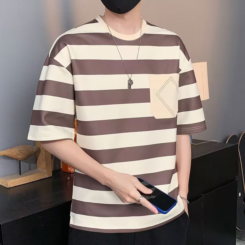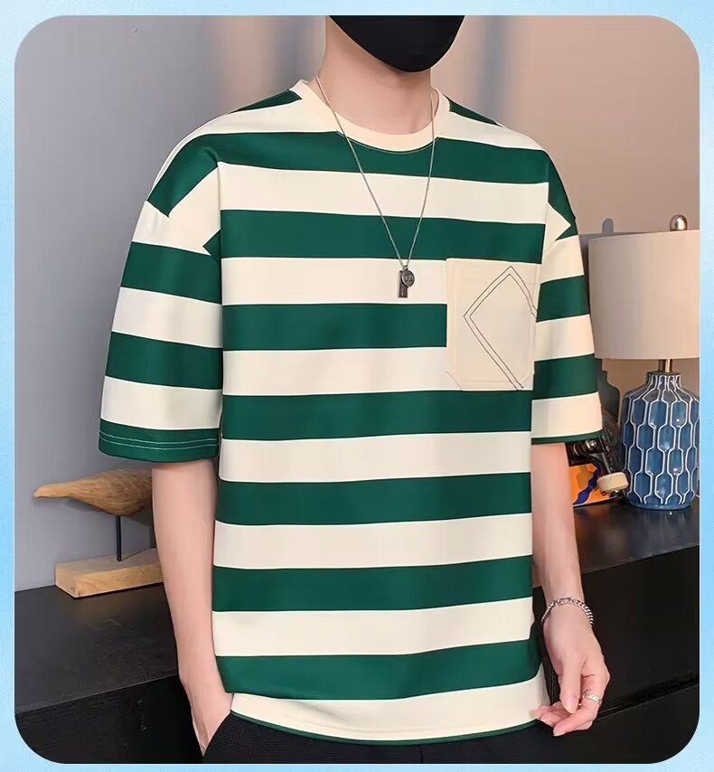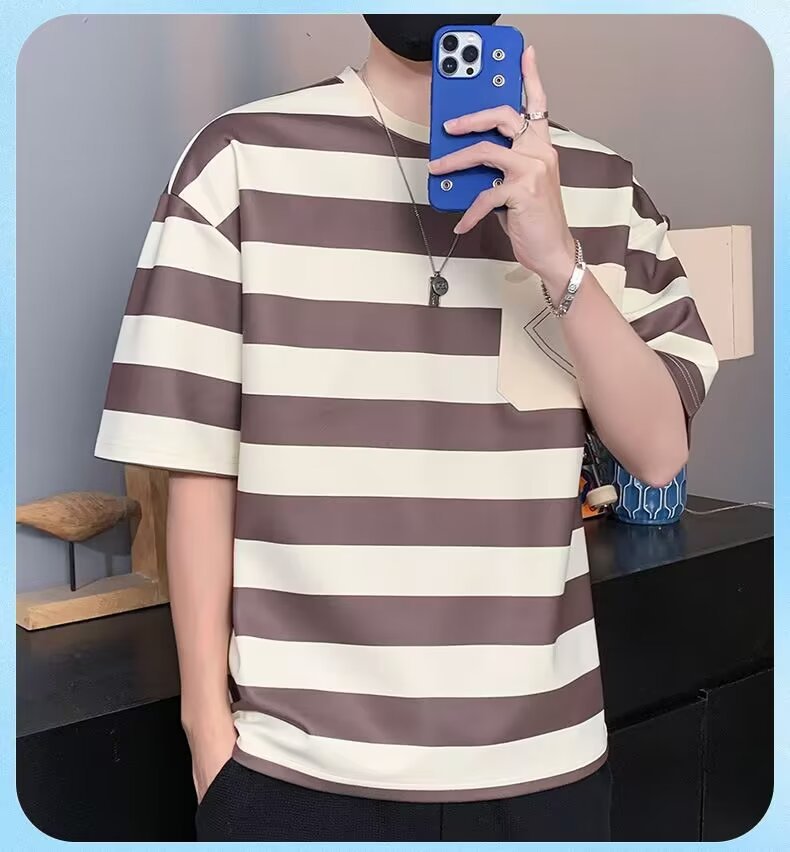 반팔 남성 여름 새 줄무늬 티셔츠 남성 트렌디 한 느슨한 패션 브랜드 홍콩 스타일 청소년 학생 둥근 목 남성 티셔츠