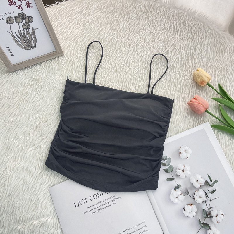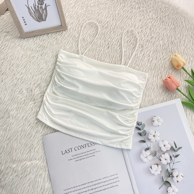 한국 스타일 인 스타일 핫 걸 아이스 실크 슬링 가슴 패드가 달린 주름진 백 조끼 가슴 겉옷 바닥 짧은 탑스토어 가기