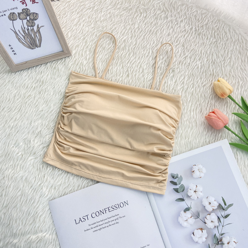 한국 스타일 인 스타일 핫 걸 아이스 실크 슬링 가슴 패드가 달린 주름진 백 조끼 가슴 겉옷 바닥 짧은 탑