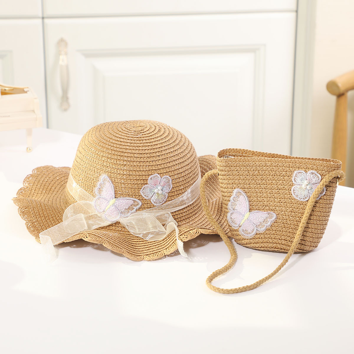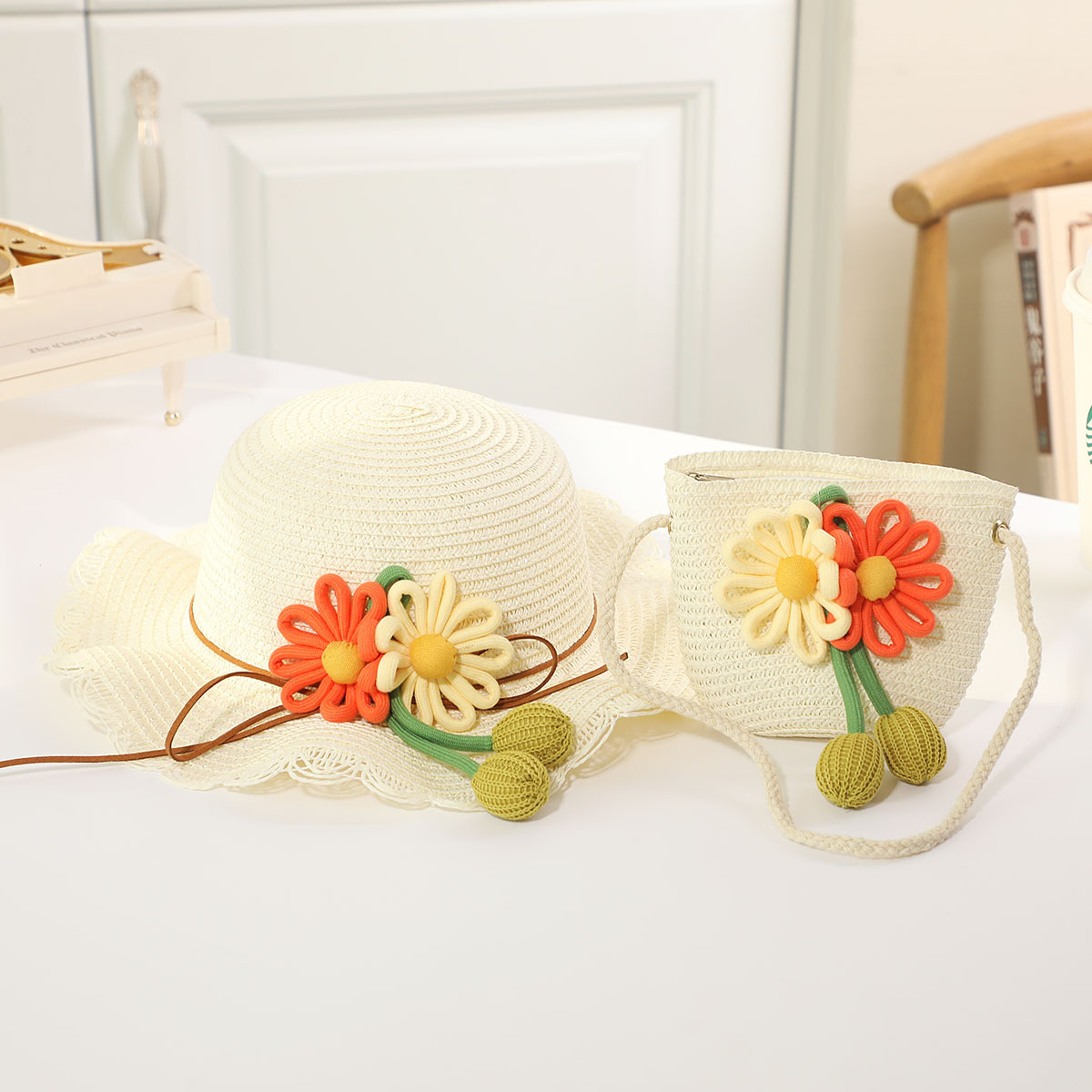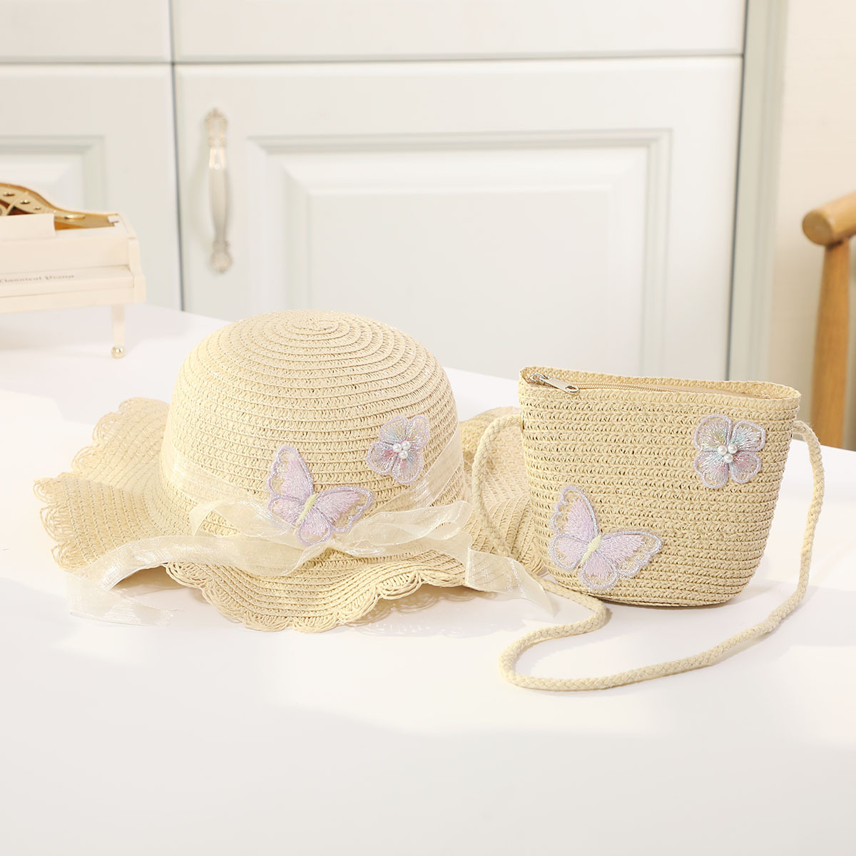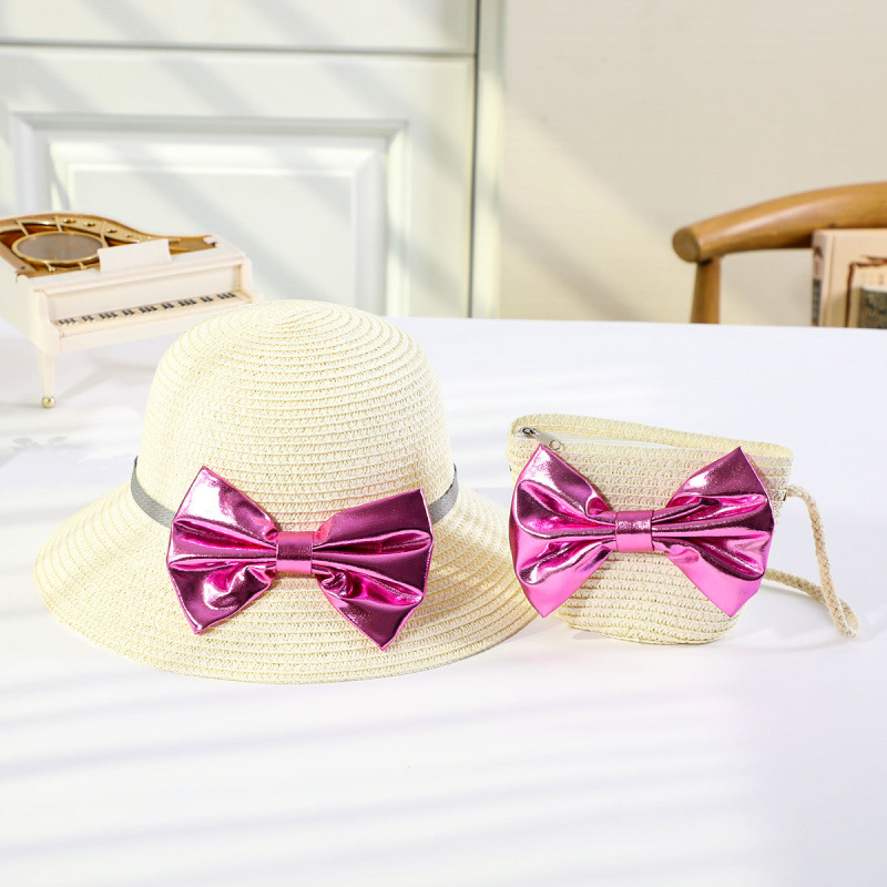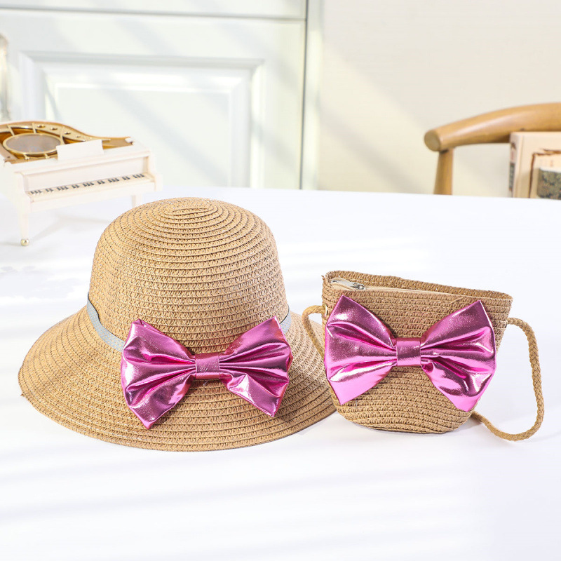 인터넷 유명 인사 여름 태양 보호 해변 밀짚 모자 어린이 크로스 바디 동전 지갑 태양 보호 밀짚 모자 + 가방 세트 국경 배달스토어 가기