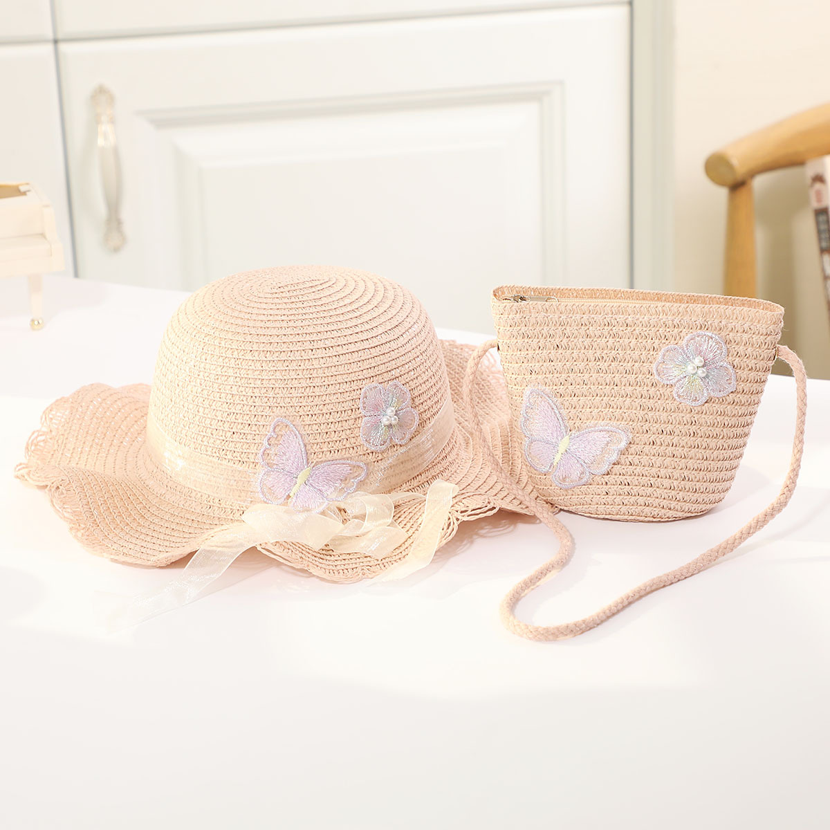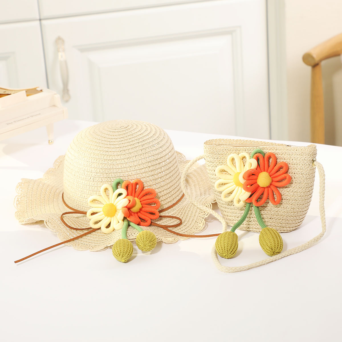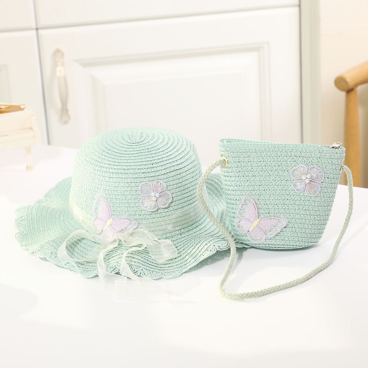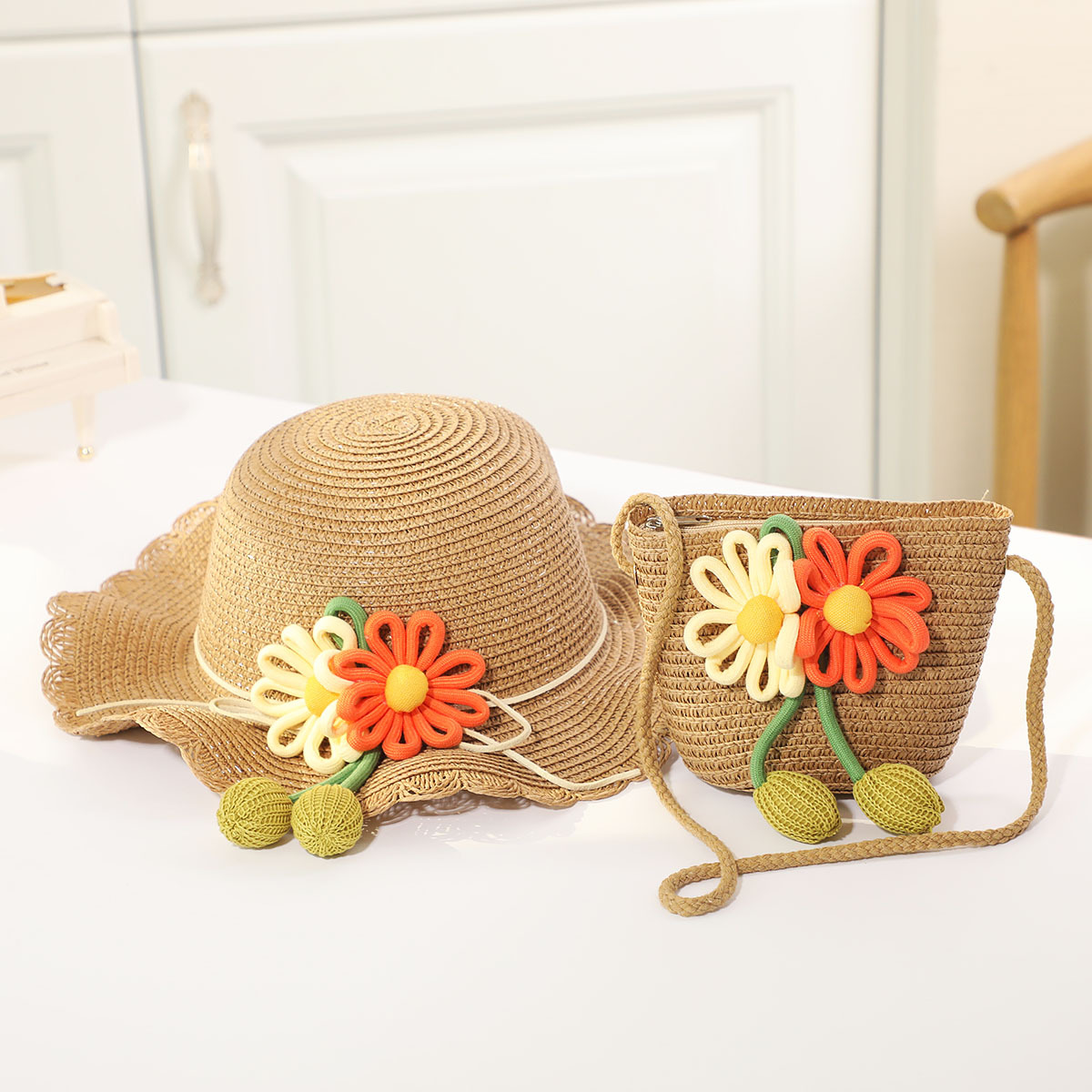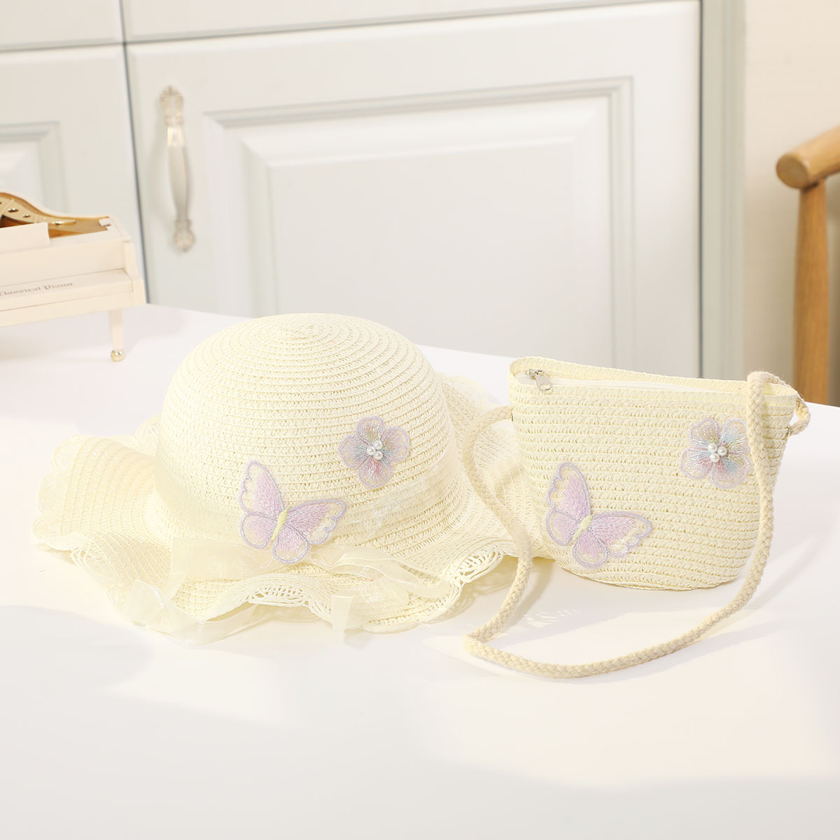 인터넷 유명 인사 여름 태양 보호 해변 밀짚 모자 어린이 크로스 바디 동전 지갑 태양 보호 밀짚 모자 + 가방 세트 국경 배달스토어 가기