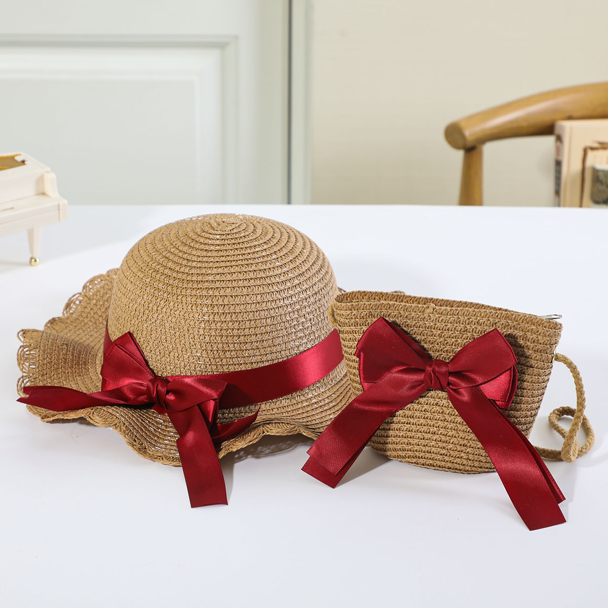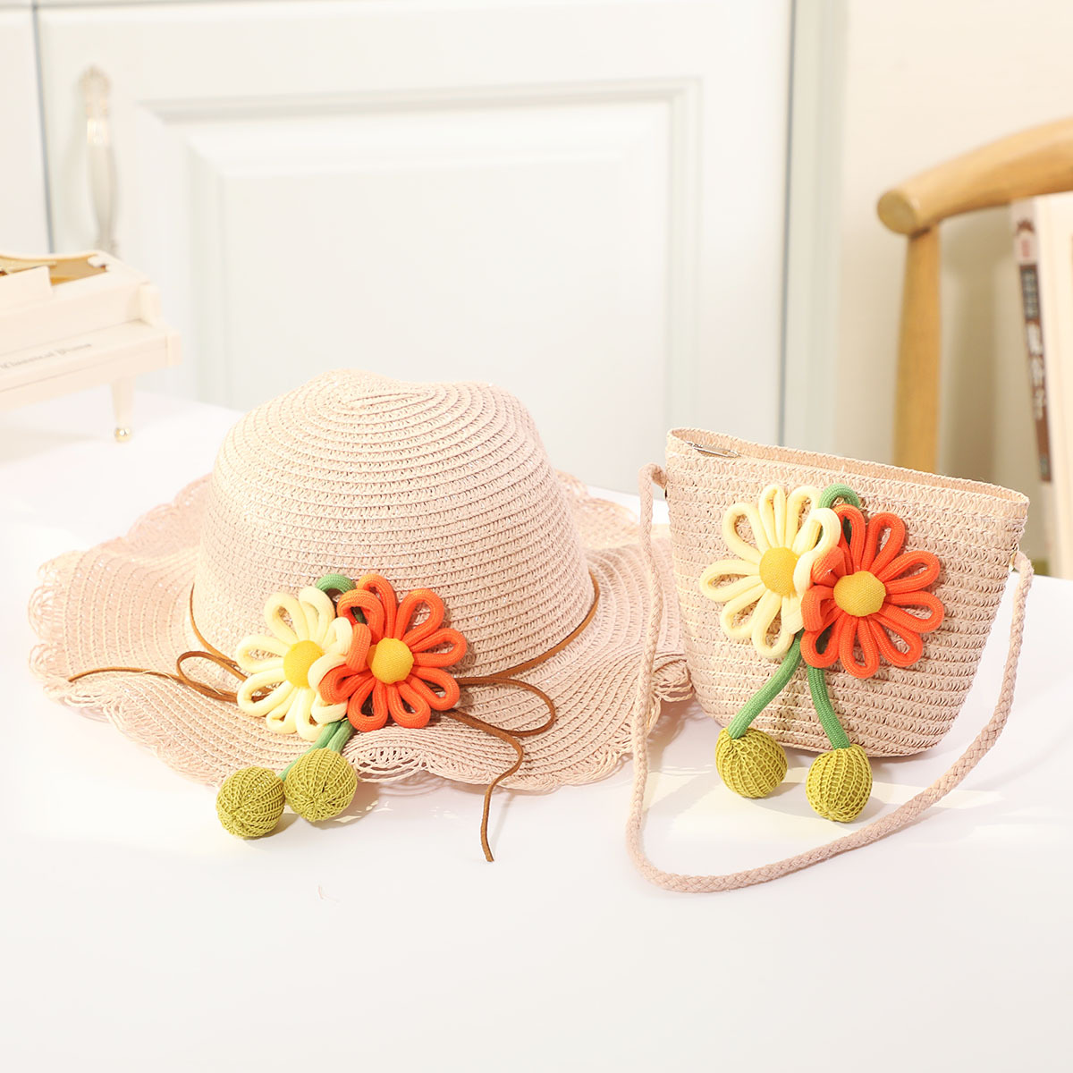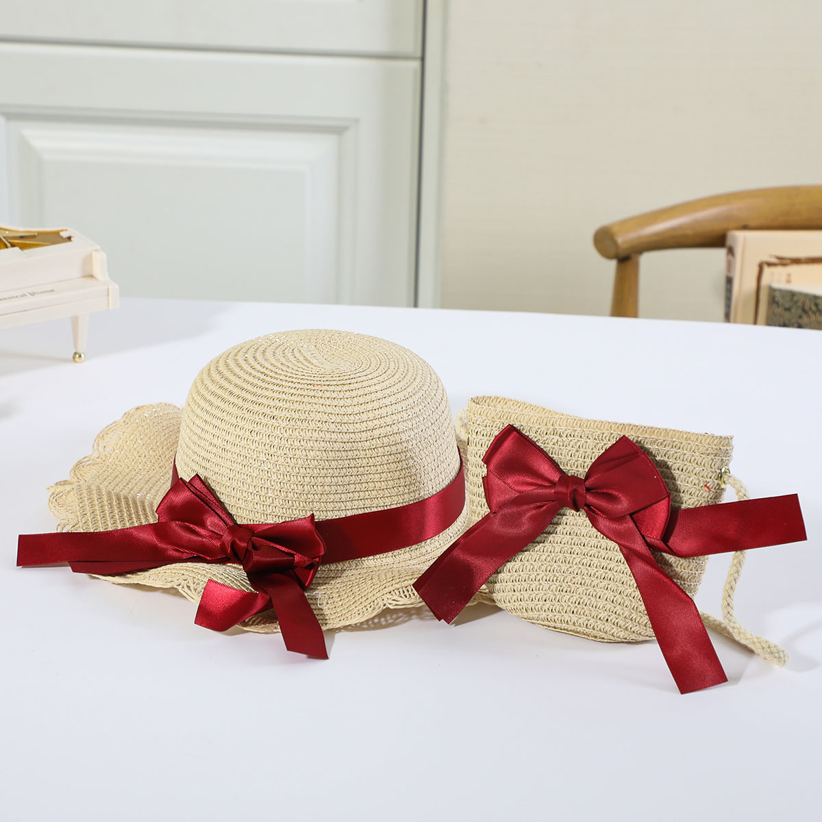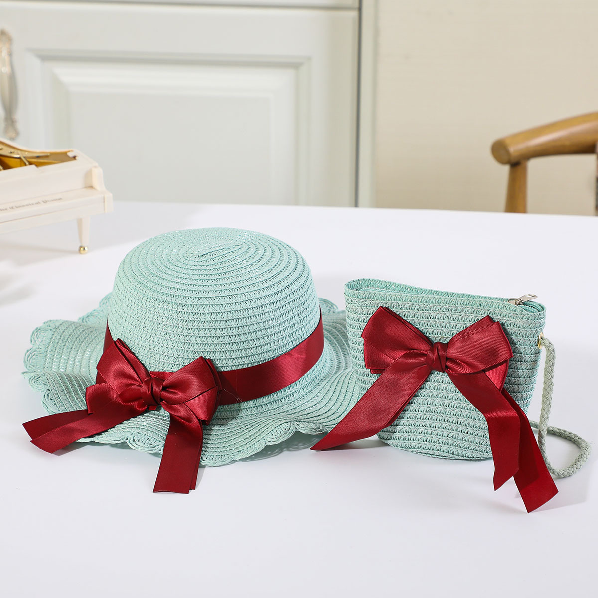 인터넷 유명 인사 여름 태양 보호 해변 밀짚 모자 어린이 크로스 바디 동전 지갑 태양 보호 밀짚 모자 + 가방 세트 국경 배달스토어 가기