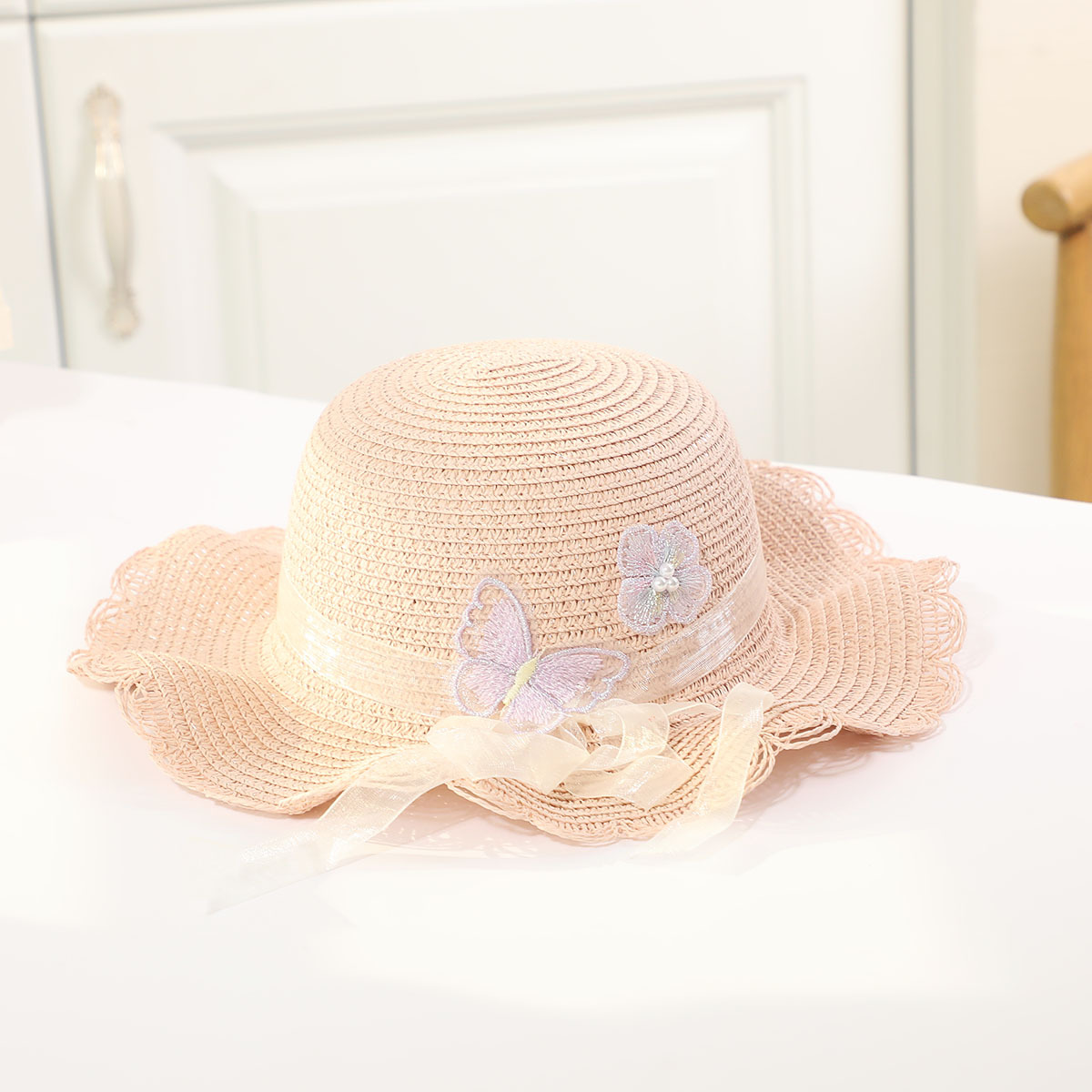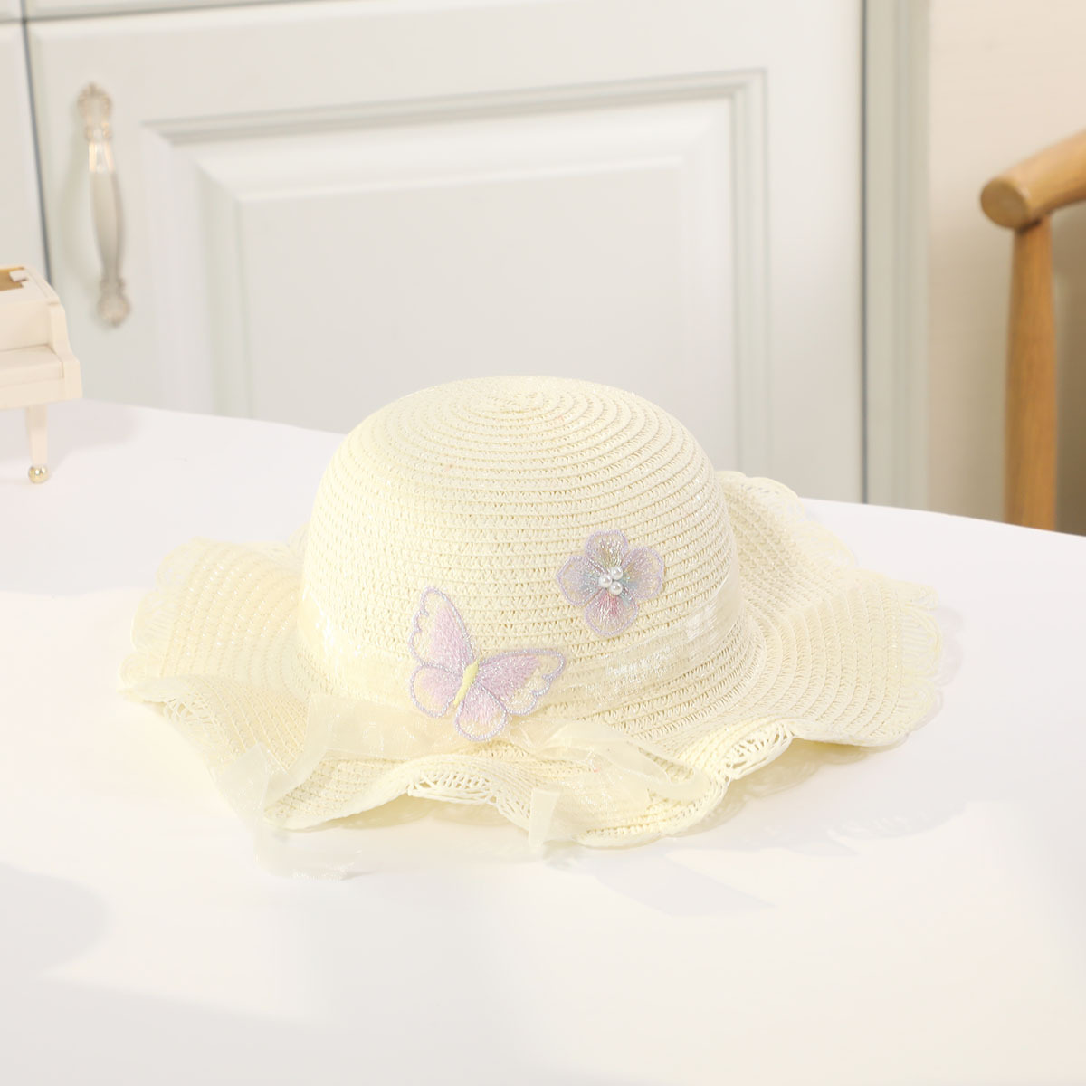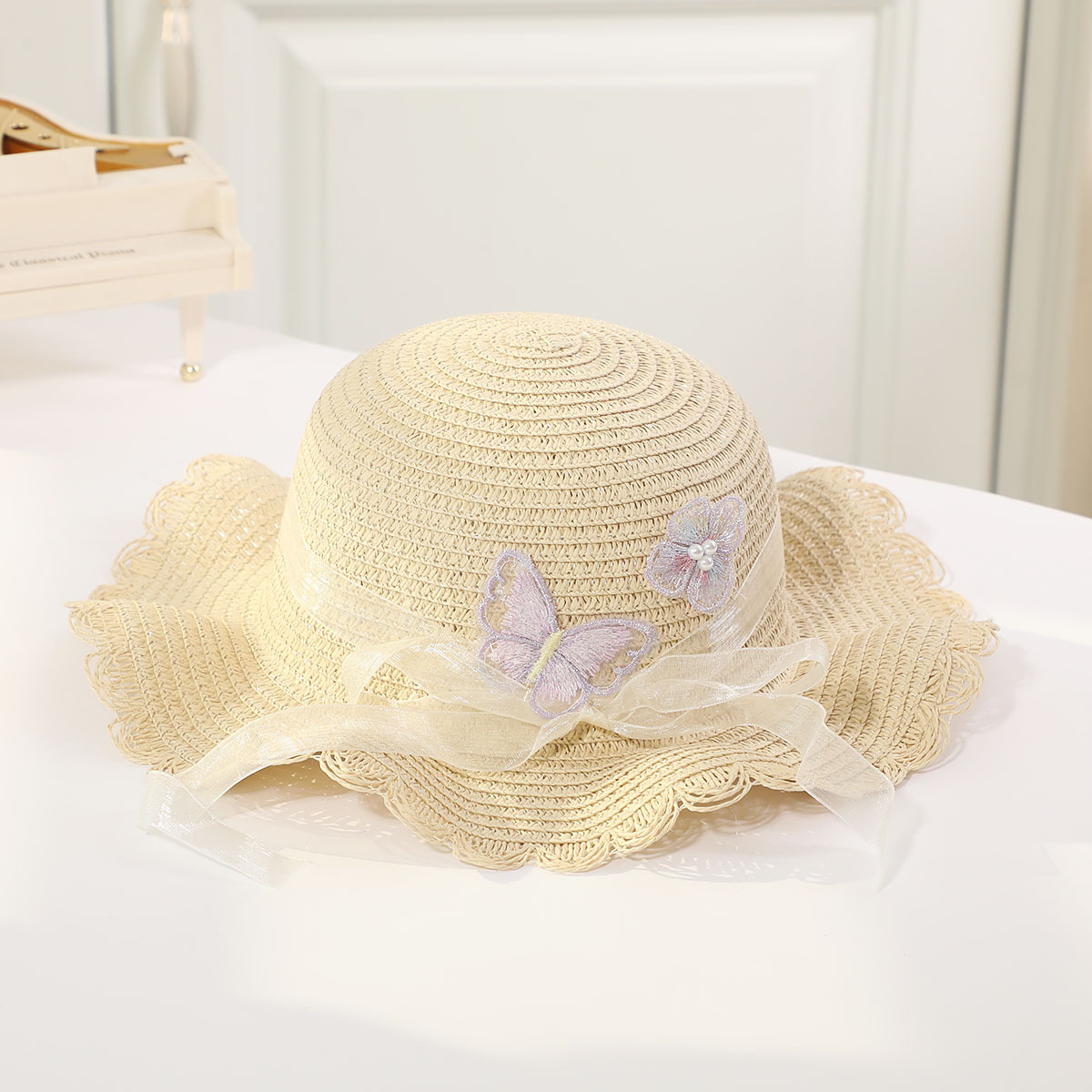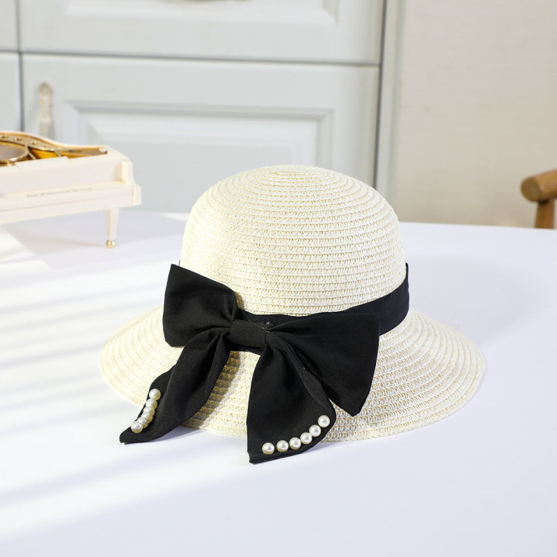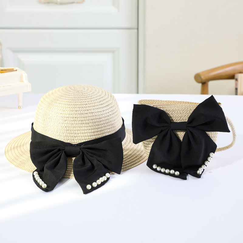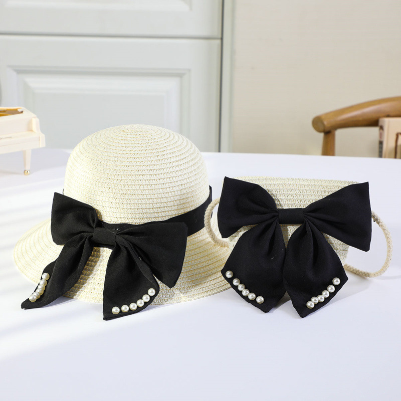 • 진주 검은 나비 분지 모자 세트 베이지