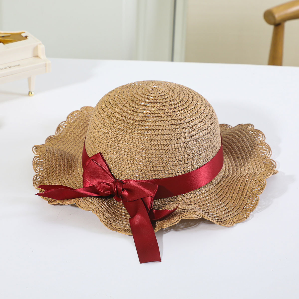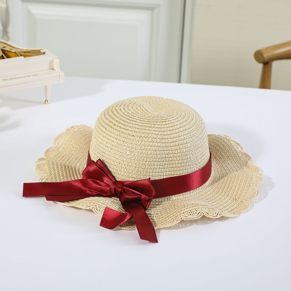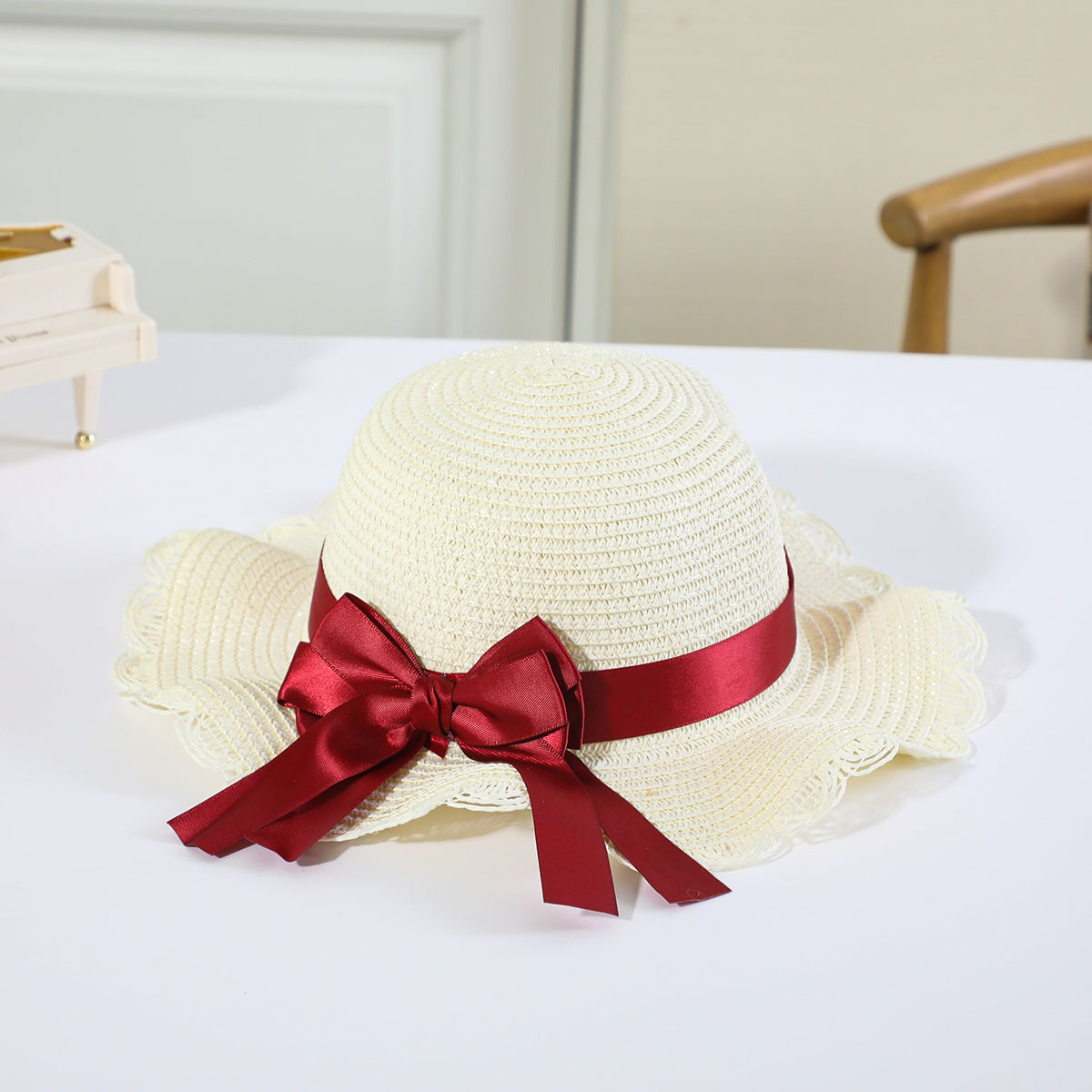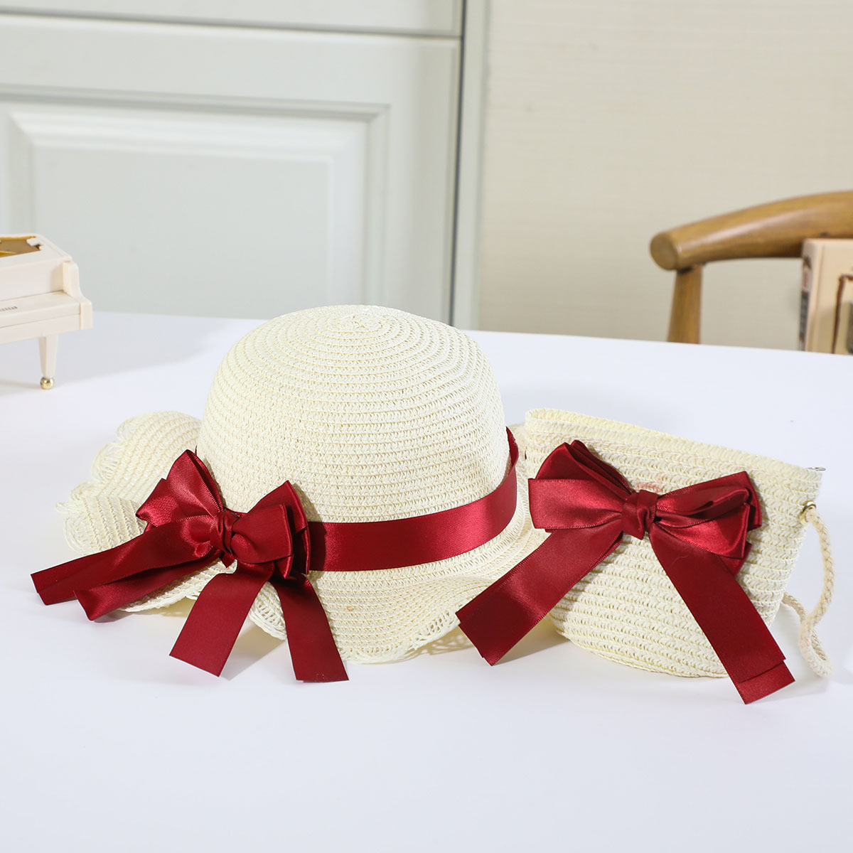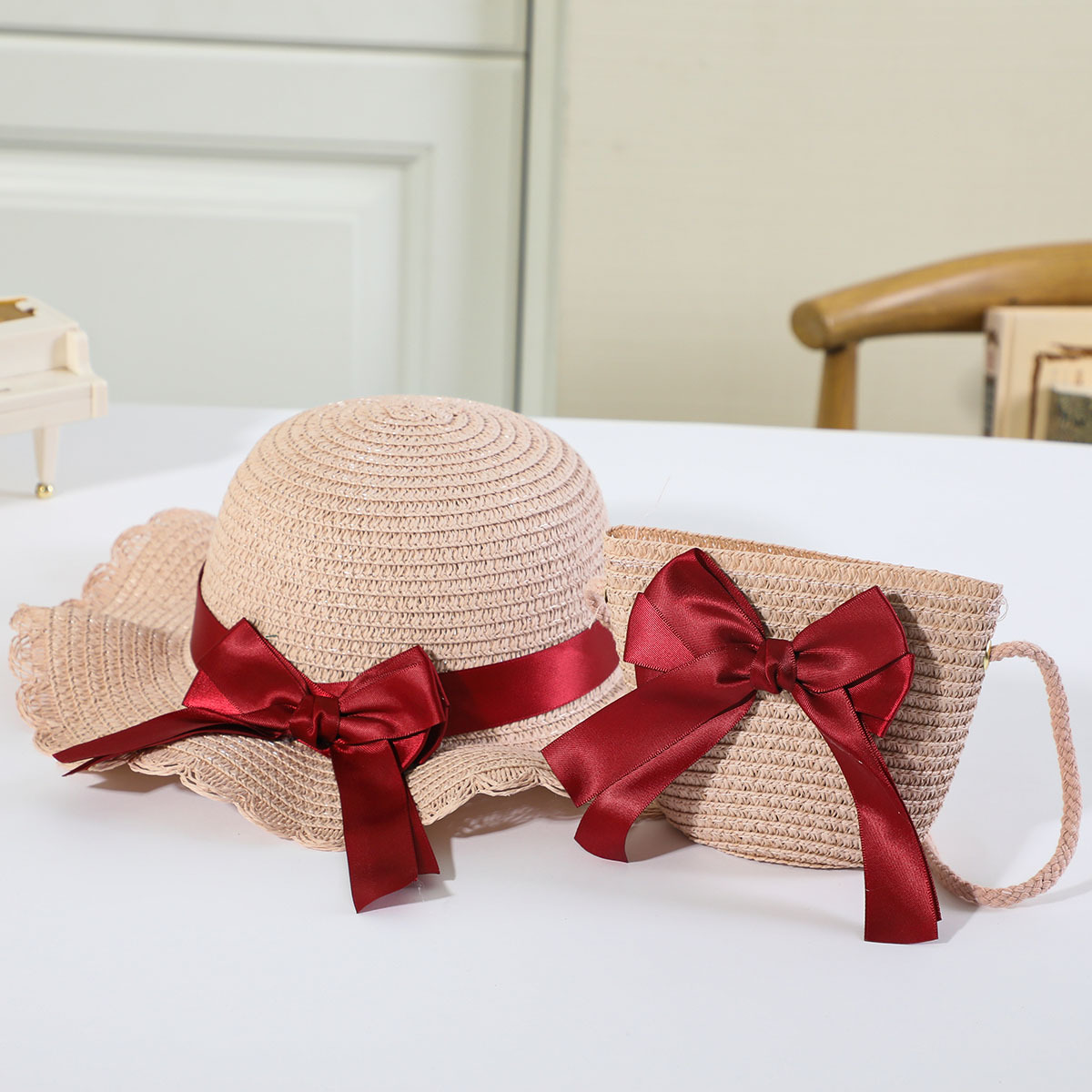 • 로즈 레드 나비 매듭 분지 모자 세트 베이지
