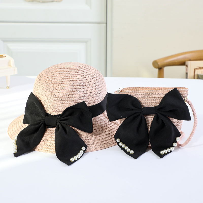 • 진주 검은 나비 분지 모자 세트 핑크