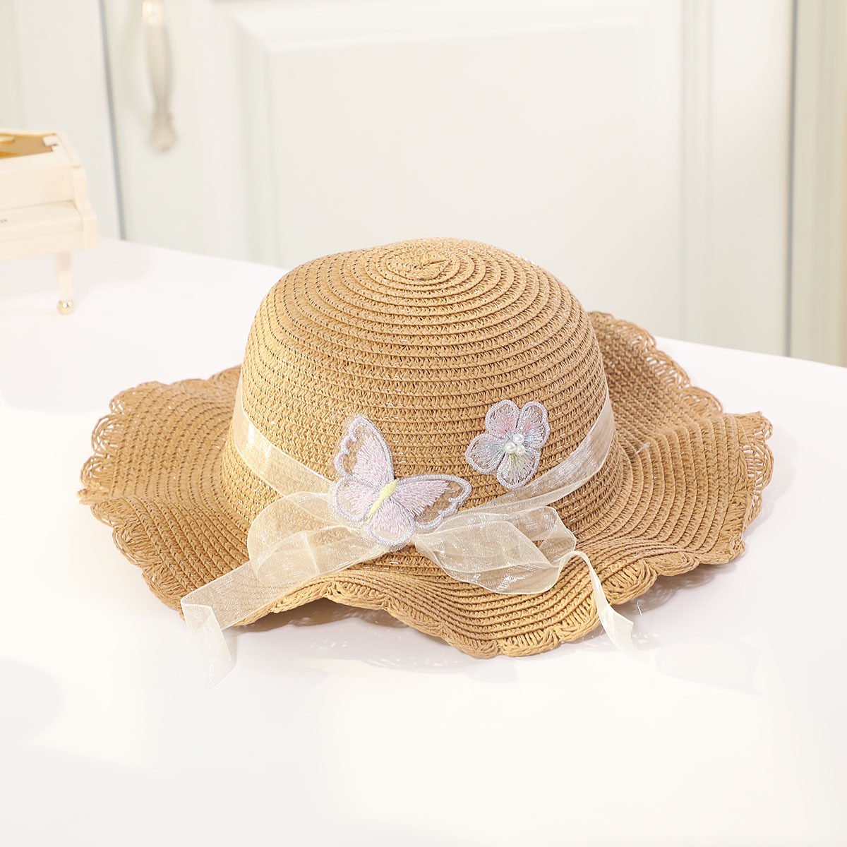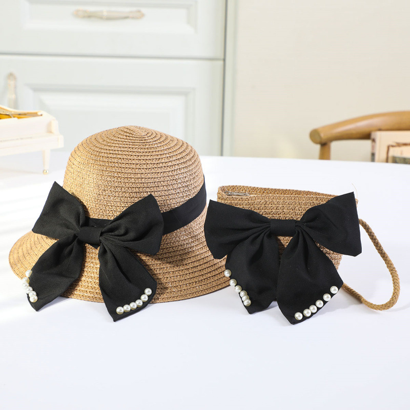 • 진주 검은 나비 분지 모자 세트 다크 브라운