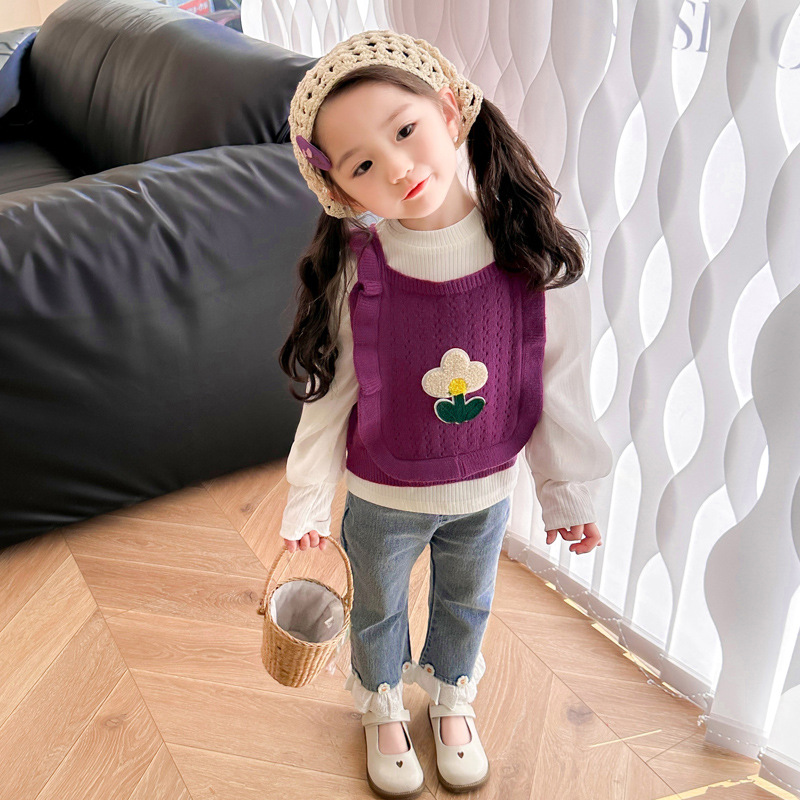 2024 새로운 아동복 봄 메쉬 스웨터 유아 소녀 봄 옷 3 피스 어린이 세트 배달